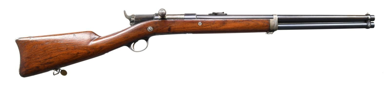 Cal. 45/70. S# 22. Bbl. 20 1/2" round. Blade front sight w/ graduated leaf rear sight. Full length mag. w/ loading port forward of trigger guard. Single shot turn bolt action w/ exposed hammer. Walnut stock w/ case colored nose cap & steel buttplate having sling swivels. Rear sling swivel has attached museum style brass tag no. 162. Back of tag is stamped "WH". Estimated total of 5,000 mfg. 1880-83. CONDITION: bbl. & action retain over 80% lightly faded blue showing blue loss on trigger guard bow. Forearm & buttplate have some lightly visible case colors remaining. Roughly refinished stock showing scratches & marks. Very good bright bore. (01-24862/DS). ANTIQUE. $3,000-5,000.