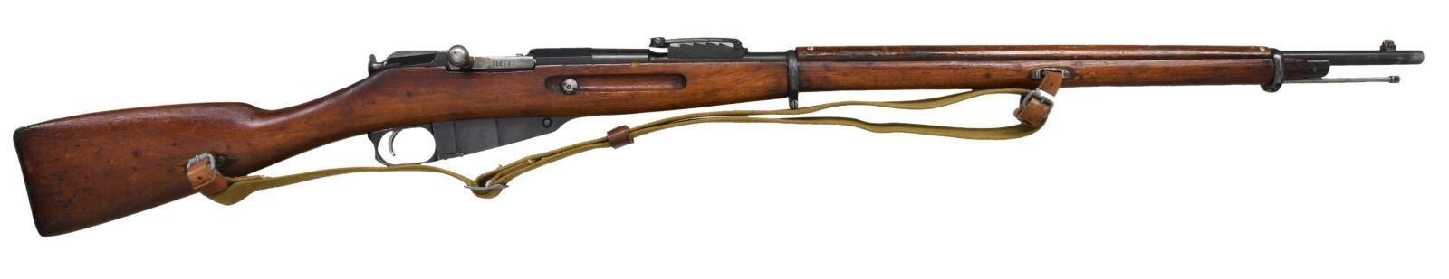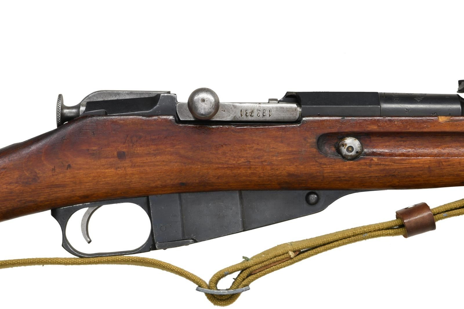 Cal. 7.62x54R. S# 203169F. Bbl. 31 1/2" w/ import marking. Balkan rework w/ matching numbers on floorplate & buttplate. Mismatched bolt. Top of bbl. has scrubbed Czarist eagle, Remington markings, 1917 date & arsenal renumbered serial. Ladder rear sight graduated to 3200 Arshins. Blade front sight. European hardwood stock w/ sling slots & canvas Com-Bloc style sling. Cleaning rod present. CONDITION: stock set has arsenal rework finish w/ scattered flaking, handling marks & dings. Metal retains 90% arsenal rework blue w/ a small patch of light pitting on left side of mag, some edge wear & a few scratches. Fair bore w/ scattered frosting & light pitting. (23-1907/MJC). CURIO. $200-300.