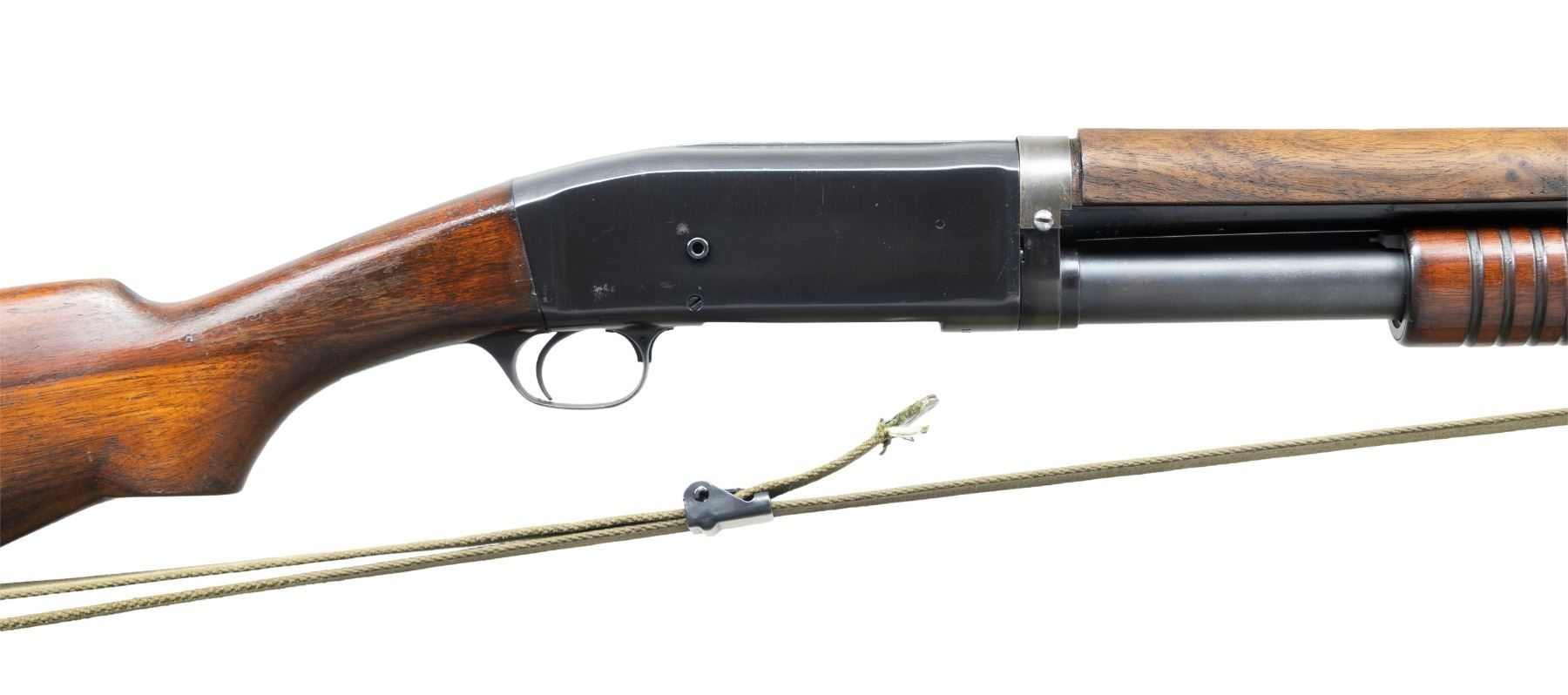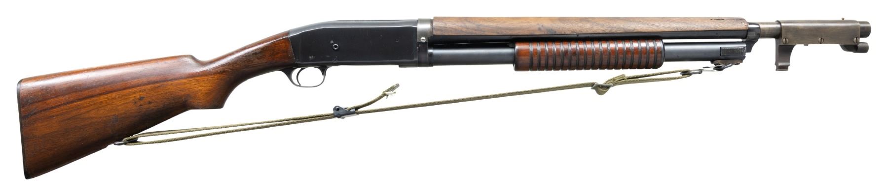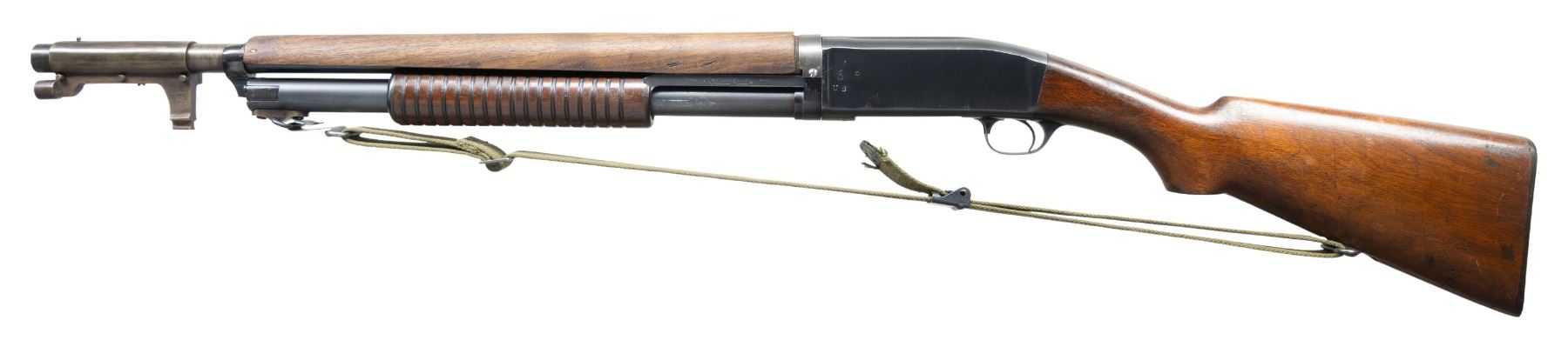 SHOTGUN. Cal. 12 GA. S# 136929. "COMBAT SHOTGUNS" by Canfield notes that the serial number range for military issued Model 10 shotguns falls between 117731 and 165566. The Model 10 was a bottom eject hammerless design first introduced in 1908. During World War I the U.S. military issued the Model 10 trench guns in smaller numbers, alongside the Winchester Model 1897 shotguns. Bbl. 23", with cyl. bore and bayonet lug with brass bead for use with the Model 1917 rifle bayonet. Grooved slide handle, with pistol grip walnut stock having the original buttplate. Bbl. is fitted with a reproduction wooden handguard. The original handguards were very fragile, and are seldom found intact today. Web sling on original swivels. Blue finished metal. Right side of receiver is marked "U.S." under a flaming ordnance bomb proof. CONDITION: gun has a reblued finish. Bbl. and action are coarsely polished, mag. tube is bead blasted. Under portions of bbl. show spots of bluing loss and pitting. Slide handle and stock have added finish over scratches, marks, and small dents. Replacement handguard has a satin finish, showing handling marks, with a crack extending from the right side from the front edge. Action has sound function. Bore is generally bright, showing some very light pitting, with a small indentation on the bottom caused by the bayonet lug attachment screw. (25-1658/DS). CURIO. $4,000-6,000.