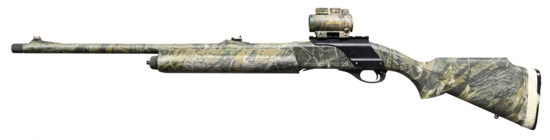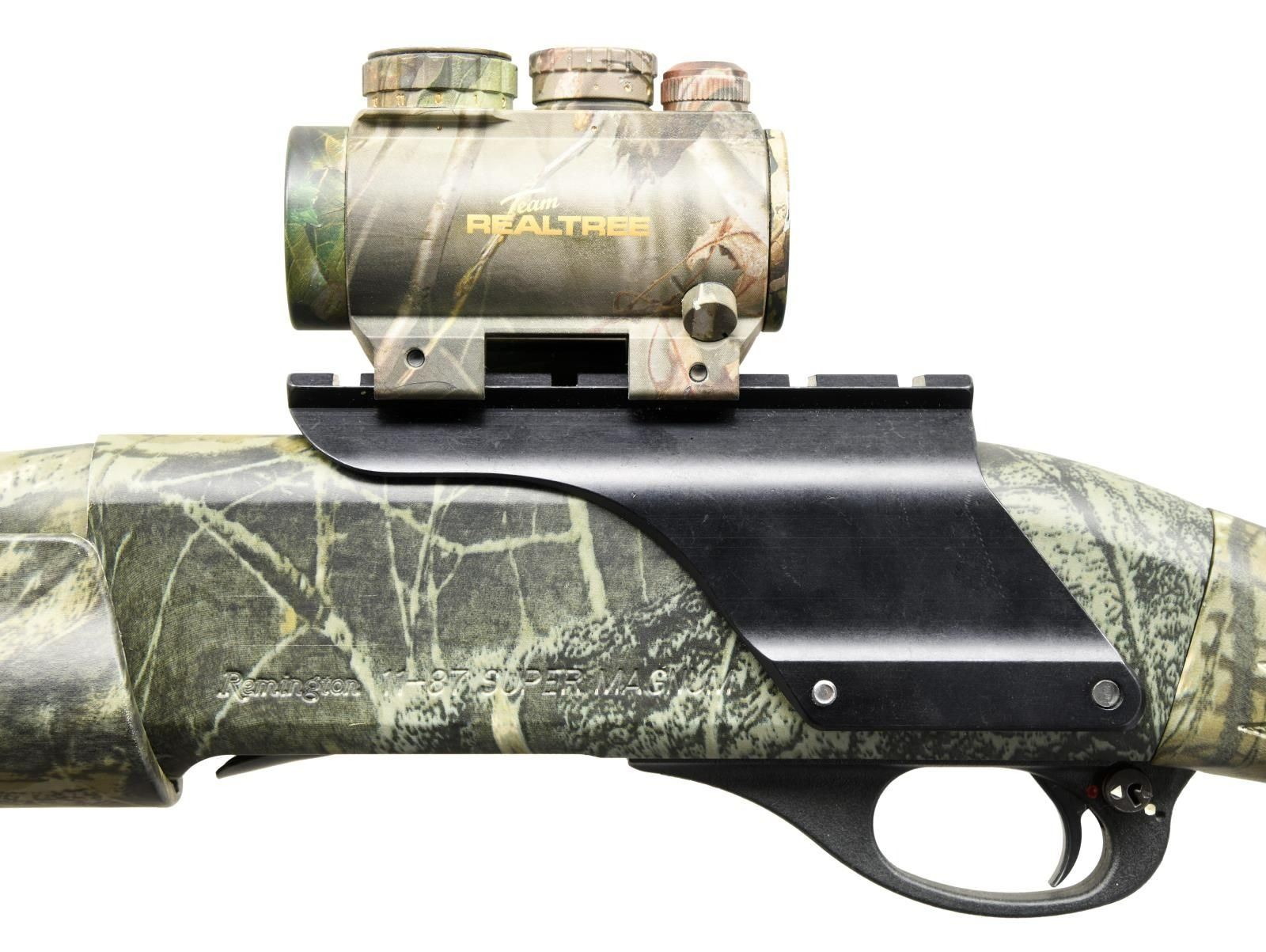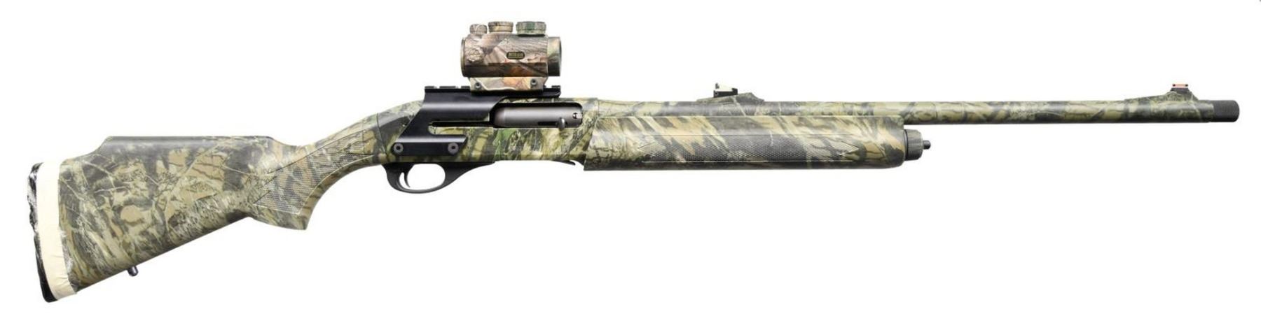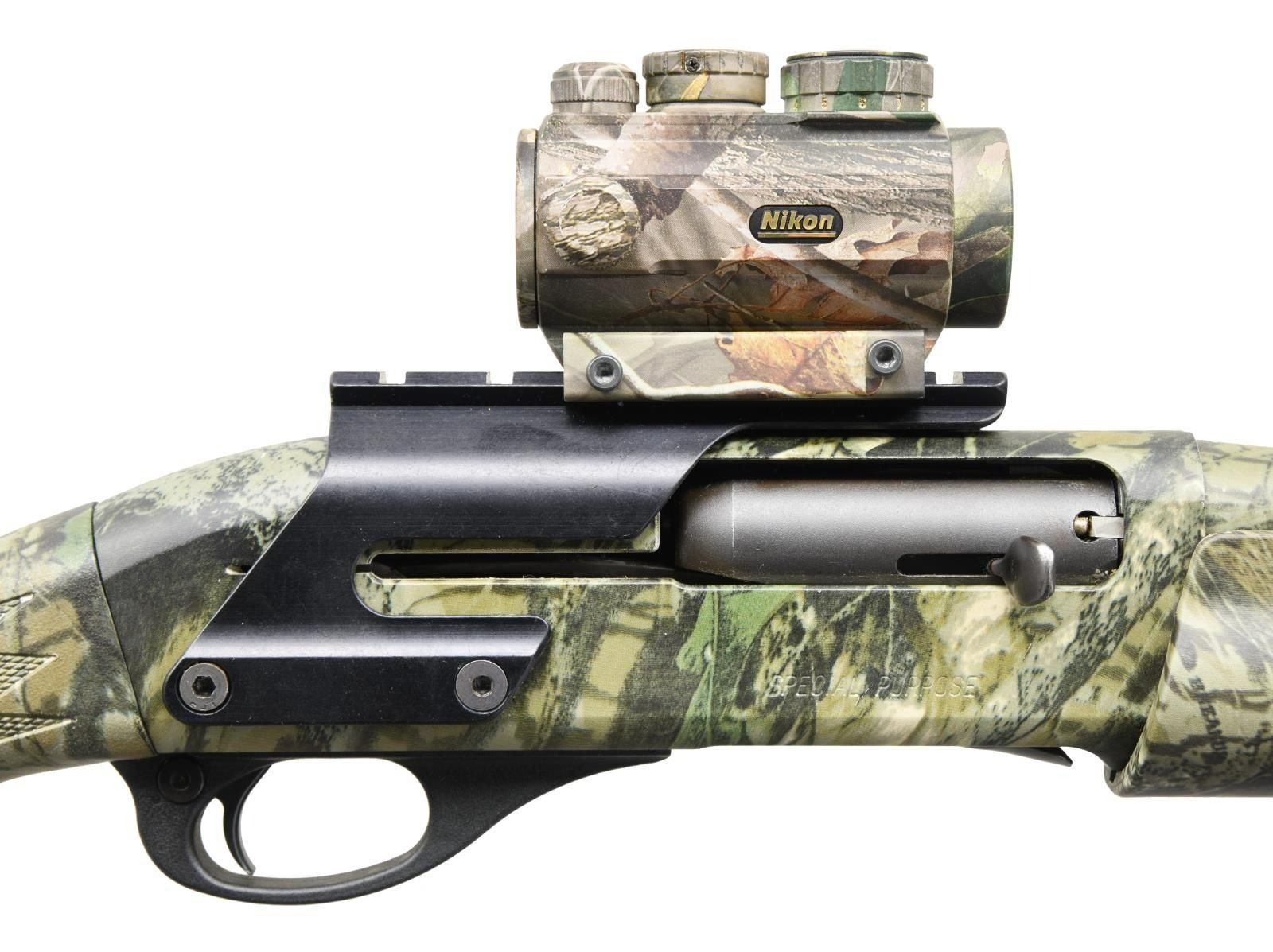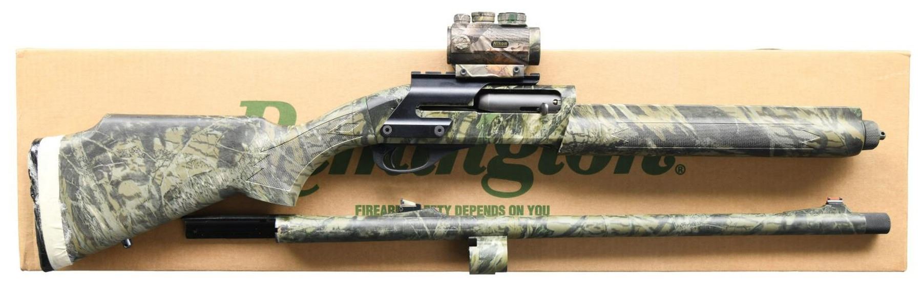 SHOTGUN WITH MATCHING FACTORY BOX. Cal. 12 GA, 2 3/4", 3", 3 1/2". S# SM040684. Bbl 23 1/4". Model 11-87 Super Magnum Special Purpose Synthetic semi-automatic shotgun mfg. by Remington. The left side of the bbl is marked with the cal. designation, with the right exhibiting Remington's mfg. information. Left side of receiver is marked "Remington" followed by the cal. designation and S# (beneath the saddle mount), with "SPECIAL PURPOSE" on the right. Steel receiver and bbl, as well as the checkered polymer pistol grip buttstock and forend exhibit Mossy Oak Break Up camouflage finish. Ramped red fiber optic front sight with ramped green fiber optic rear sight. Receiver is mounted with a black anodized aluminum saddle mount that features a Nikon Monarch Team RealTree red dot sight. Muzzle is fitted with a Remington removable Super Full choke. UNATTACHED ACCESSORIES: matching factory box. Original invoice. CONDITION: metal and polymer components retain bountiful amounts of their original factory finish, exhibiting few light superficial marks from handling and storage overall. Mirror bore. Polymer furniture is excellent. Black rubber recoil pad is wrapped in saran wrap and appears to be deteriorating. Nikon Monarch red dot sight retains a clear optic. Box shows some light exterior wear, but otherwise remains sturdy and serviceable. (23-4931/MLW). MODERN. $450-650.