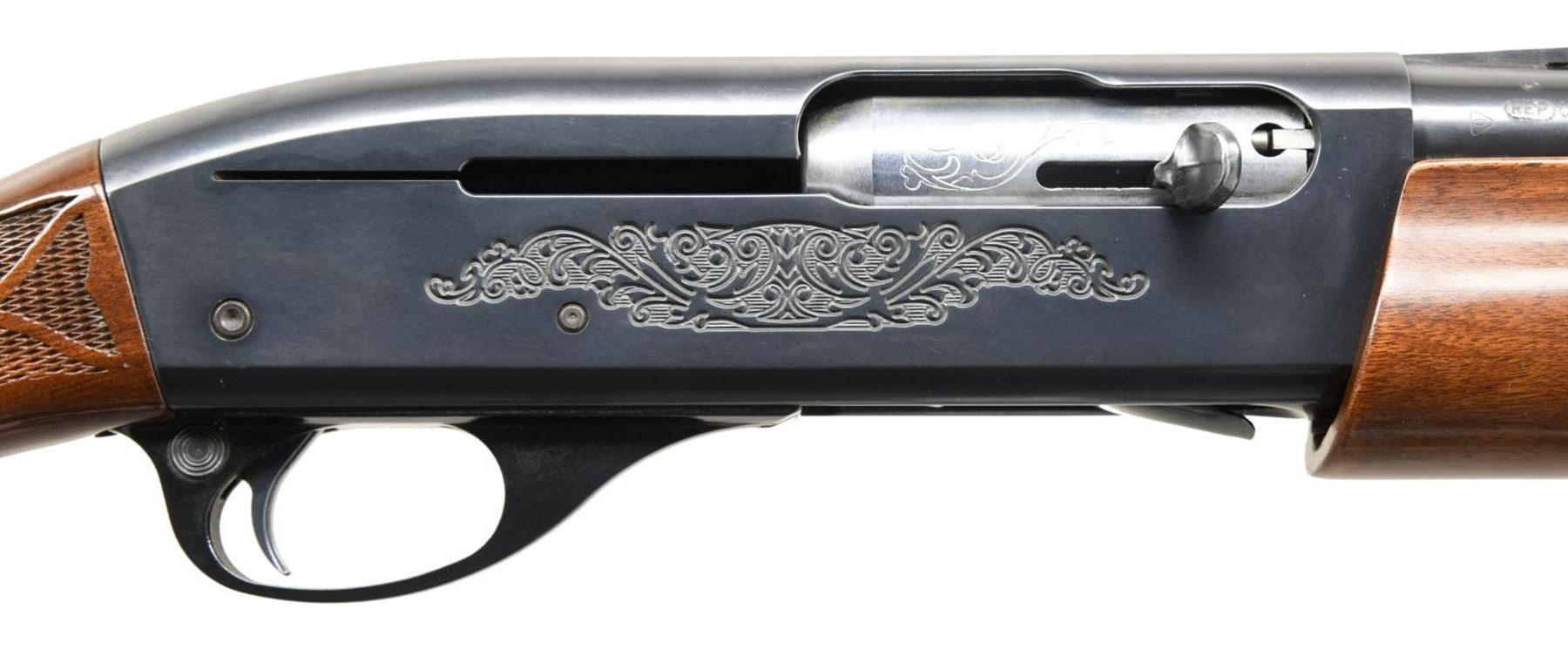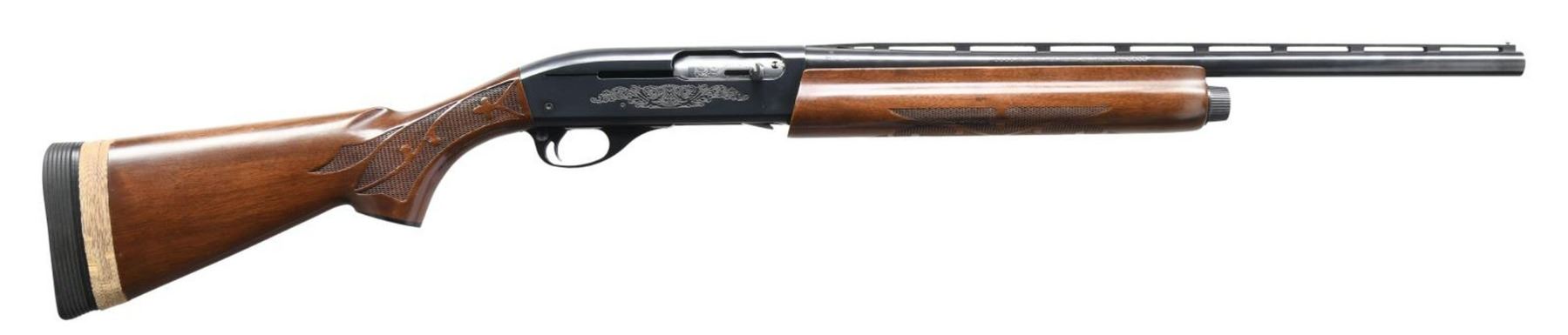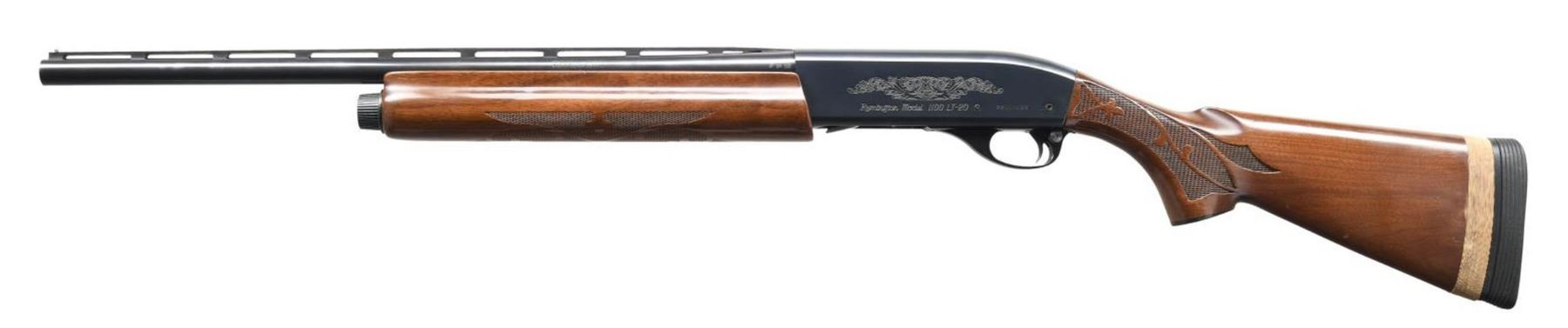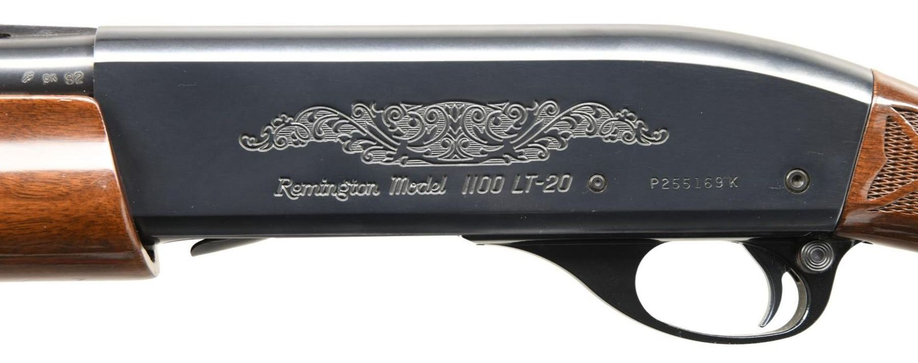Cal. 20 Ga., 2 3/4". S# P255169K. Bbl. 21". Model 1100 LT-20 semi-automatic shotgun mfg. by Remington Arms Co. Left side of bbl. exhibits the cal. designation, with Remington's mfg. information on the right. Sides of receiver exhibit scroll engraving, with the left side exhibiting the model designation and the S#. Metal components exhibit a blued finish. Fleur-de-lis checkered wood pistol grip buttstock and forend. Vent rib with aluminum bead front sight. Buttstock has been lengthened via the addition of several leather pads. CONDITION: metal components retain the majority of their original factory blue finish, exhibiting some superficial handling marks. Mirror bore. Wood furniture exhibits some scattered marks and minor impressions, but otherwise is good overall. PROVENANCE: The Collection of Gun Sport Ltd owned by Jon R. Thomas. (23-3582/MLW). MODERN. $500-700.
