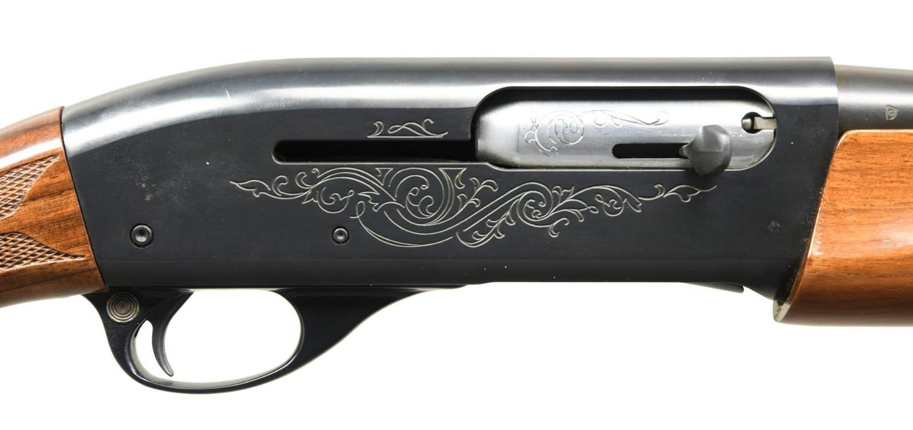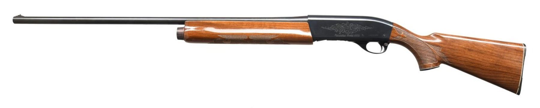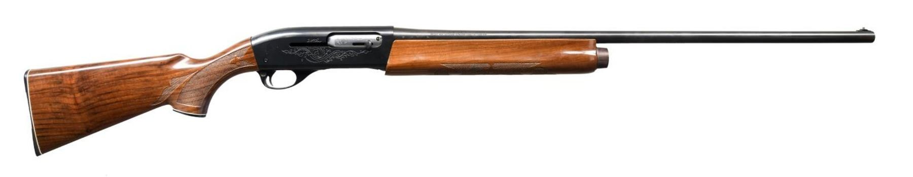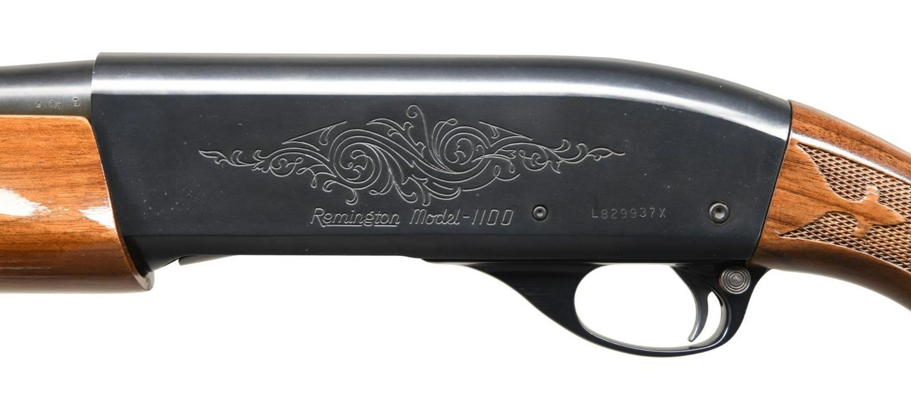 Cal. 20 GA, 2 3/4". S# L829937X. Bbl 28". Model 1100 semi-automatic shotgun mfg. by Remington. The left side of the bbl. is marked with the cal. designation, with the right exhibiting Remington's mfg. and patent information. Sides of receiver exhibit light foliate engraving, with the left side being marked "Remington Model-1100" followed by the S#. Receiver and bbl. are blued, with the aluminum trigger guard exhibiting a black anodized finish. Checkered fleur-de-lis wood pistol grip buttstock and forend. Aluminum bead front sight. CONDITION: metal components retain the vast majority of their original factory blue finish, exhibiting areas of some light oxidation and areas of light freckling overall. Mirror bore. Wood furniture is very good overall, with some marks from handling, as well as a small loss at the toe of the buttstock. PROVENANCE: The Collection of Gun Sport Ltd owned by Jon R. Thomas. (23-3571/MLW). MODERN. $600-900.