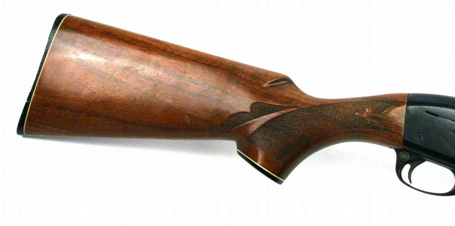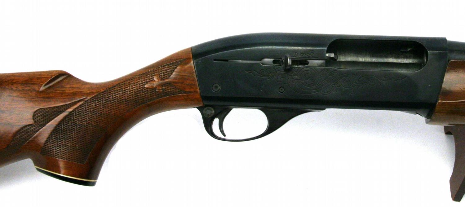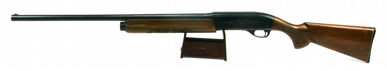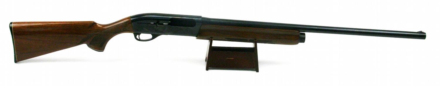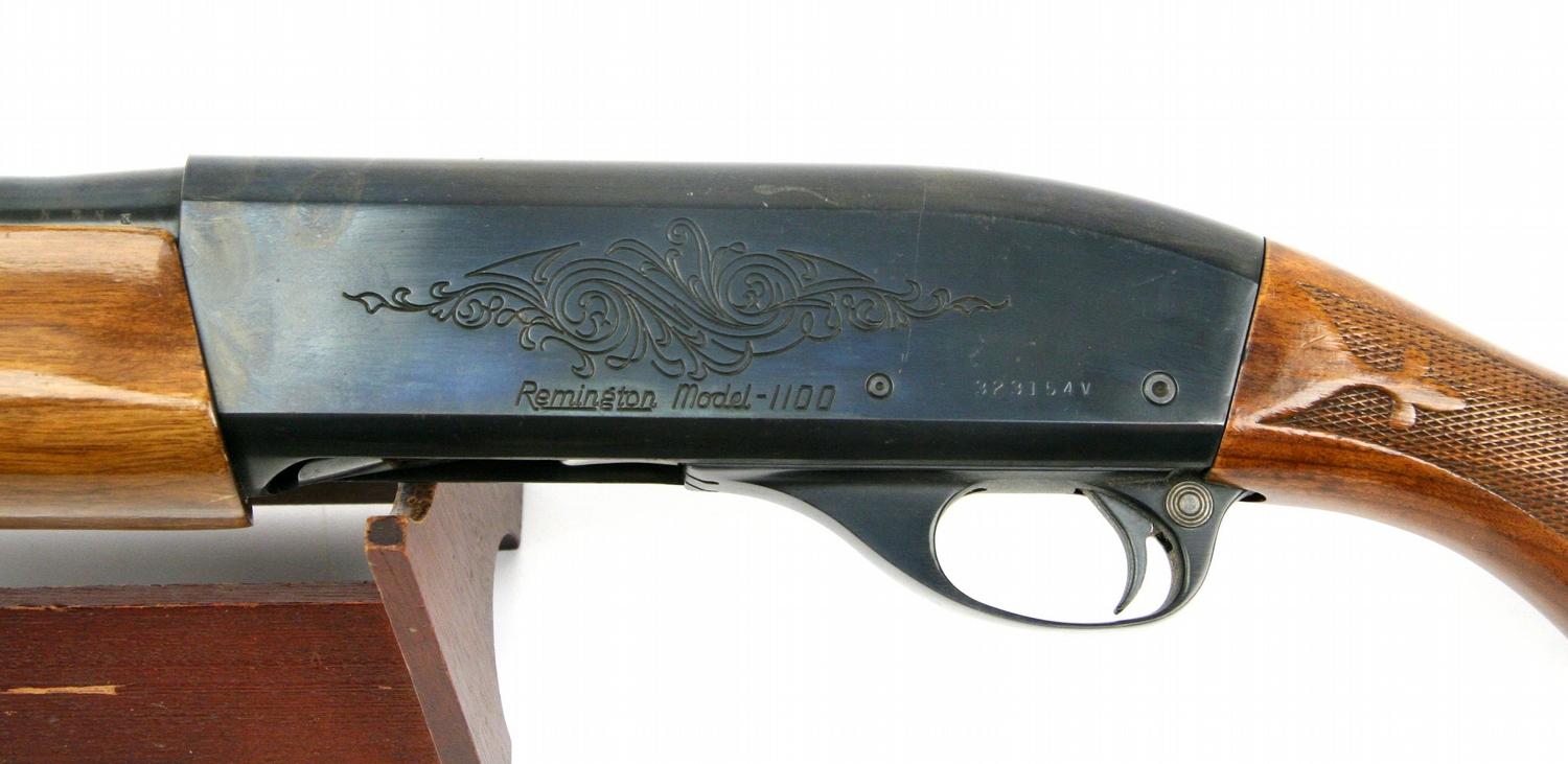 Remington Model 1100 semi automatic shotgun. 12 gauge, 25.5 inch barrel, chambered for 2 3/4 inch shells. Bore is bright and clean, and stock is very good with light handling marks. Bluing is about 90%, with barely visible speckling of surface rust. Overall very good condition. SN: 323154V