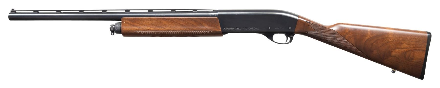 SHOTGUN. Cal. 12 GA, 2 3/4". S# P019726V. Bbl. 21". Model 1100 Special semi-automatic shotgun mfg. by Remington. Left side of the bbl. is marked with the cal. designation, followed by "IMP. CYL.", with Remington's mfg. information marked on the right. Left side of the receiver is marked with the model designation and S#. Metal components exhibit a blue finish overall, save for on the bolt which is polished in-the-white, as well as the alloy trigger housing which exhibits a black anodized finish. Checkered wood forearm and straight grip stock with Remington "RA" monogram checkered black synthetic buttplate. Toeline of stock and mag. cap are mounted with sling studs. Grooved matte rib with white synthetic bead front sight and aluminum mid bead. CONDITION: metal components retain virtually all of their original factory finishes, showing a few superficial handling marks overall. Mirror bore, exhibiting a few spots of light fouling. Proper manual mechanics. Wood furniture shows a few superficial marks and impressions from handling and storage, but otherwise remains very good overall. (25-5147/MLW). MODERN. $500-800.