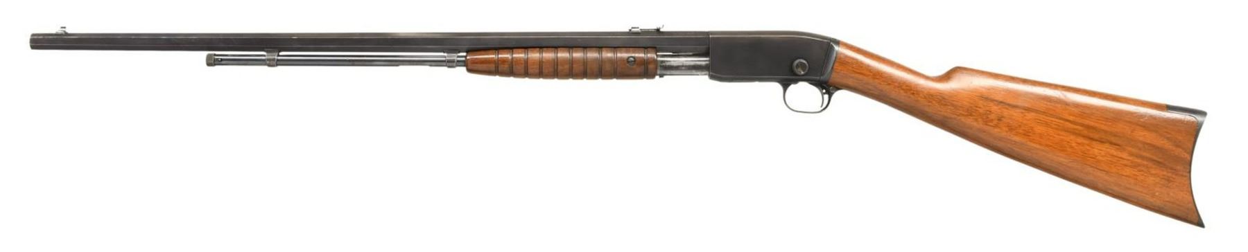 Cal. 22 S, L, LR. S# 230611. Bbl. 24". Model 12 slide action rifle manufactured by Remington UMC. The top flat of the octagonal bbl. is marked with Remington's mfg. information, with the Remington trademark logo marked at the breech. Cal. designation is marked on the quarter left flat of the bbl. at the breech. Metal components exhibit a blued finish overall. Plain wood straight grip buttstock and grooved forend. Blade front sight with U-notch rear sight. CONDITION: metal components retain the majority of their original factory blue finish, exhibiting mild wear and thinning, with some spots of pitting and dark oxidation. Bright bore, exhibiting scattered pitting and good rifling throughout. Wood furniture shows some scattered marks and minor impressions from handling and storage, but otherwise remains sturdy and serviceable. The Collection of Curtis H Halvorson. (23-5955/MLW). CURIO. $300-500.