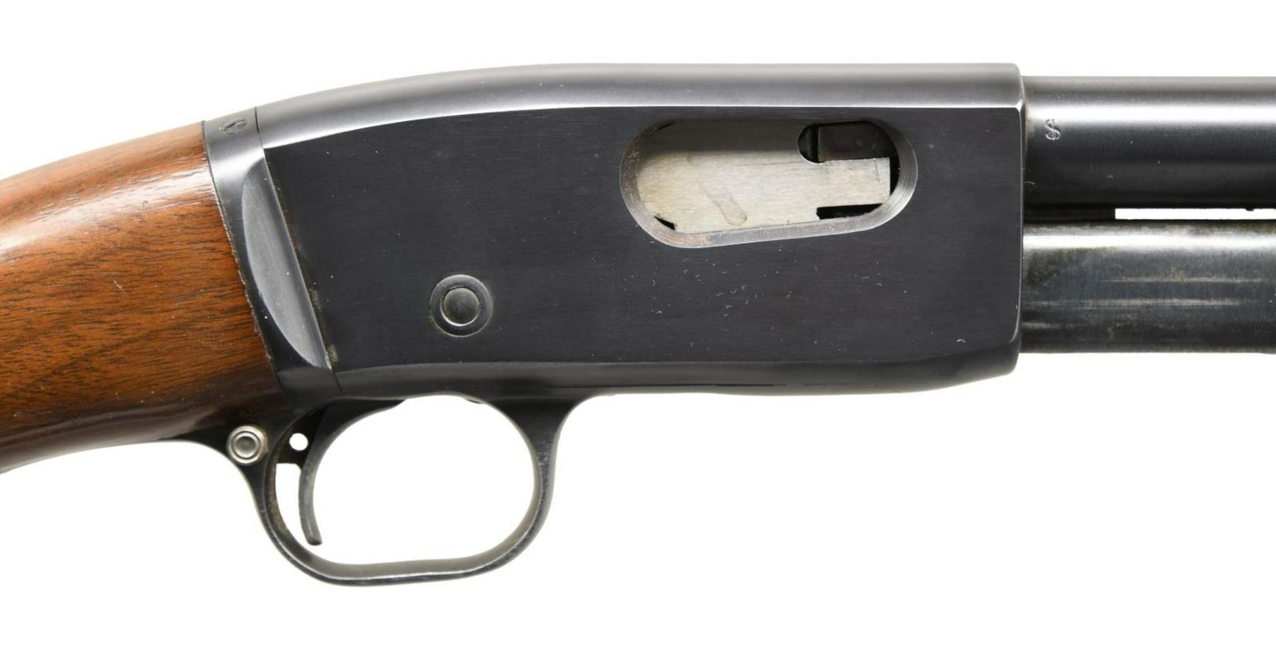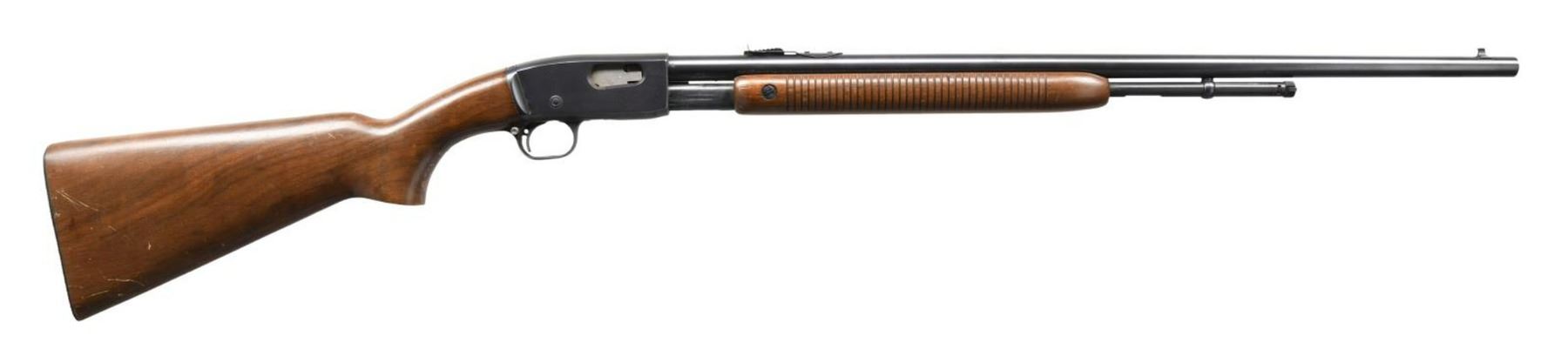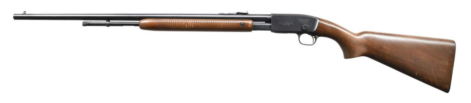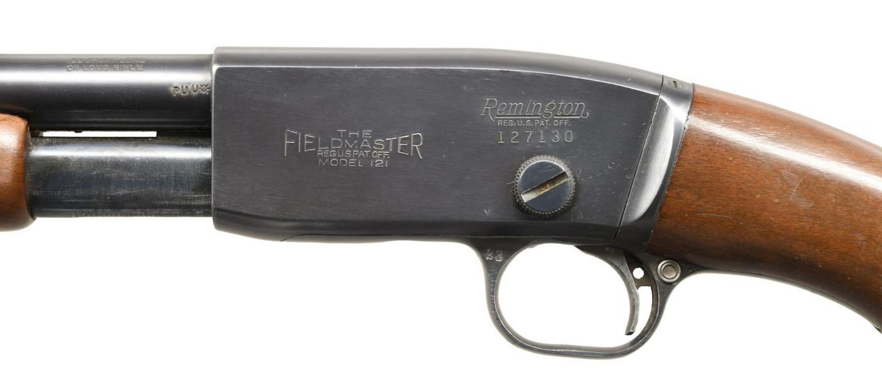 Cal. 22 S, L, LR. S# 127130. Bbl. 24 3/4". Model 121 Fieldmaster pump action rifle mfg. by Remington Arms Co. The top of the bbl. is marked with Remington's mfg. information, with the cal. designation marked on the left at the breech. Left side of receiver is marked "THE/ FIELDMASTER/ REGUSPAT.OFF./ MODEL 121", followed by the Remington trademark logo above the S#. Metal components exhibit a blued finish. Plain wood pistol grip stock with grooved wood pump. Dovetailed blade front sight with U-notch rear sight. CONDITION: very good overall, with metal components retaining the majority of their original factory blue finish, exhibiting a few scattered spots of mild wear and some areas of freckling. Mirror bore, exhibiting strong rifling throughout. Wood furniture shows some scattered marks and dings from storage and handling, but otherwise remains sturdy and serviceable. (23-5492/MLW). CURIO. $250-350.