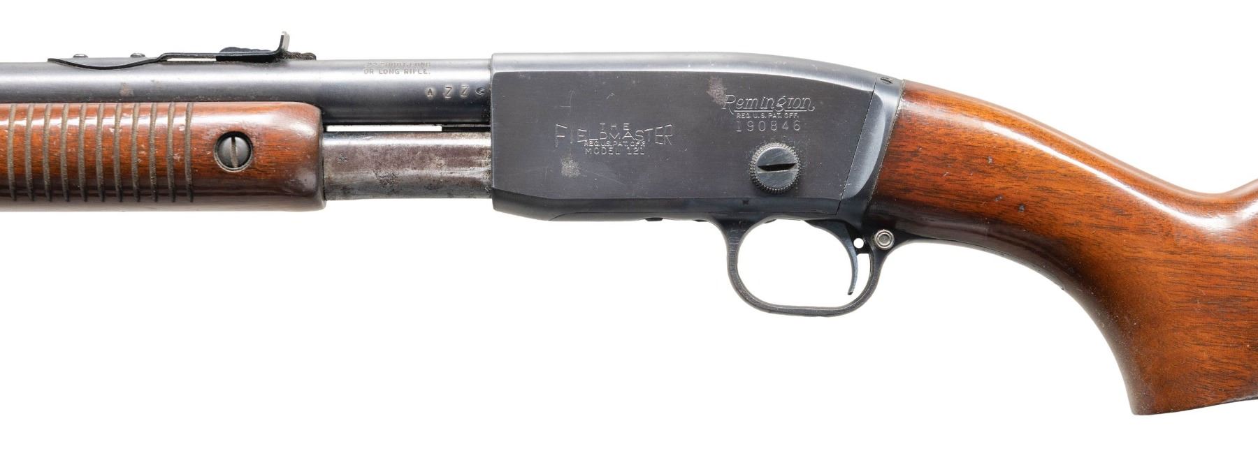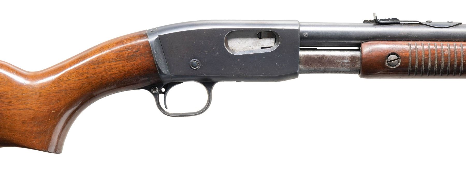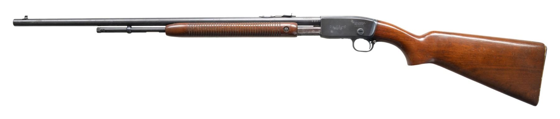 Cal. 22 S, L, LR. S# 190846. Mfg. March 1952 based on the "AZZ" code on the 24.5" bbl. Open sights. Tubular mag. Walnut stock set w/ checkered alloy buttplate. CONDITION: good original blue with areas of oxidation & peppery oxidation throughout. Lightly sanded & refinished wood shows marks. Very good rifling with light frosting around muzzle. (25-4068/MD). CURIO. $300-400.