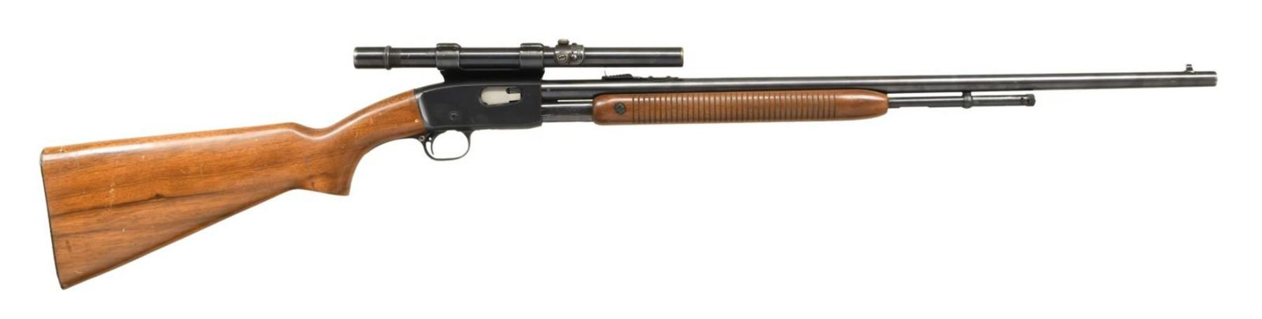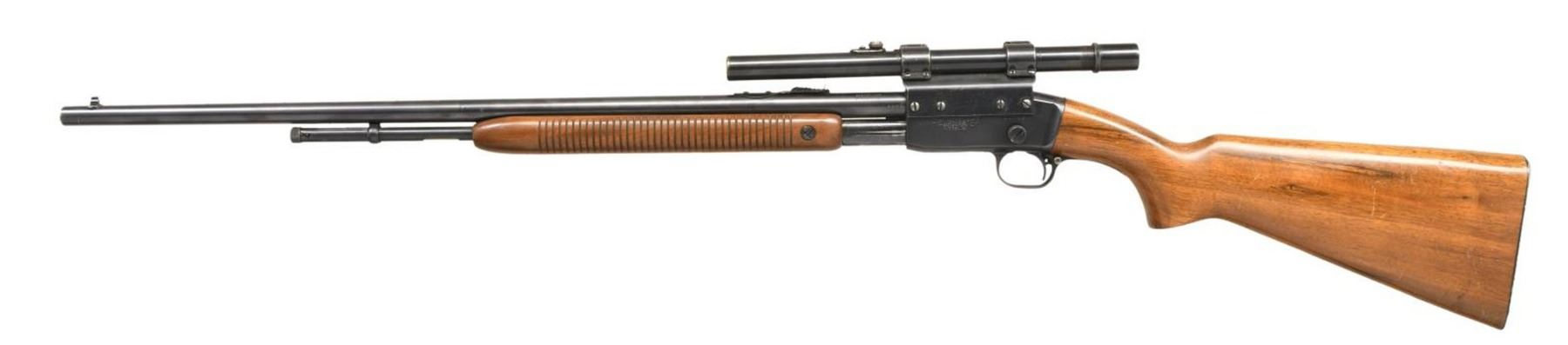 RIFLE. Cal. 22 S, L, LR. S# 90728. Bbl. 24 3/4". Model 121 Fieldmaster slide action rifle mfg. by Remington Arms Co. The top of the bbl. is marked with Remington's manufacture information with the cal. designation stamped on the left at the breech. The left side of the receiver is marked with the model designation, followed by the S#. Metal components exhibit a blued finish. Plain wood pistol grip buttstock with grooved forend. Blade front sight with U-notch rear sight. Left side of receiver is drilled and tapped with a scope mount that is fitted with a Weaver G4 scope. CONDITION: metal components retain the majority of their original factory blue finish, exhibiting some spots of mild wear and some scattered handling marks. Mirror bore exhibiting well defined rifling throughout. Wood furniture shows some scattered marks, minor impressions and some scratches, but otherwise remains sturdy and serviceable. Scope retains a clear optic. PROVANANCE: from The Collection of Curtis H Halvorson. (23-5932/MLW). CURIO. $200-400.