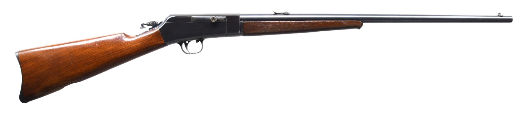 Cal. 22 Rem Auto. S# 17359. Bbl. 22" round of takedown style w/ sporting front & rear sights along w/ Marble tang sight. Schnable tipped forearm & straight grip walnut stock w/ crescent steel buttplate. Mag. tube inserts through buttplate & loads through bottom of stock. Total of 17,738 mfg. 1914-28. CONDITION: over 95% original blue showing slight edge wear w/ small marks & spots of fading. Original wood finish shows wear w/ scattered scratches & marks. Very good bore. PROVENANCE: The estate collection of Don "Duck" Combs. (24-2436/DS). CURIO. $1,200-1,800.