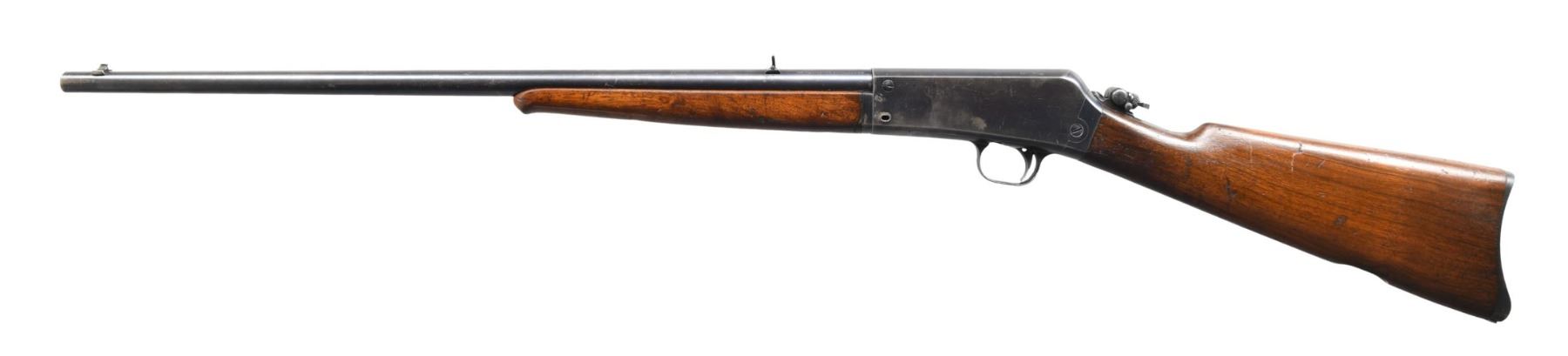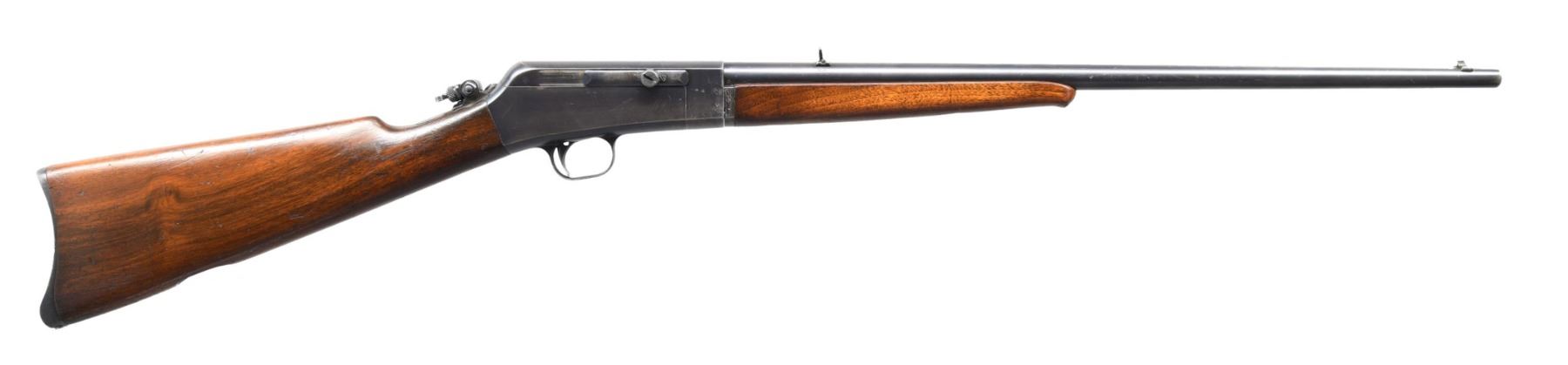 Cal. 22 REM AUTO. S# 9030. Bbl. 22" dovetailed bead front sight. Flip up dovetailed rear sight & adjustable tang/receiver peep sight. Walnut stock set. Smoot semi crescent steel "Remington UMC" marked buttplate. CONDITION: Barrel bluing has wear at the muzzle and many scattered light scratches. Receiver has high edge and carry wear. The takedown button is missing and the mechanism will not lock the barrel inplace because of it. Stock set shows a fair number of handling marks and some heavier impressions. Very good bore with sharp rifling. CURIO (24-5171/ZAL) $200-300