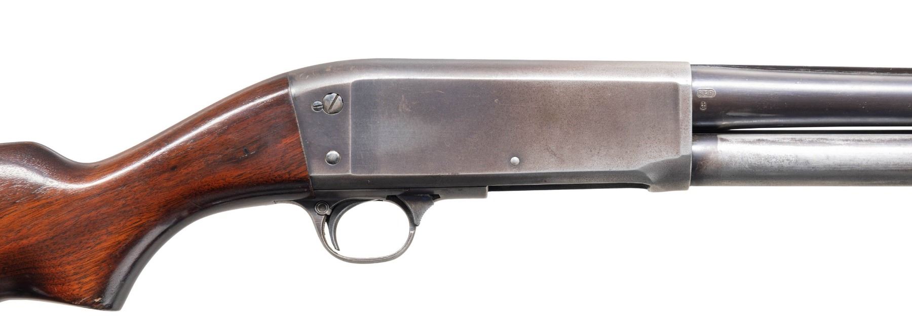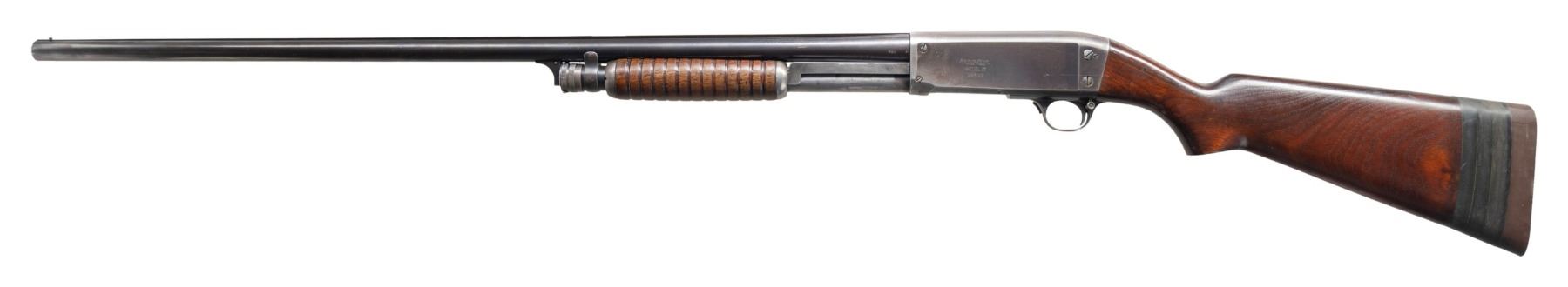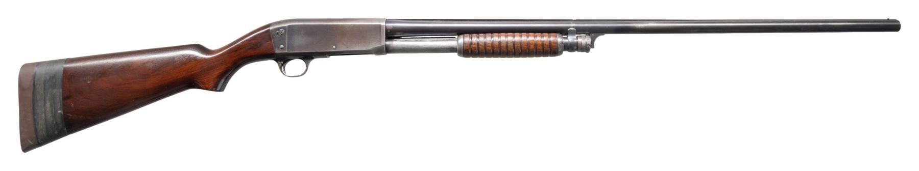 Cal. 20 Ga. S# 39192. Solid rib 30" bbl. w/ steel bead & marked "FULL"; brass gauge measures Mod. Tubular mag. Bottom eject action. Original walnut grooved forearm. Replacement walnut pistol grip buttstock has LOP: 15" over brown pad (1.5" of black spacers). CONDITION: fair blue. Refinished forearm finish. Very good buttstock finish. Very good shiny bore. (25-4504/MD). MODERN. $500-750.