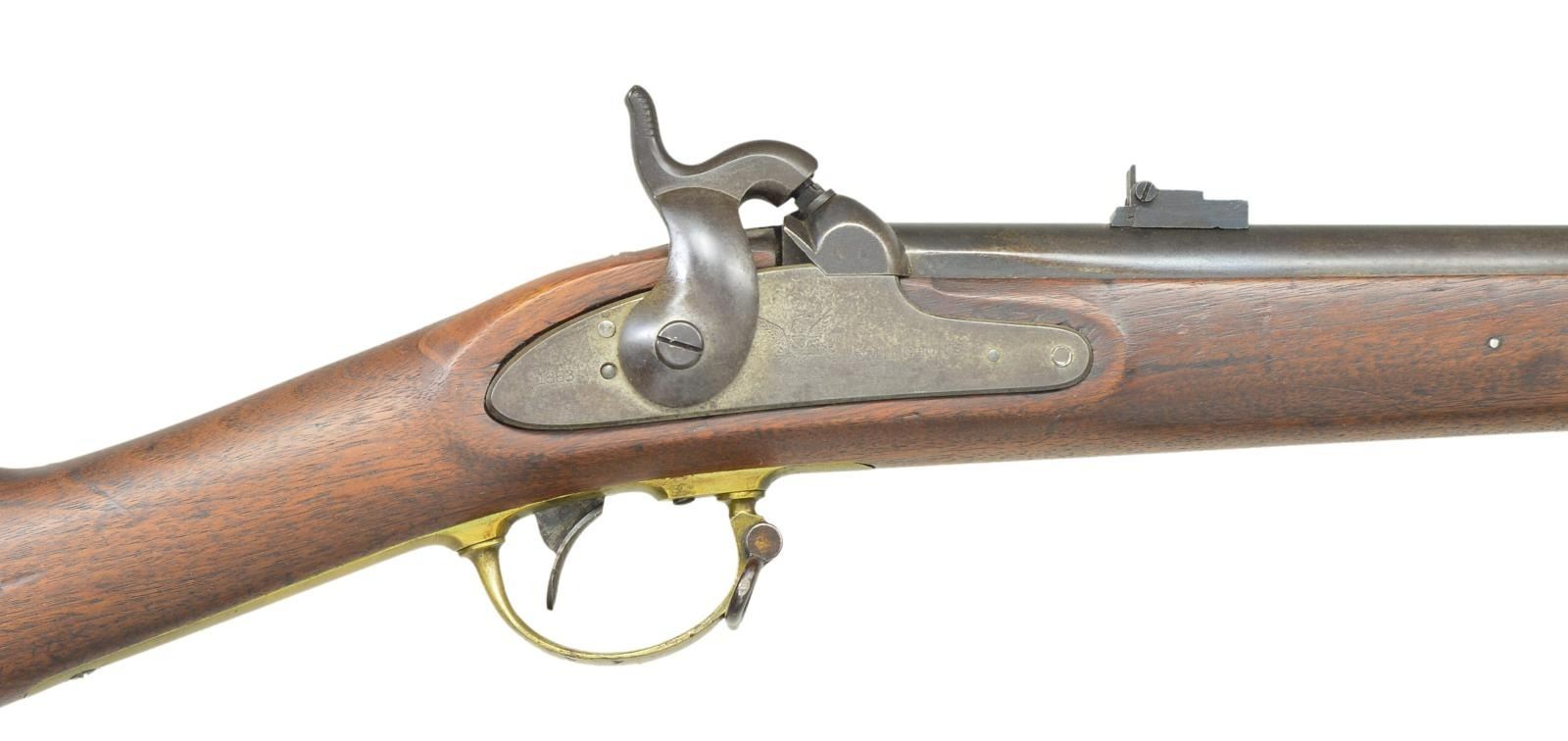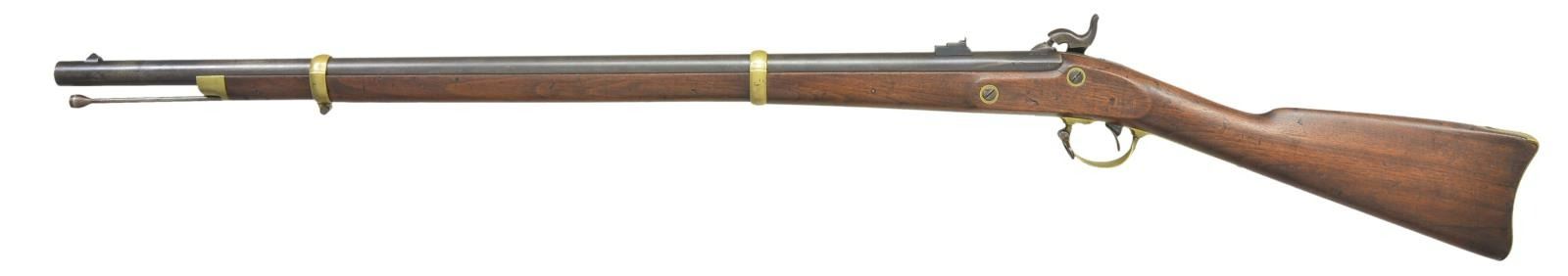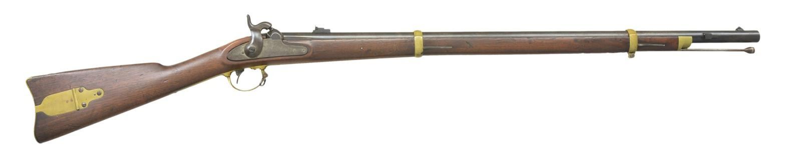Cal. 58. NSN. Standard configuration of the popular brass mounted Civil War rifle, 33" blued barrel marked at breech "1863" & "V" / "P" & eaglehead proofs. "STEEL" and inspector "RKA" left side. 2-leaf 3-position rear sight and saber bayonet lug. Case colored lock stamped with eagle and "REMINGTON'S / ILION, NY" and "1863 at tail. Brass furniture and straight grain stock with 2 inspector cartouches. CONDITION: Very good overall, complete & matching. Iron & brass patinas. Stock is solid, inset repair rear of lock to tang. Mechanically functionable, crisp rifled bore with pitting. PROVENANCE: From the Lifelong Collection of Glen E. Mattox. (01-22510/JS). ANTIQUE. $2,000-2,500.