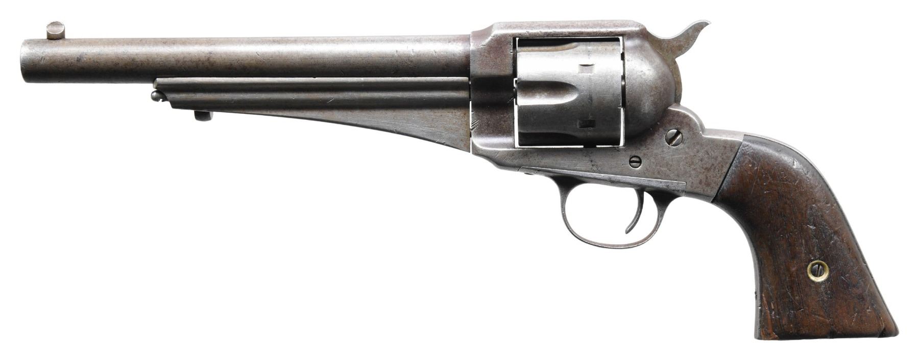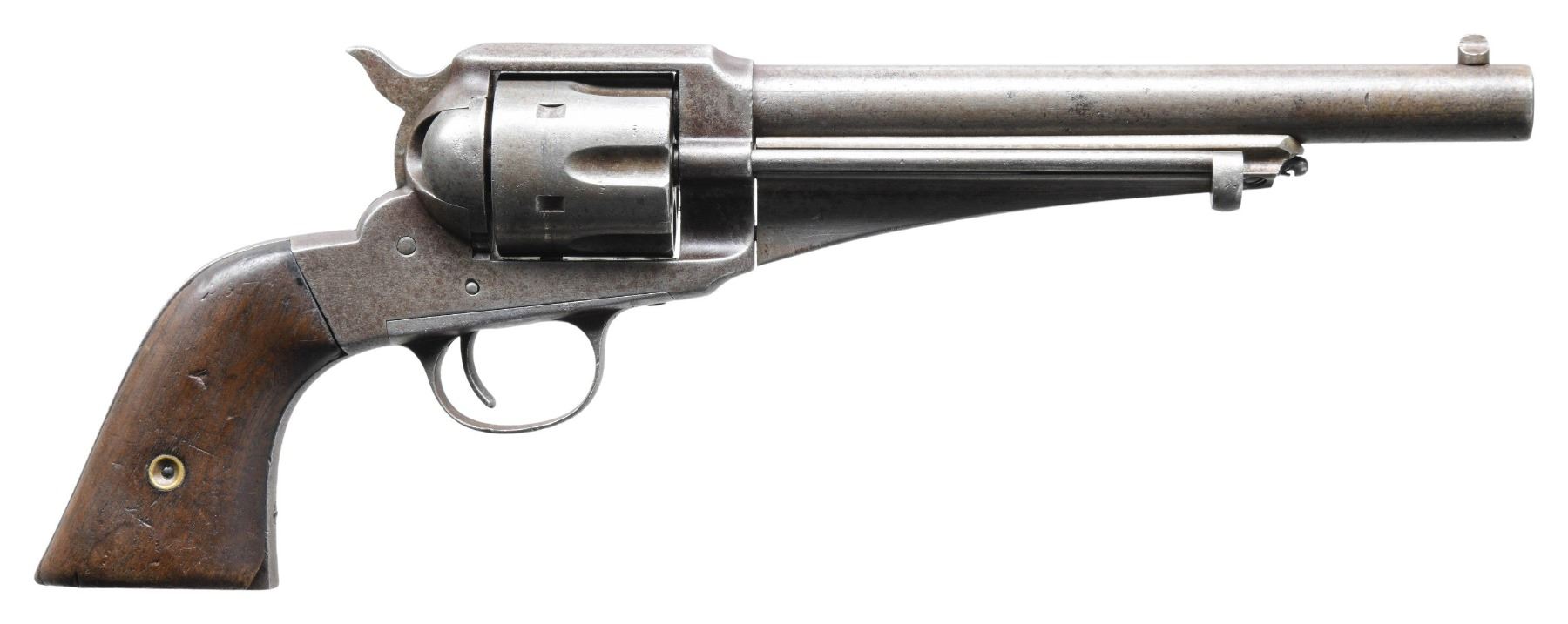 Cal. 44 Remington CF. S#. 383, on inside of grip frame. Bbl. 7 1/2" round with webbed ejector housing. Fluted 6 shot cyl. 2 piece walnut grips. The left panel has carved marking that Wendell Grangaard believes to be "Togia", plains indian markings. Approx. 25,000-30,000 mfg. 1875-1890. UNATTACHED ACCESORIES: letter from Wendell Grangaard, author of the book "Documenting the Weapons Used at the Little Bighorn". In his letter Wendell says he believes this to be one of the revolvers issued at the Standing Rock Reservation based on the marking on the grips. He also believes it was used by 2 reservation police officers, Looking Elk & Good Voice Elk. CONDITION: metal has a faded gray appearance showing scattered light pitting & handling marks. Grips show heavy wear with chips at butt & a small added wood repair at the toe of the left panel. Left panel retains lightly visible markings. The action has slightly slow timing. Dark lightly pitted bore retains intact rifling. (01-27896/DS). ANTIQUE. $1,500-2,500.