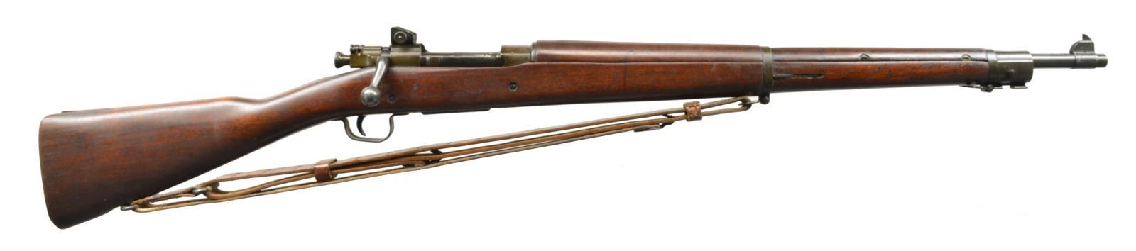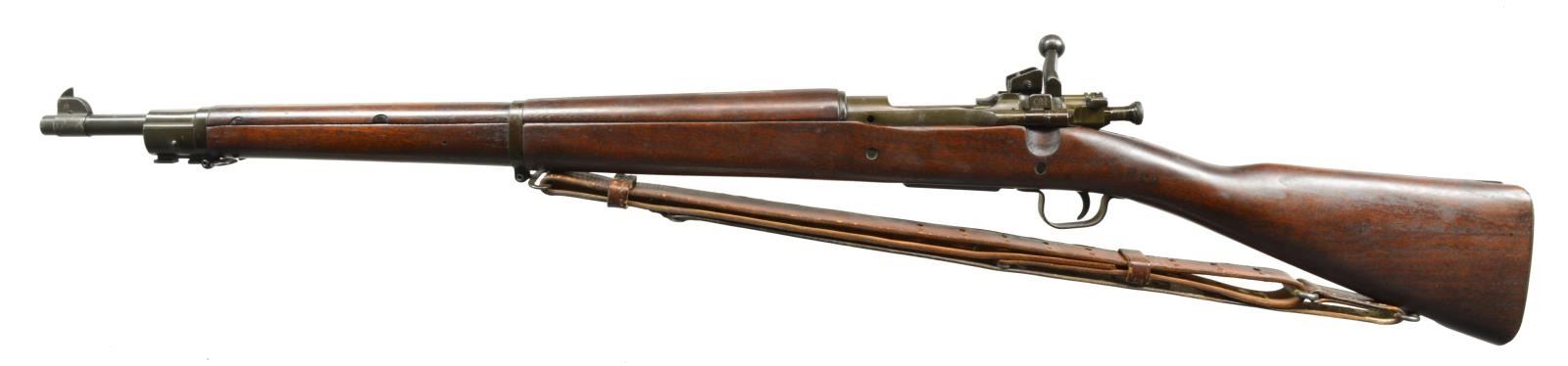 Cal. 30-06. S# 3771498. Bbl. 24". Adj. aperture rear sight. Blade front sight. Bbl. marked behind front sight “RA”, flaming bomb & “6-43”. Bolt assembly marked “R”. All stamped furniture, including trap buttplate. Large bow trigger guard. Matching walnut stock set w/ straight grip & 2 reinforcing bolts. Stock marked on left side w/ “RRA”, an arsenal rebuild mark. Mark behind trigger guard w/ encircled “P” proof. Unmarked model 1907 type leather sling. CONDITION: stock set has very light wear & handling marks. Notable sm. area of white staining on left rear of handguard. Metal retains 90% original parkerizing w/ light wear & scattered scratches. Very good, shiny 2 groove bore. (20-1628/RW). CURIO. $500-700.