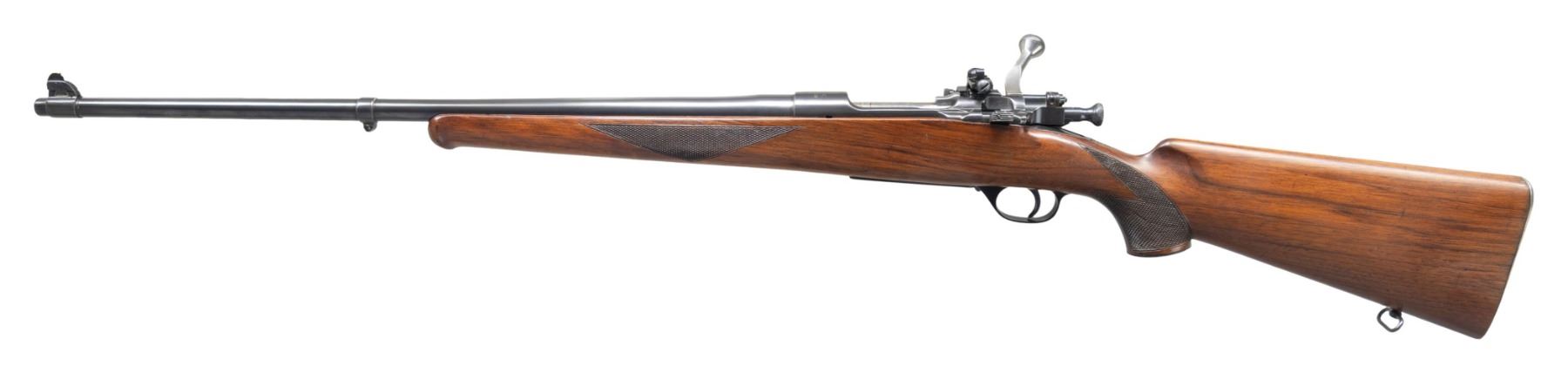 Cal. 30-06. S# 3269728. Bbl. 24". Nice quality sporter conversion of a Remington made Model 1903 bolt action military rifle. The barrel was made by High Standard and has four grooves. The front sight is a bead type pinned in the movable base. The original rear sight was removed and a Lyman 48 receiver sight was installed. The matching numbered sight has coin slotted knobs and a slide graduated to 60 points. This sight is a replacement for an earlier one which required stock inletting. The stock has a neat repair to replace the small inletted area. The walnut stock is checkered and has a straight comb and a schnabel tip forend. Checkered steel buttplate and grip cap. Alloy sporting triggerguard with running deer scene on floorplate. 1" swivel in butt and barrel band for swivel 2" ahead of forend tip. CONDITION: stock has only light wear and scattered handling marks. Checkering has lightly worn diamonds. Metal retains most of its professional blue finish with light high point wear. Very good shiny bore. (25-4459/RW). MODERN. $400-600.