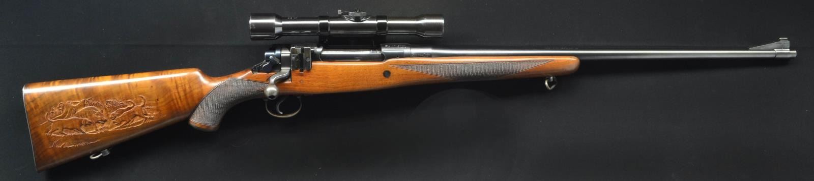 Cal. 30-06 (marked "30 CAL. 1906). S# 25206. Bbl. 24' w/ banded ramp having brass bead; no provision for rear sight w/ Lyman 48 receiver sight base (no slide assembly). Mfg. 1930-1940 as Special Grade. Bbl. codes October 1945 along w/ "3" indicating service repair likely for installation of 24" bbl. after production rather than normal 22" bbl. Checkered walnut stock set w/ wraparound checkered forend, 2 panels of checkering in grip area, sling swivels, checkered steel Remington marked buttplate plus relief carved game scene on each side of buttstock. P. Jaeger side mount w/ Zeiss Zielvier scope (appears 4 power) having German #4 3 post reticle; S# 25931. Cocks on opening rather than closing as used on the Model 1917's it was patterned after. CONDITION: overall near excellent w/ refinished scope. Near excellent bore & optics. (22-2635/NW). CURIO. $450-650.