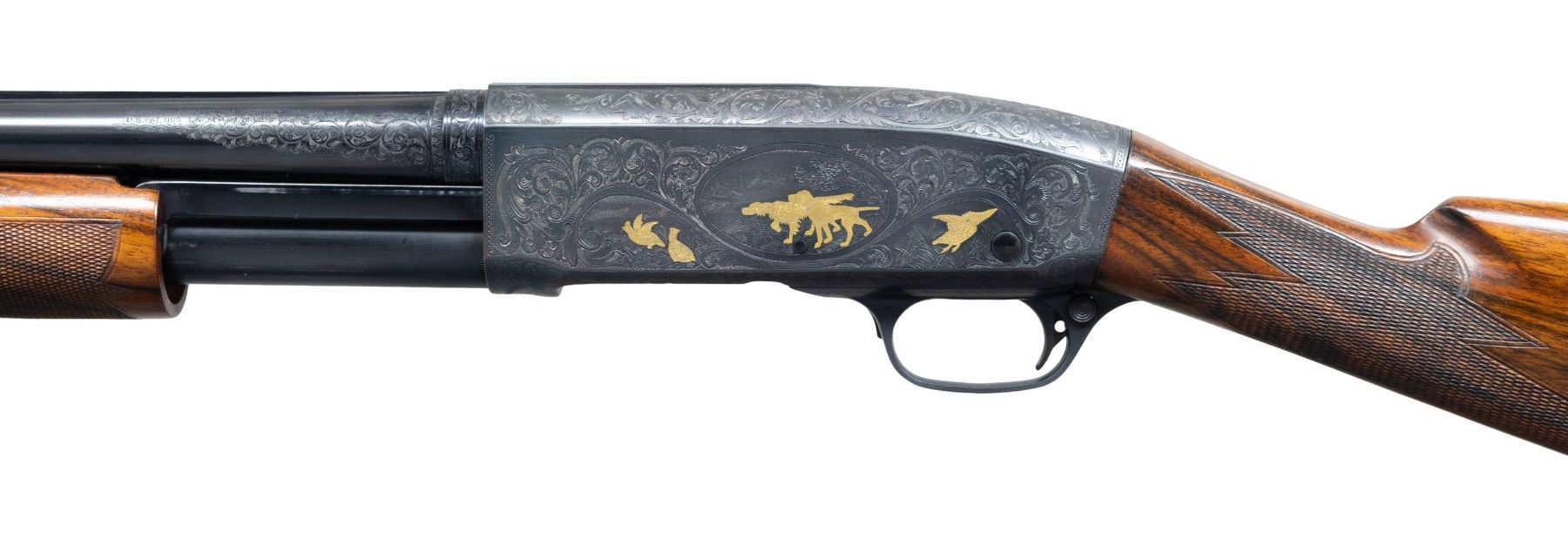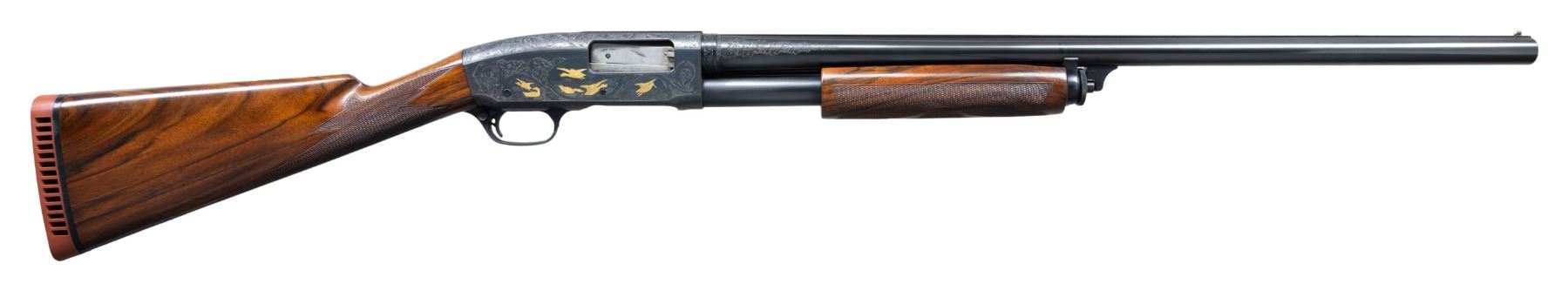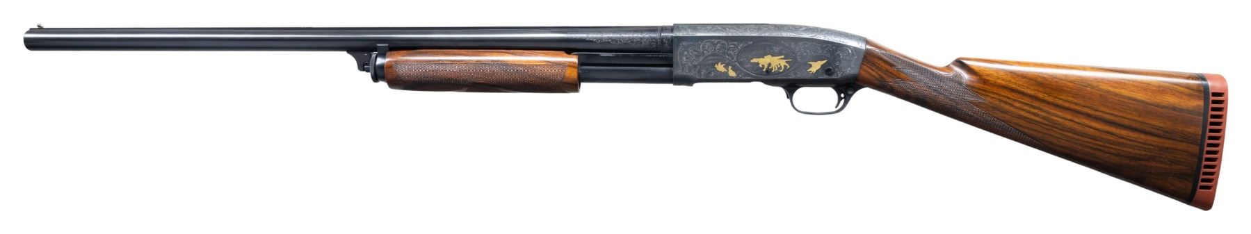 STYLE ENGRAVING. Cal. 12 GA, 2 3/4". S# 81879. Bbl. 26" solid rib with early style band at breech end. White target front sight. Aftermarket Briley Light Mod. steel shot choke tube measuring 2 3/4" in length. Action has unsigned F grade engraving in the style of factory engraver Robert P. Runge. Foliate scroll engraving has gold plated figures. Right side depicts 5 mallards and a woodcock. Left side shows 2 partridge, 2 pointing hunting dogs, and a flying woodcock. Trigger guard bow features a head of a setter. Breech end of bbl. has complimentary engraving that partially covers the patent markings on the left side. Walnut forearm and straight grip stock with F grade hand checkering. Toeline of stock has brass oval escutcheon with initials that appear to be "L R". LOP: 14 5/16" over a Hawkins red ventilated pad. CONDITION: gun retains over 95% reblued metal finish showing slide wear. Very good stock finish showing a few small marks. Sound action. Very good bright bore. (25-4961/DS). CURIO. $3,500-5,000.