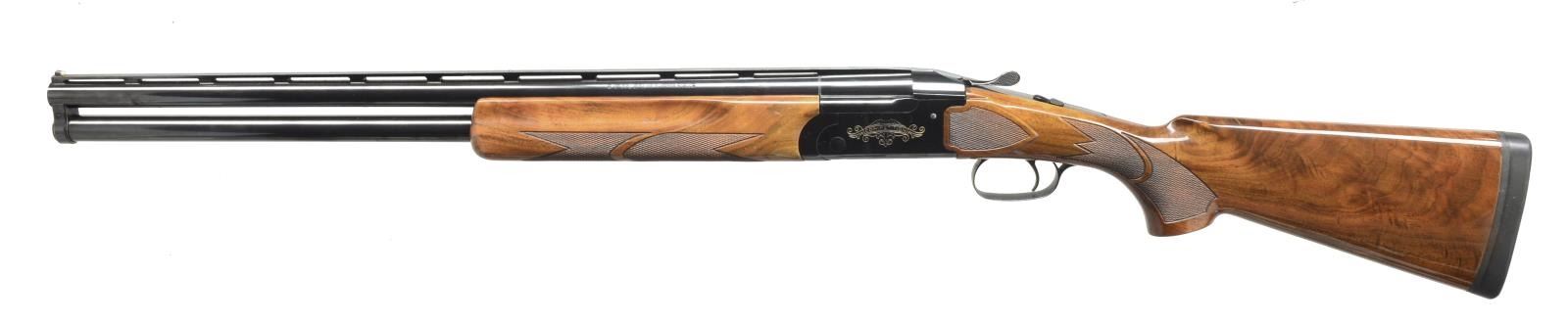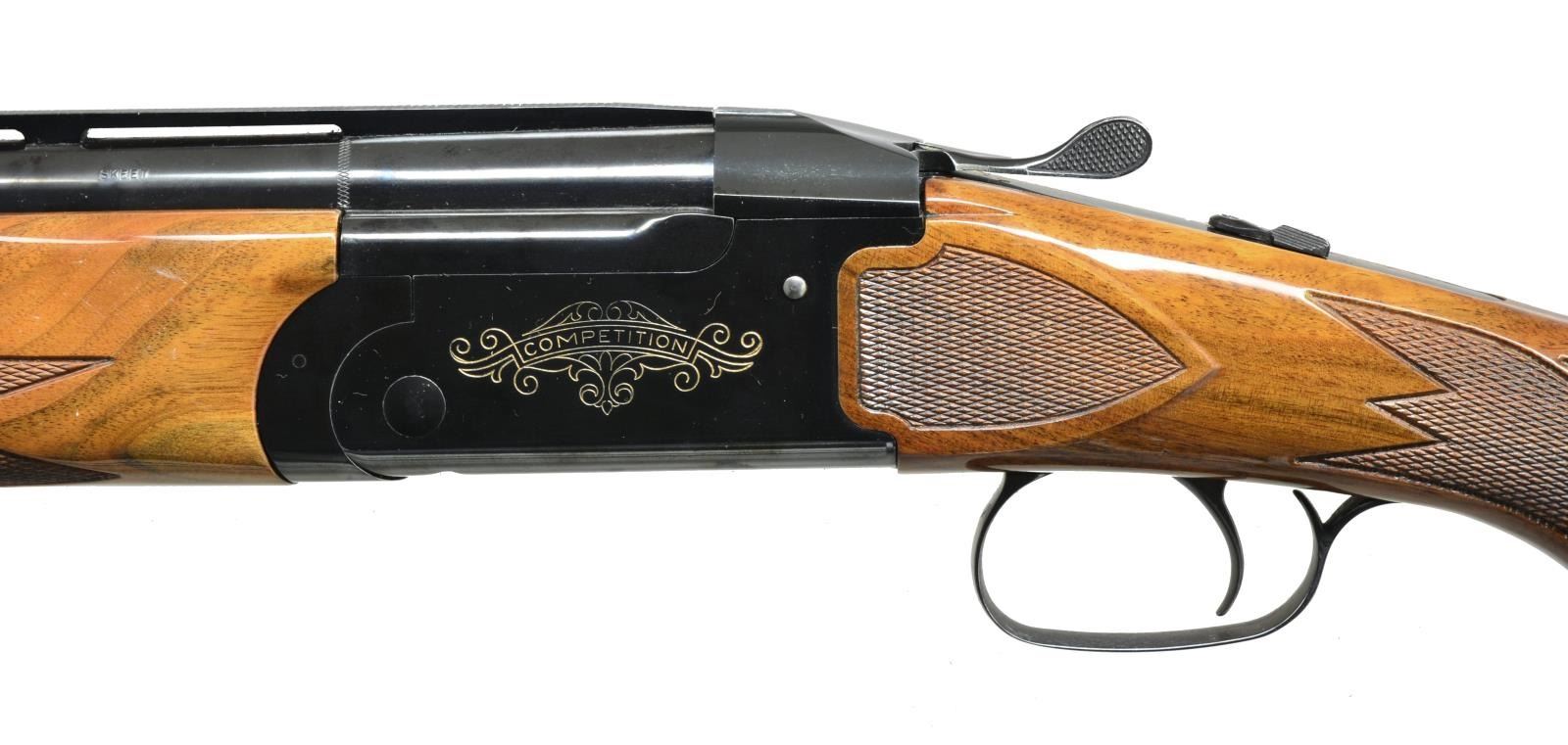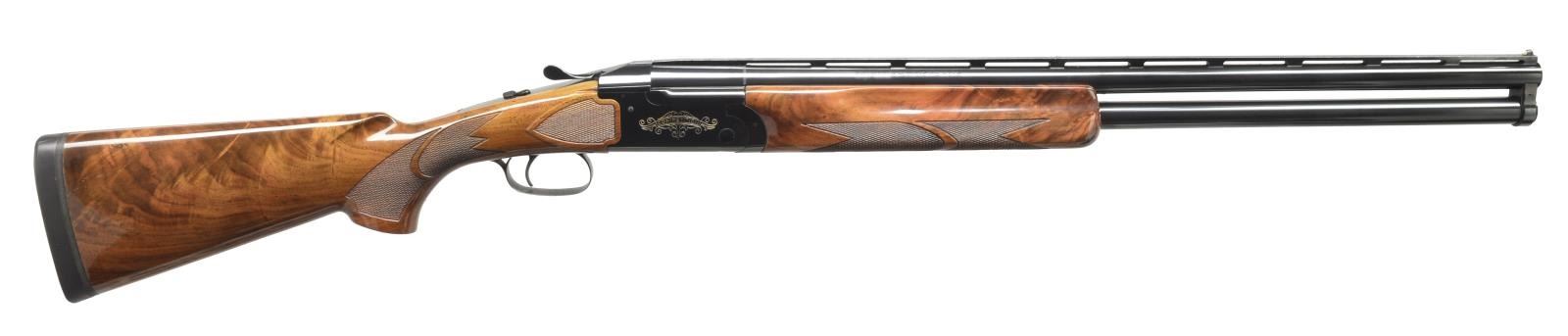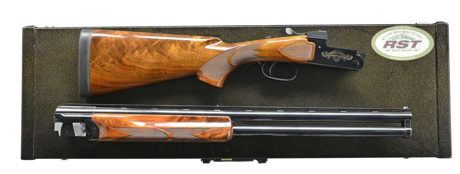 W/ ALL GA. TUBE SET. Cal. 12 Ga., 2 3/4. S# OU.45554. Bbls. 25 1/4" O/U fitted w/ narrow matted ventilated rib & no side ribs. Bbls. are marked for skeet & skeet chokes. Remington nomenclature is on right side of top bbl. Blued 3200 O/U action is fitted w/ single selective trigger w/ 3 position toggle on top tang. Sides of action are machine engraved “COMPETITION” w/ a scroll outline. Bottom of action engraved “Remington 3200” & w/ S#. Pistol grip stock of nicely figured American walnut measures 14" over “Kick-Eez” pad. Cut checkering is at grip & side panels. Beavertail ejector forend has modified Deely type release. UNATTACHED ACCESSORIES: metal hard case has space for gun in bottom. Top compartment contains interchangeable tubes for 20, 28, & 410 Ga. CONDITION: very fine, very close to “as new” w/ only a few very minor handling & assembly marks in all factory finishes. Bright shiny bores, mechanically fine. Case is also very fine w/ a couple small scuffs. PROVENANCE: Collection of Alan Bradley Shepherd. (20-4079/MGM). MODERN. $1,000-1,500.
