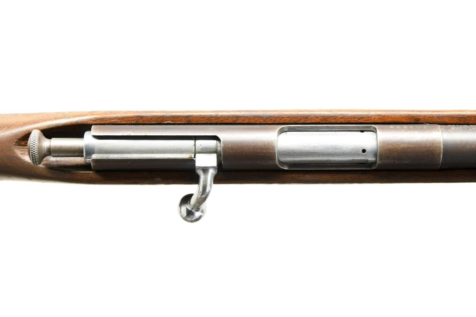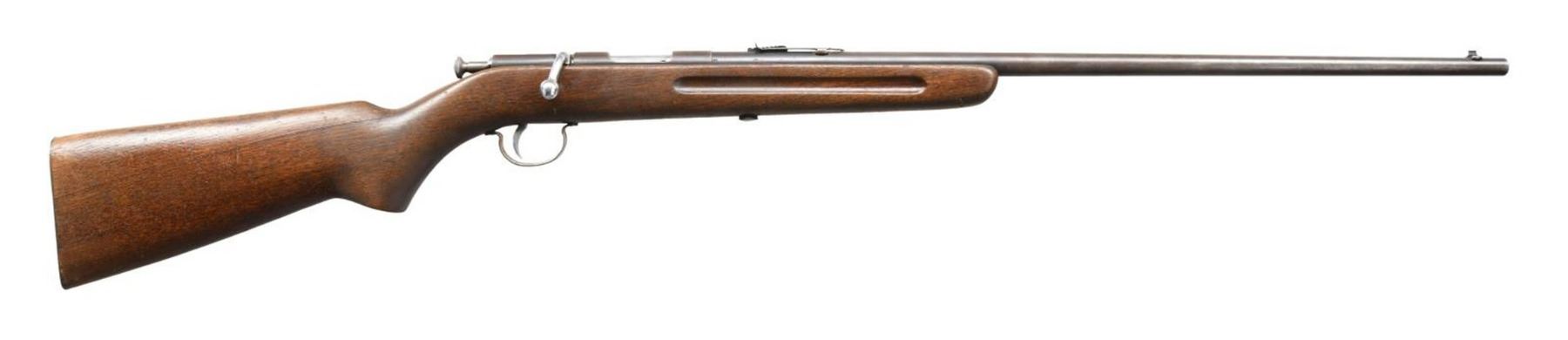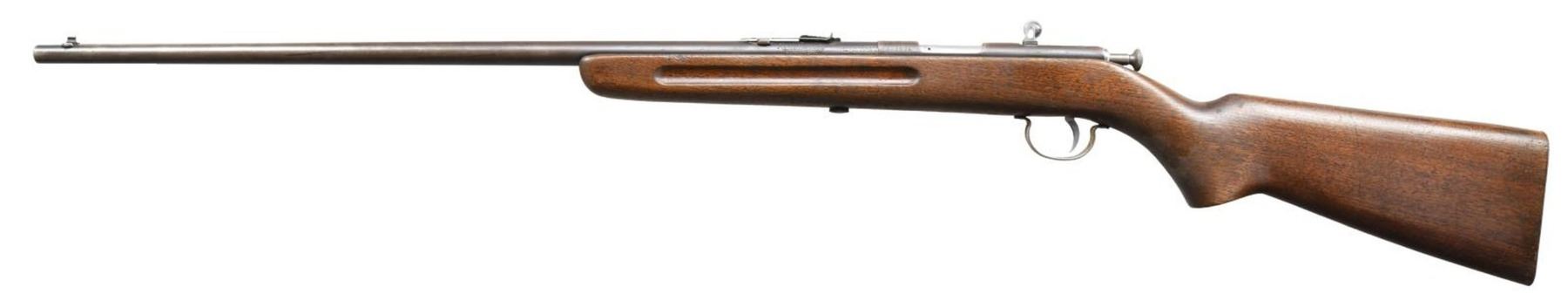 Cal. 22 S, L, LR. S# 203638. Bbl. 24 1/8". Model 33 single shot bolt action rifle mfg. by Remington Arms Co. Top of bbl. exhibits Remington's mfg. information and the model designation, with the Remington trademark logo followed by the cal. designation on the left side towards the breech. Metal components are blued. 1 piece plain wood stock with grasping grooves. CONDITION: metal components retain fair amounts of their original factory blue finish, exhibiting wear and thinning overall that shows through to gray patina. Bright bore, exhibiting strong rifling throughout. Stock exhibits some scattered marks and minor impressions from storage and handling, but otherwise remains sturdy and serviceable. (23-5477/MLW). CURIO. $100-150.