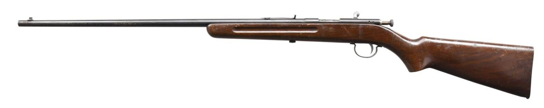 Cal. 22 S, L, LR. NSN. Bbl. 24 1/8". Model 33 single shot bolt action rifle mfg. by Remington Arms Co. Top of bbl. exhibits Remington's mfg. information and the model designation, with the Remington trademark logo followed by the cal. designation on the left side towards the breech. Metal components are blued. 1 piece plain wood stock with grasping grooves. CONDITION: metal components retain large amounts of their original factory blue finish, exhibiting some wear and thinning, with mild surface oxidation overall. Very bright bore, exhibiting strong rifling throughout. Stock exhibits scattered marks and impressions from storage and handling, with a chip at the toe. (23-5537/MLW). CURIO. $100-200.