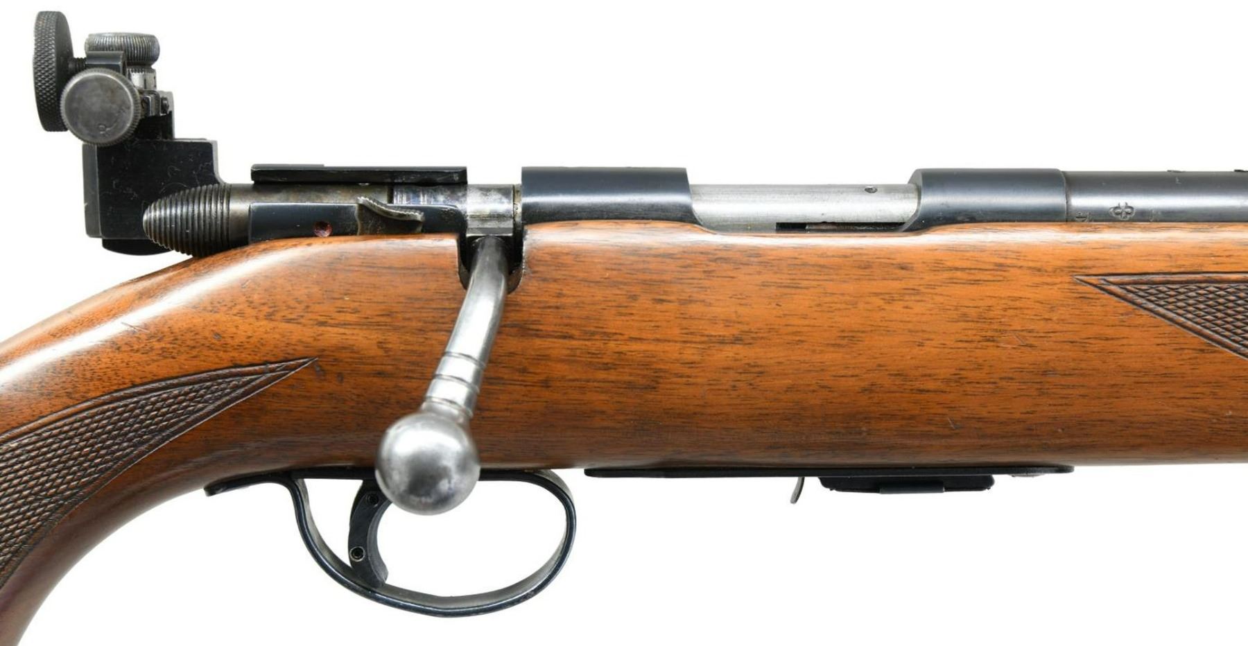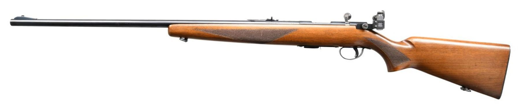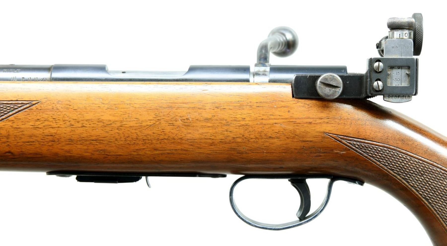 TARGET RIFLE. Cal. 22 LR. S# 99078. Bbl. 27". Model 513-S-A Matchmaster bolt action rifle mfg. by Remington Arms Co. The top of the bbl. is marked with Remington's mfg. information, followed by the cal. designation, with the Remington trademark logo and cal. designation marked on the left at the breech. Metal components exhibit a blued finish. 1 Piece wood pistol grip buttstock with checkered panels at the wrist and forearm. Ramped aluminum bead front sight with dovetailed Marbles U-notch rear sight and Redfield adjustable aperture rear sight. Receiver bridge and bbl. (at breech) have been drilled and tapped. MAGS: 1-6rd. CONDITION: metal components retain the majority of their original factory blue finish, exhibiting some wear and thinning, as well as some scattered flecks of light surface oxidation. Mirror bore, exhibiting well defined rifling throughout. Stock exhibits some scattered marks and minor impressions from storage and handling, but otherwise remains sturdy and serviceable. (23-5464/MLW). CURIO. $150-250.