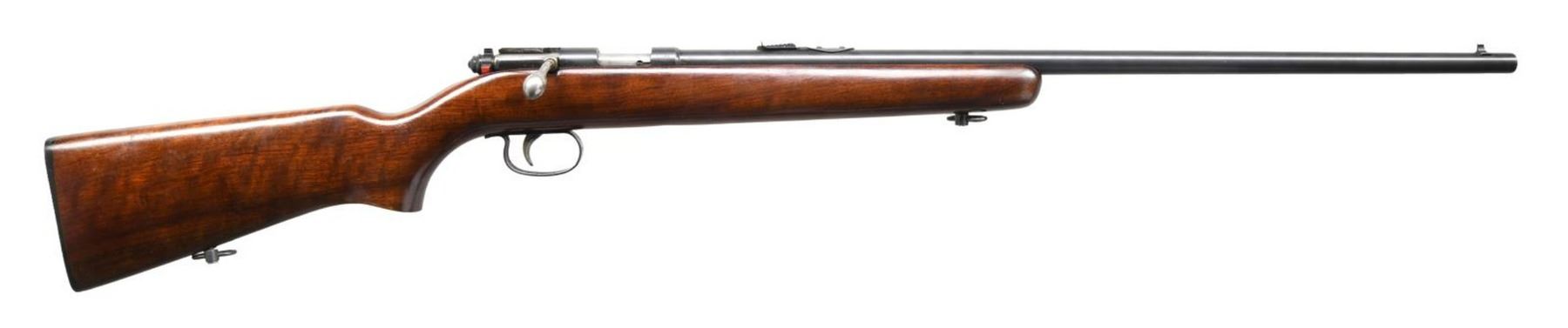 Cal. 22 S, L, LR. NSN. Bbl. 24 3/4". Model 514 single shot bolt action rifle mfg. by Remington. Top of bbl. exhibits Remington's mfg. information, as well as the model and cal. designations. Metal components exhibit a blued finish, with the bolt being in-the-white. 1 piece plain wood pistol grip stock. Blade front sight with U-notch rear sight. Stock is fitted with aftermarket sling swivels. CONDITION: metal components retain the majority of their original factory blue finish, exhibiting flecks of light surface oxidation overall. Mirror bore, exhibiting strong rifling throughout. Stock exhibits some scattered marks and minor impressions from storage and handling, but otherwise remains sturdy and serviceable. (23-5453/MLW). CURIO. $100-150.