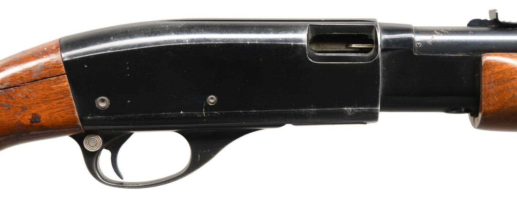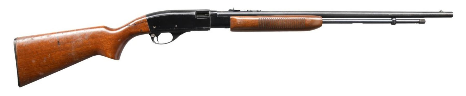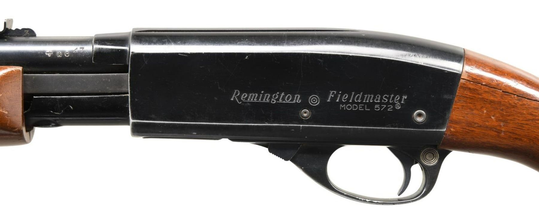 Cal. 22 S, L, LR. NSN. Bbl. 23 1/2". Model 572 Fieldmaster pump action rifle mfg. by Remington Arms Co. The top of the bbl. is marked w/ Remington's manufacturing information, followed by the Remington trademark logo, as well as the model & cal. designations. Left side of receiver exhibits the Remington trademark logo followed by "Fieldmaster/ MODEL 572". Receiver and trigger guard exhibit a black anodized finish w/ the bbl. & mag. tube being blued. Plain wood pistol grip buttstock w/ grooved wood forend. Blade front sight has broken. CONDITION: metal components retain lg. amounts of their original factory finishes, exhibiting edge wear on the receiver w/ some wear & thinning on the bbl. Metal components exhibit some scattered superficial marks from storage and handling. Bright bore, exhibiting strong rifling throughout. Wood furniture exhibits scattered marks from handling and storage, with the buttstock exhibiting a crack on the either side at the wrist that stems from the receiver. (23-5656/MLW). CURIO. $200-300.
