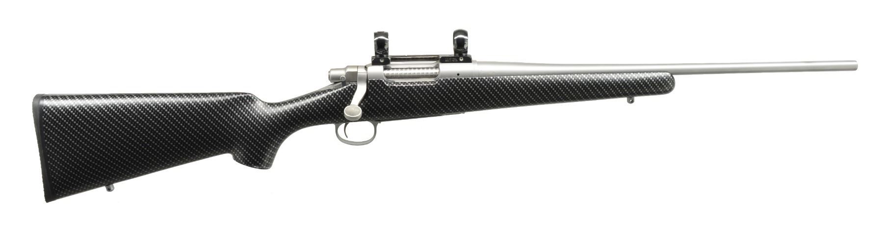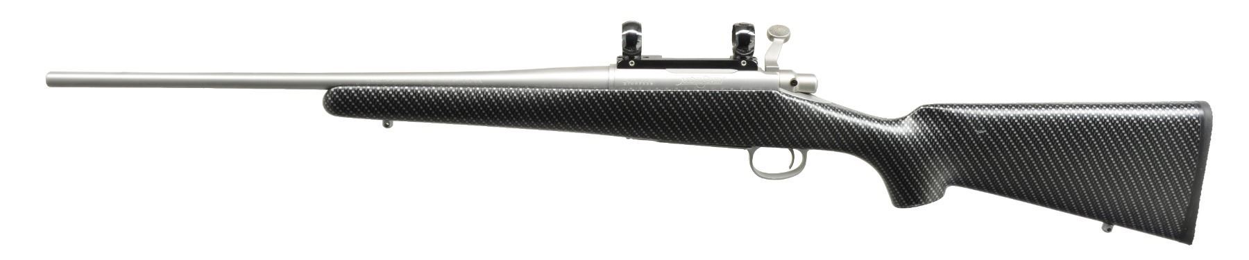 Cal. 243. S# S7647559. This custom shop offering has 20" featherweight bbl. Action marked"Model 7" on left side. Engine turned bolt & bottom metal has hinged floorplate. All metal parts are nickel plated. Conetrol rings & one piece base are installed. Kevlar pistol grip stock w/ interesting basket weave pattern measures 14 1/8"over black Pachmayr rifle pad. CONDITION: very fine w/ only a few minor marks in all surfaces, most notably a 1/8" x 1/4" ding on comb left side. Sharp, shiny bore. Mechanically fine. One scope ring missing its top cap. (20-609/MGM144). MODERN. $1,500-2,000.