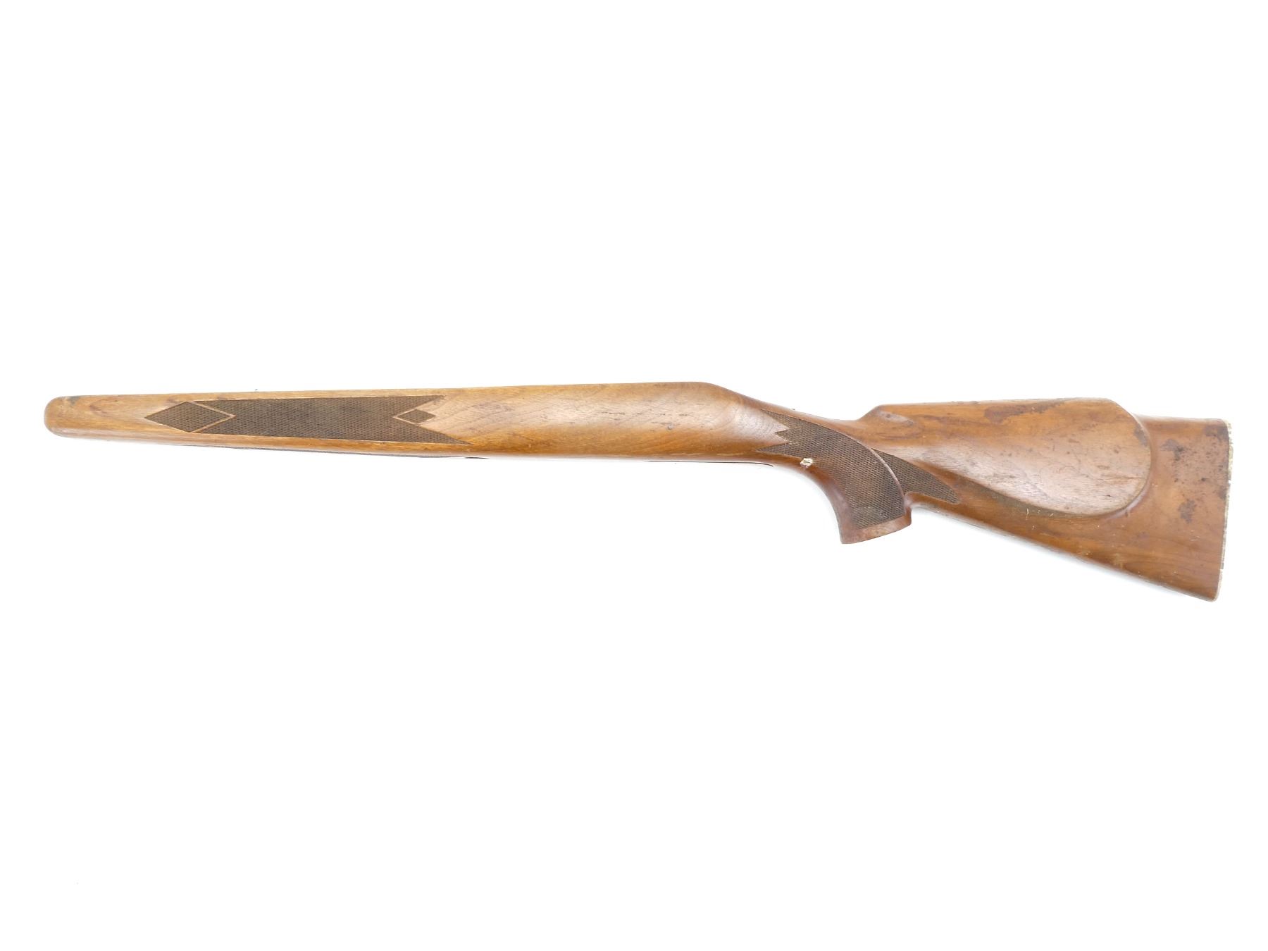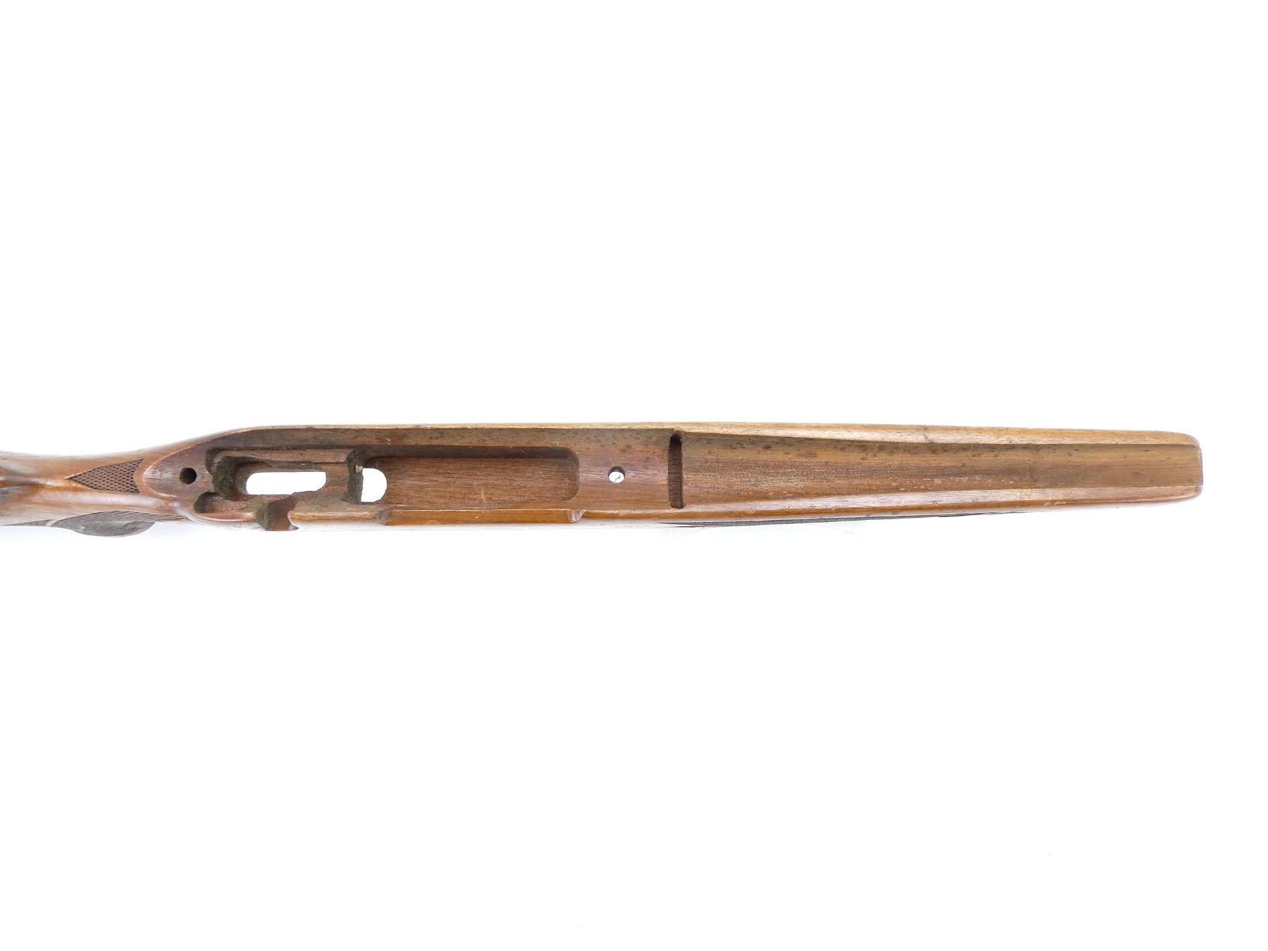 (1) WOODEN STOCK, RIGHT HANDED, CHECKERED, PISTOL GRIP, CHECKERED ALLOY BUTT PLATE, CHEEK REST, BLIND MAG, SHOWS SMALL CHIPS / CRACKS / WEAR, 4" OAL MAG WELL, OAL APPROX. 30.5". MAY REQUIRE FITTING. SEE PHOTOS.