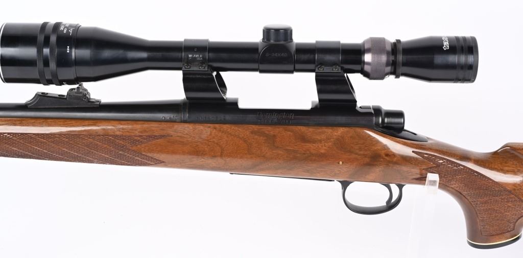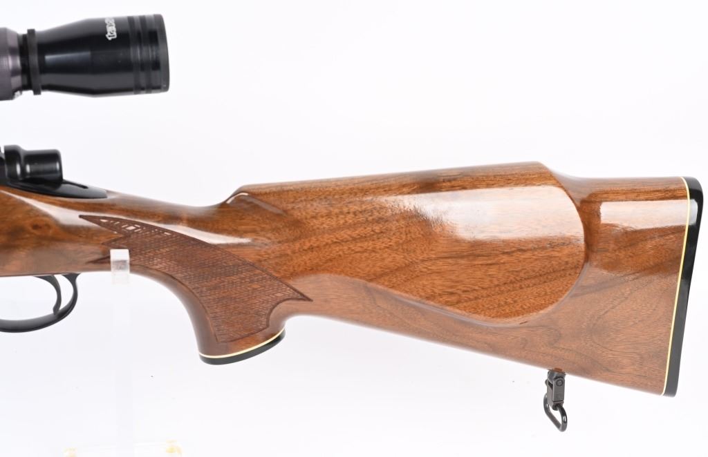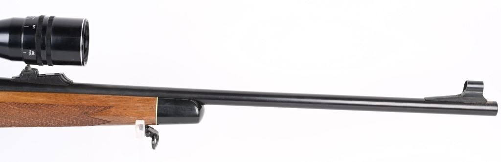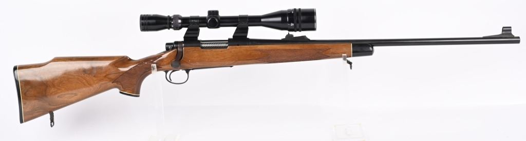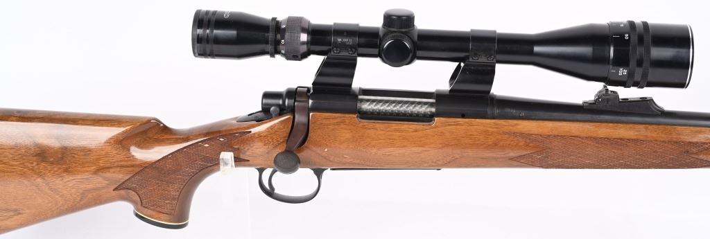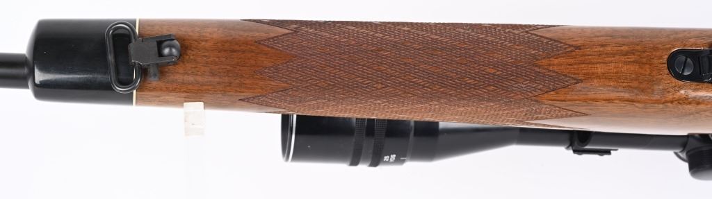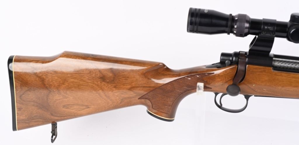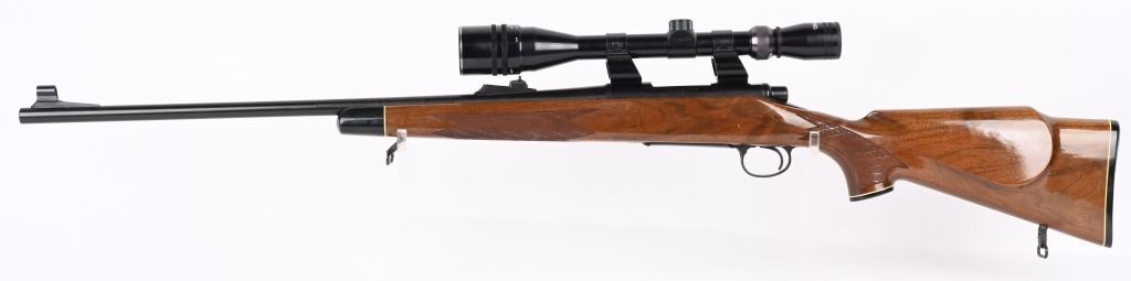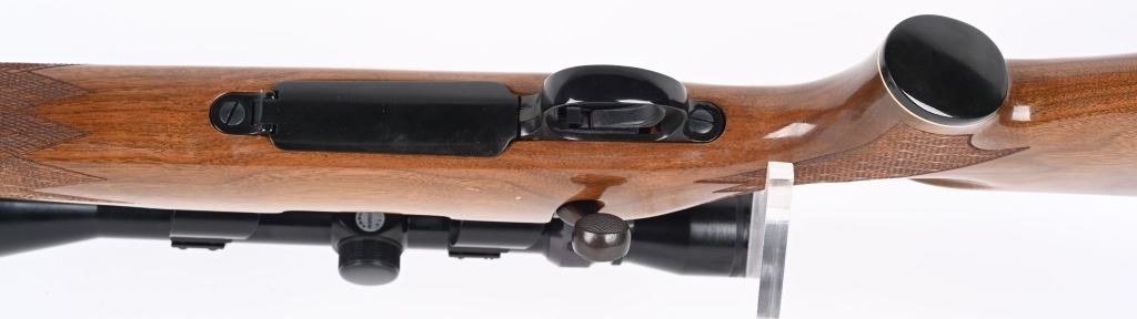 SERIAL NUMBER: C6621310. BARREL: 24". CALIBER: .22-250. MANUFACTURED: 1990. BDL model with standard markings and features. Factory hooded, ramped blade front sight and adjustable u-notch rear, Original blued finish and lacquered wood stock, with fine checkering on the wrist and forearm. Plastic capped pistol grip wood stock and butt plate. Includes attached Tasco 6-24X40 scope. LOP is: 13-1/2". CONDITION: Metal is excellent overall, as is the wood, with both having only a few handling marks. Bore is shiny with crisp rifling. Scope has some light exterior wear. Crisp mechanics. MODERN