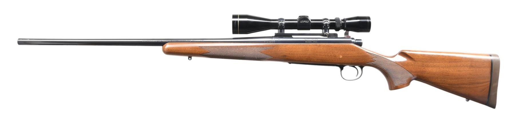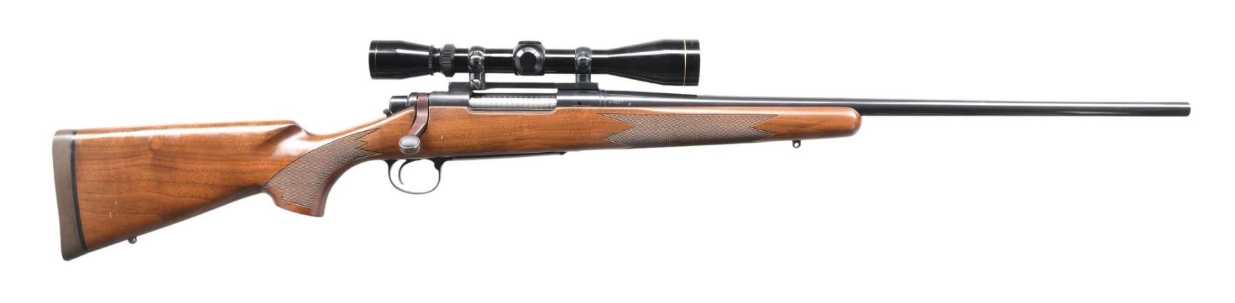 Cal. 264 Win Mag. S# B6789333. Bbl. 24" w/o sights. 2 lug action w/ jeweled bolt body & 2 position safety. Leopold Vari-X 14-12x40. Classic style walnut stock w/ cut checkering, sling swivel bases & original Remington pad. Limited edition, mfg. 1986. CONDITION: 98% blue. Original wood finish shows scattered scratches & marks. Bright near excellent bore. Scope has clear optics, top adj. cap is missing. (24-4295/DS). MODERN. $800-1,100.