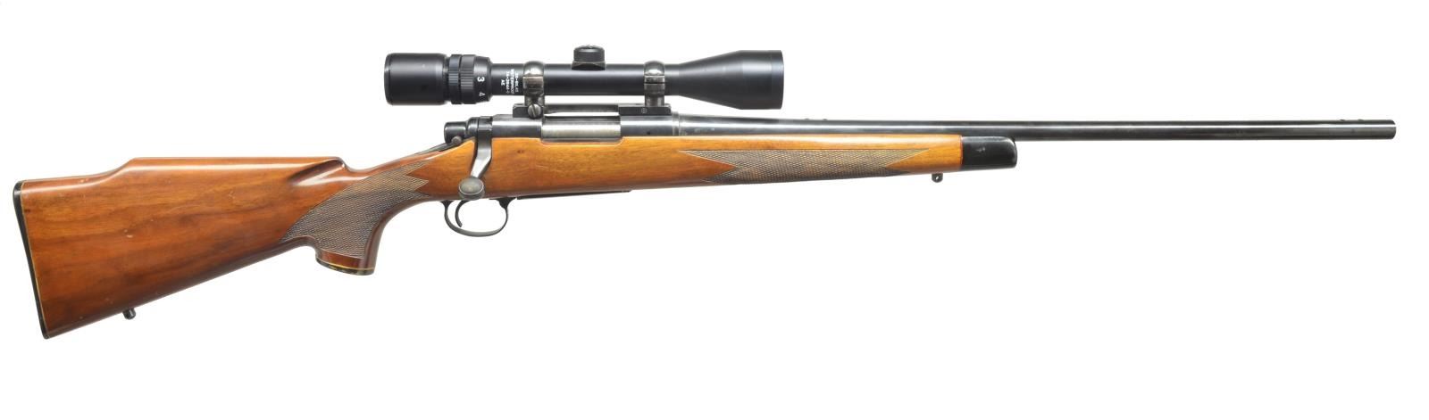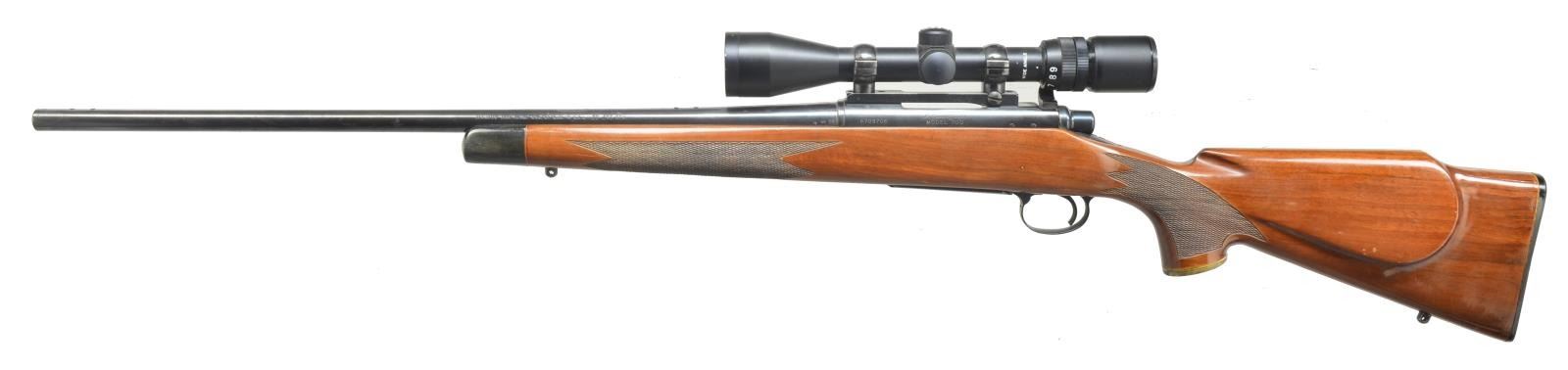 Cal. 22-250. S# 6703706. Bbl. 24" medium weight has Remington markings on left side. Short Remington Model 700 action has engine turned bolt body & alloy bottom metal w/ hinged floorplate. Capped pistol grip American walnut Monte Carlo stock features hard rubber buttplate, grip cap & forend tip w/ white spacers as well as swept right hand cheekpiece & point pattern hand checkering at grip & around forend. Rifle is mounted w/ Bushnell "Sportview" 3-9x scope w/ duplex reticle in Redfield rings & 1 piece base. CONDITION: very good to fine. Metal parts retain over 70% original blue w/ some scattered light pits & marks. Stock retains over 90% original finish which has lightened & is starting to lift on grip cap & forend tip. There are a fair number of scattered marks. Shiny bore. Mechanically good. Ocular lens is loose. (20-3571/MGM). CURIO. $500-700.