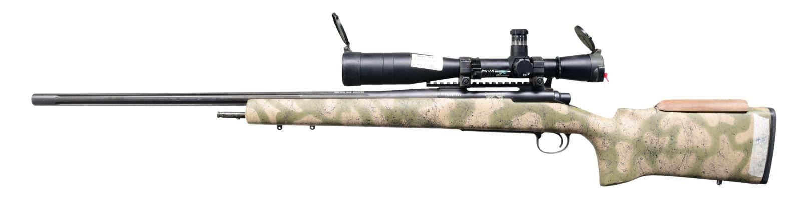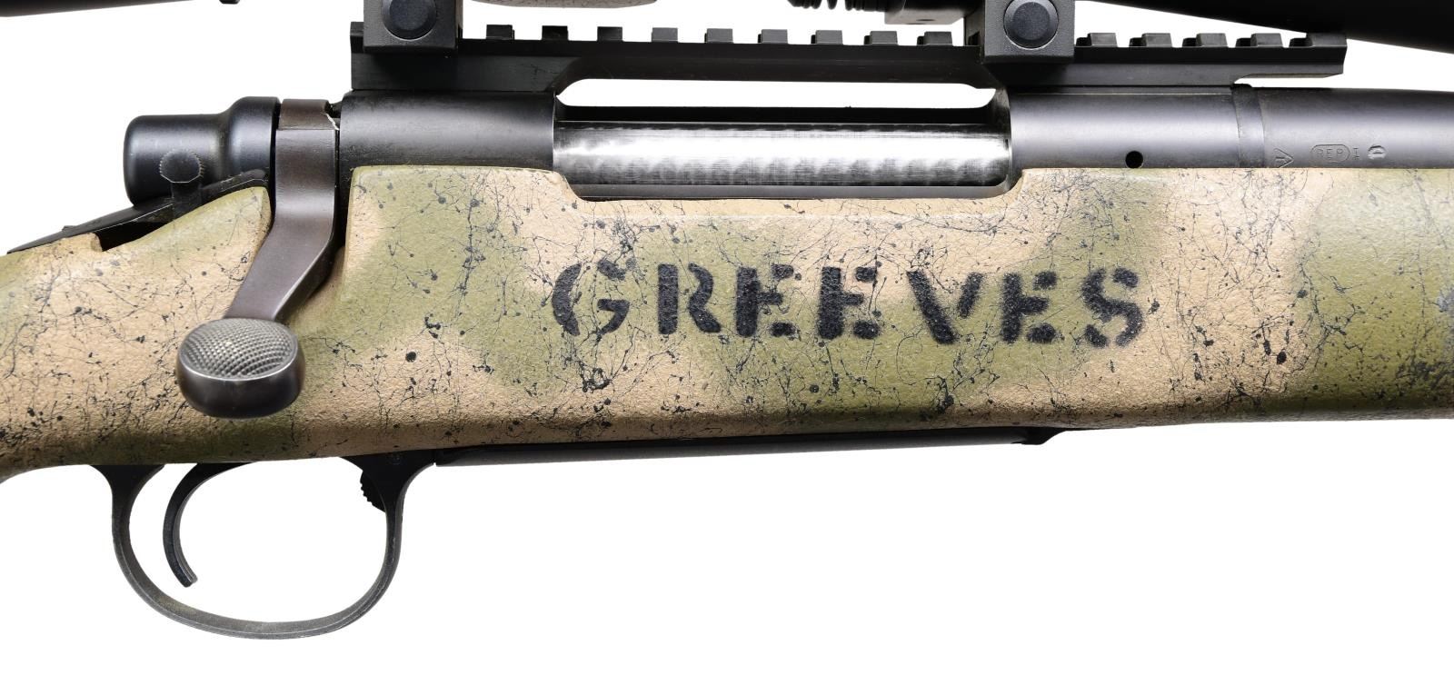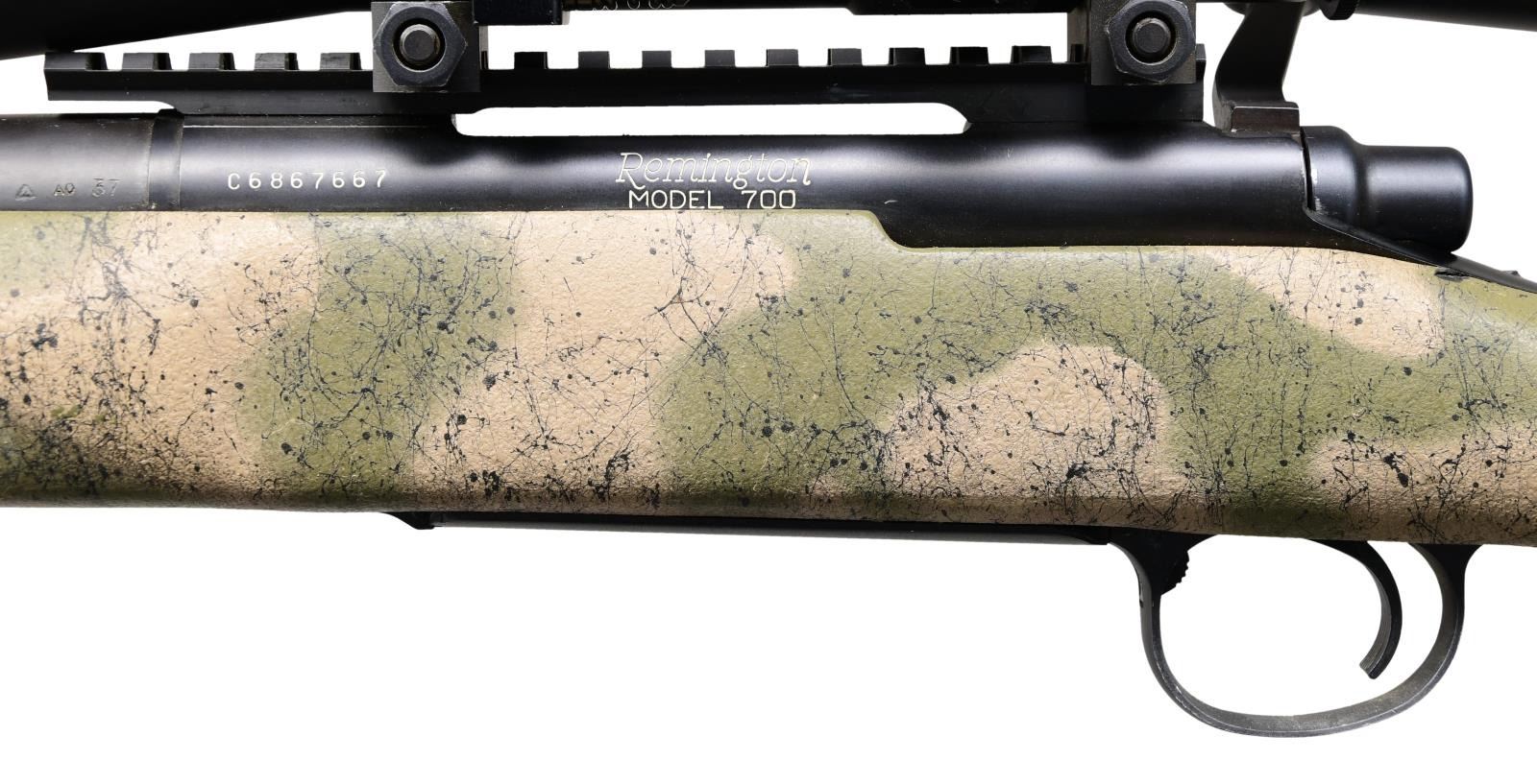 LEUPOLD MARK 4 SCOPE. Cal. 300 Win Mag. S# C6867667. Bbl. 26". Model 700 Sendero bolt action rifle mfg. by Remington. Left side of the fluted bbl. is marked with Remington's mfg. information, followed by "300 WIN. MAG SENDERO", Left side of receiver is marked with the S#, followed by "Remington/ MODEL 700". Metal components exhibit a matte blue finish overall, with the aluminum trigger guard and floorplate exhibiting a matte black finish. Composite pistol grip buttstock features a gray/tan camouflage finish with black spider webbing, and is drilled with with a smooth wood cheek rest on the comb. Right sight of stock is stenciled "GREEVES" in black paint. Receiver is mounted with a Leupold Mark 4 M1 fixed 16x scope. CONDITION: metal components retain the vast majority of their original factory finish, exhibiting some spots of wear, some scattered marks from handling and storage, as well as a few spots of light pitting overall. Mirror bore, exhibiting well defined rifling throughout. Stock is excellent. Scope retains a clear and sharp optic. A nice range ready Remington 700 rifle. (24-2023/MLW). MODERN. $1,200-2,000.