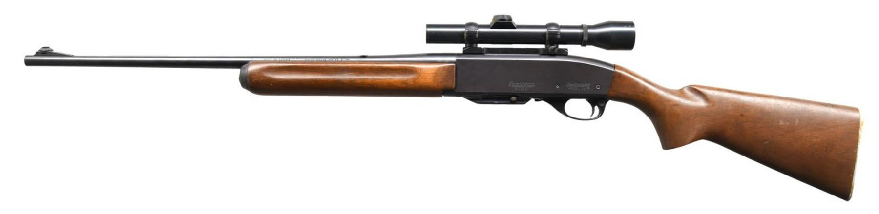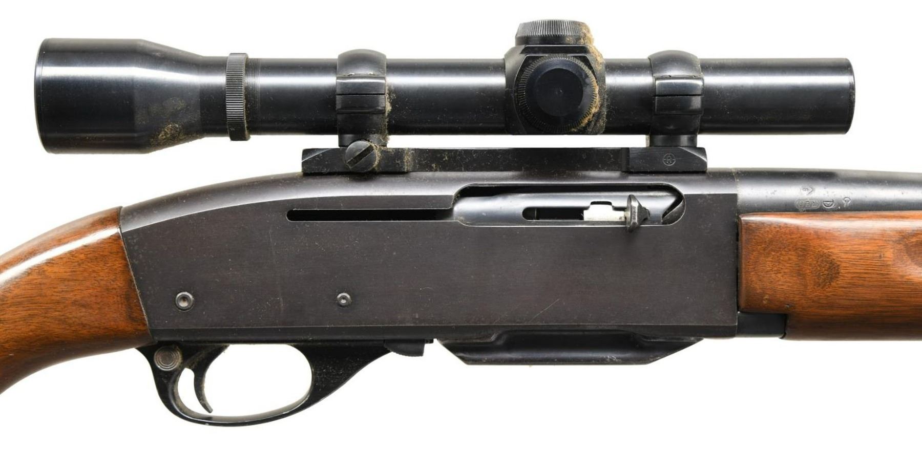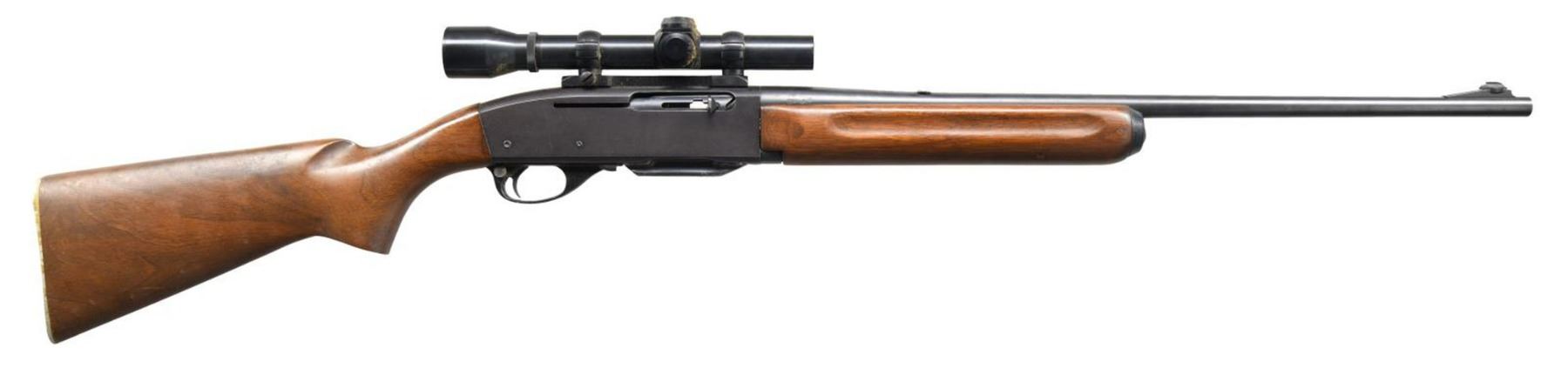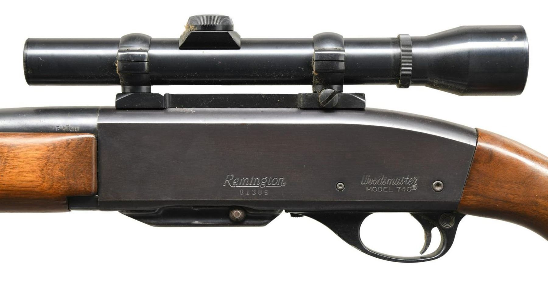 RIFLE. Cal. 30-06. S# 81385. Bbl. 22". Model 740 semi-automatic rifle mfg. by Remington Arms Co. Left side of bbl. exhibits markings stipulating Remington's mfg. information and the cal. designation, with the left side of the receiver exhibiting the Remington trademark logo above the S#, followed by "Woodsmaster/ MODEL 740". Receiver and bbl. are blued, with the aluminum trigger guard exhibiting a black anodized finish. Plain wood pistol grip buttstock and forend. Receiver is mounted with an unmarked scope. MAGS: 1 4-rd. CONDITION: metal components retain the majority of their original factory finish, exhibiting some mild wear and thinning, with areas of light surface oxidation overall. Bright bore, exhibiting strong rifling throughout. Wood furniture exhibits some scattered marks from handling and storage, but otherwise remains sturdy and serviceable. Scope retains a hazy optic. (23-5486/MLW). CURIO. $400-600.