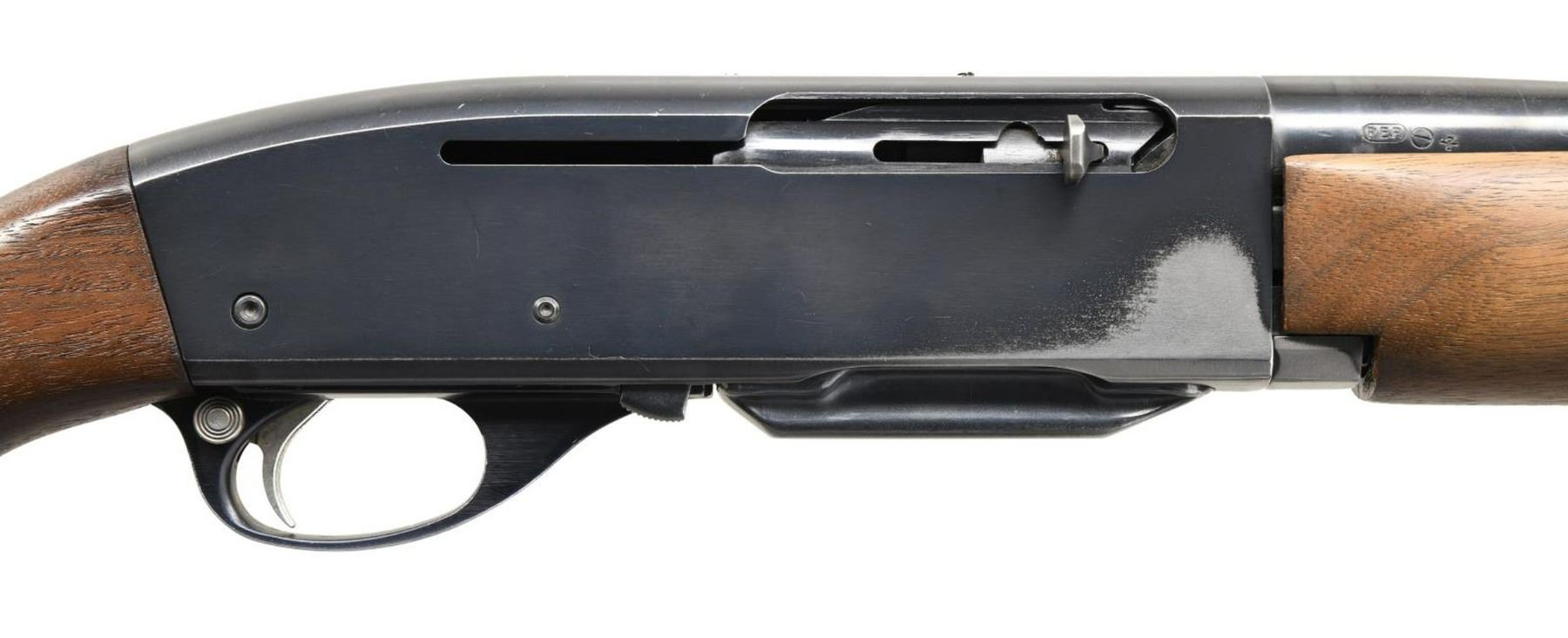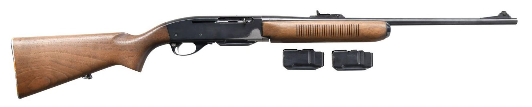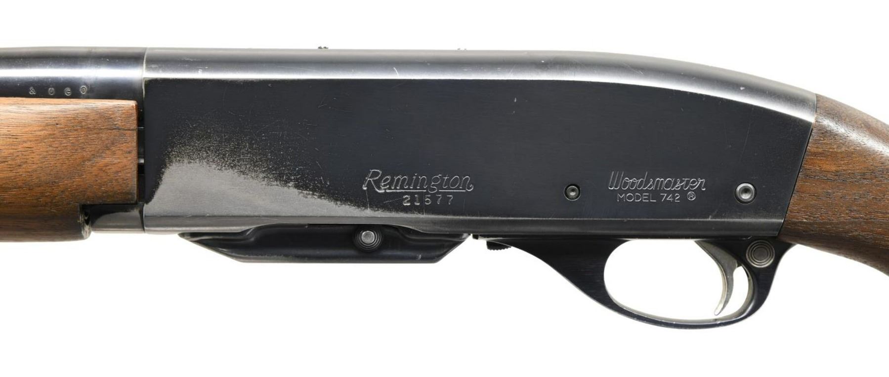 RIFLE. Cal. 308 Win. S# 21577. Bbl. 22". Model 742 Woodsmaster semi-automatic rifle mfg. by Remington Arms Co. The left side of the bbl. exhibits markings stipulating Remington's manufacturer's information & the cal. designation. Left side of receiver is marked w/ the Remington trademark logo above the S#, followed by "Woodsmaster/ MODEL 742". Blued receiver & bbl., w/ black anodized aluminum trigger guard. Plain wood pistol grip buttstock & grooved wood forend. Ramped blade front sight w/ U-notch rear sight. MAGS: 3-4 rd. CONDITION: metal components retain the majority of their original factory blue finish, exhibiting some areas of wear showing through to silvering, as well as some scattered superficial handling marks. Mirror bore exhibits well defined rifling throughout. Wood furniture appears to have been lightly sanded & oiled, showing few marks from storage & handling overall. Left rear side of forend exhibits a crack. (23-5653/MLW). CURIO. $300-400.