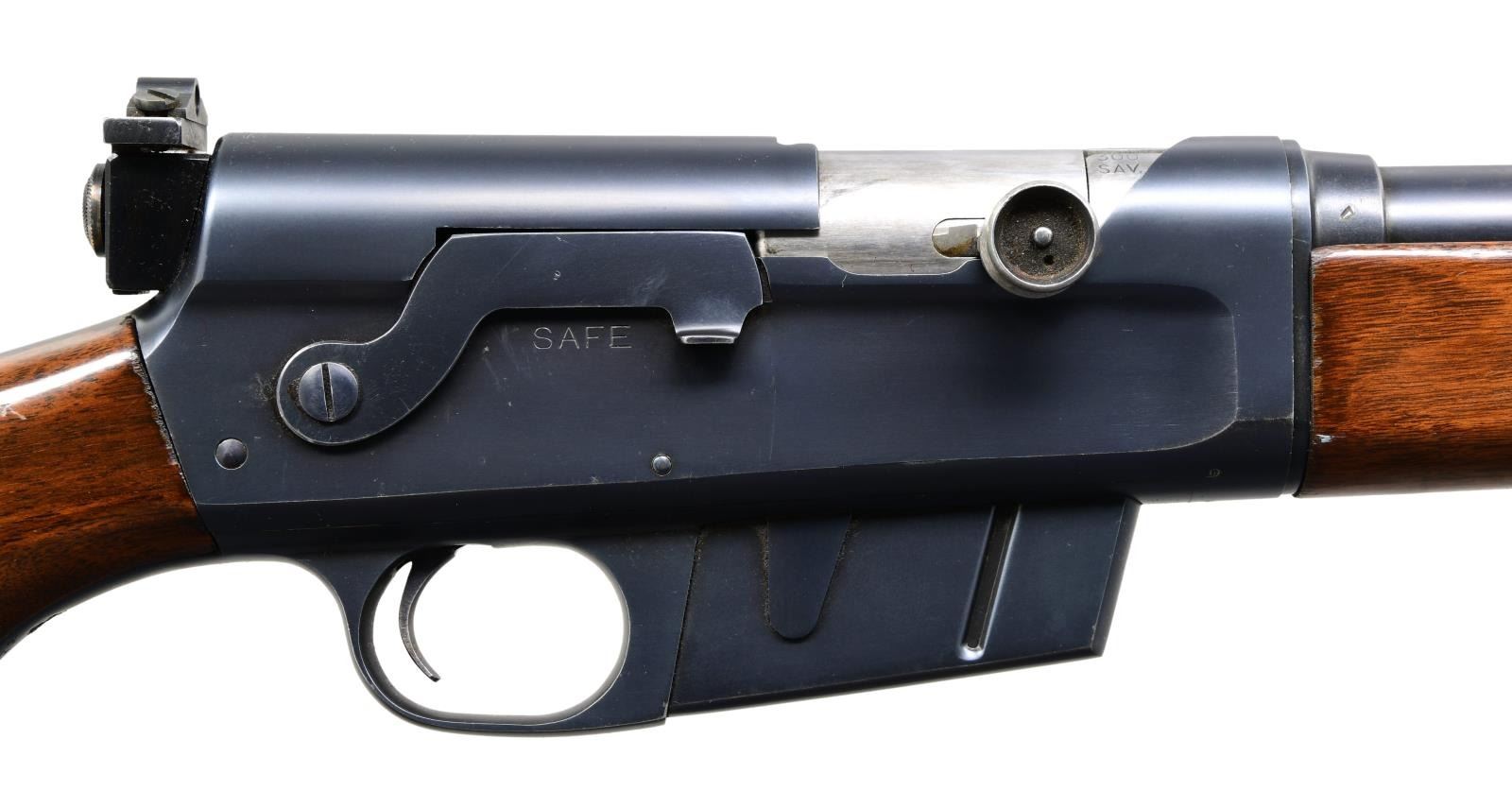 Cal. 300 Savage. S# 18614. Bbl. 22” with Lyman white bead front sight plus Redfield base with Lyman 12S blank at rear; Redfield 102N sight on receiver. Mfg. 1940-1950 in 300 Savage caliber as Woodsmaster being improved version of Model 8. Smooth varnished pistol grip stock set with factory checkered steel buttplate. Fixed 5 rd. magazine. CONDITION: very good overall appearance with original finish. Stock set has light handling marks throughout plus cracked finish on buttstock. Metal finish is very good to excellent with occasional light handling marks. Near excellent bright shiny bore with sharp rifling. (24-2151/NW). CURIO. $750-1,000.