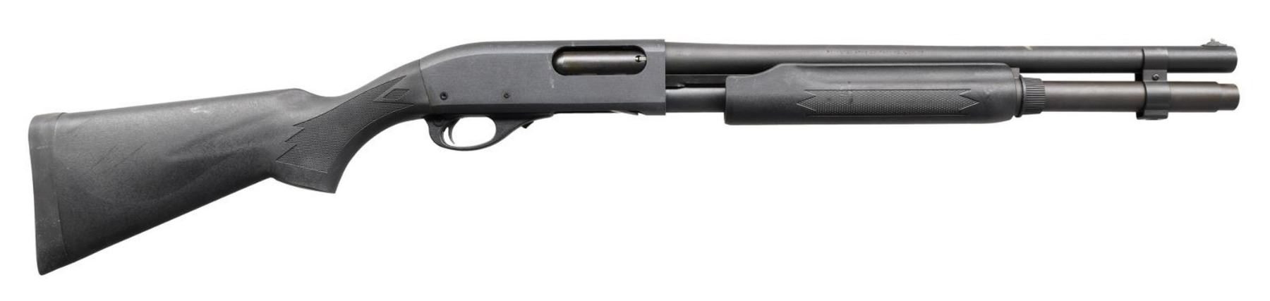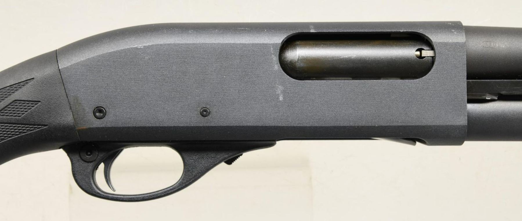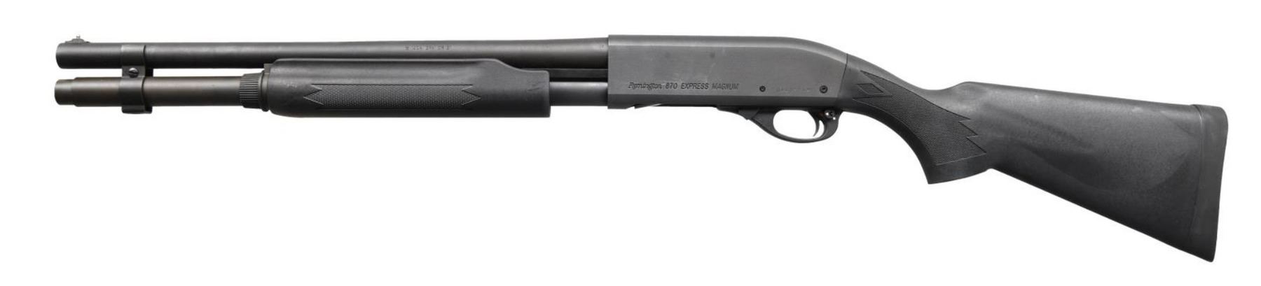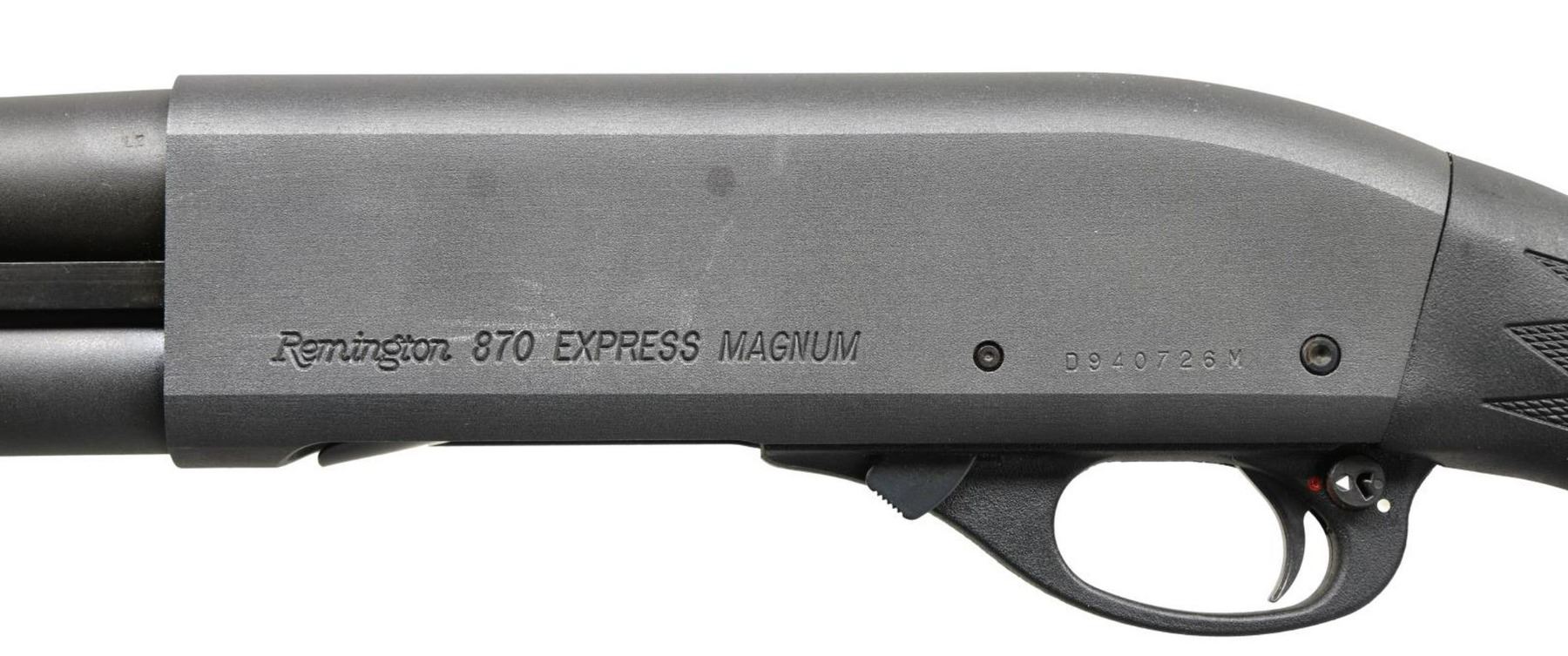 SHOTGUN. Cal. 12 Ga., 2 3/4" & 3". S# D940726M. Bbl. 18 1/4". Model 870 Express pump action shotgun mfg. by Remington. The left side of the bbl. is marked with the cal. designation, with Remington's mfg. information on the right. Left side of receiver is marked "Remington 870 EXPRESS MAGNUM" followed by the S#. Metal components exhibit a matte gray finish. Black checkered polymer pistol grip buttstock and pump. Aluminum bead front sight. CONDITION: metal components retain the majority of their original factory finish, exhibiting some small concentrated spots of wear that show through to light silvering. Mirror bore. Polymer furniture shows some light superficial marks from handling and storage, with the right side of the pump exhibiting a few small spots of marring to the checkering. PROVENANCE: The Collection of Gun Sport Ltd owned by Jon R. Thomas. (23-3719/MLW). MODERN. $300-500.