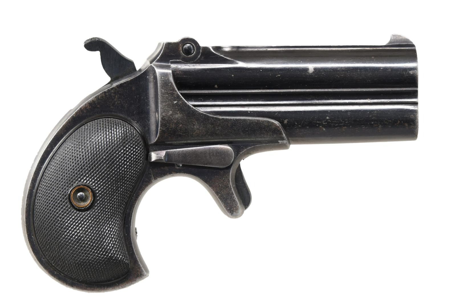 Cal. 41RF. S# 898. Bbls 3". Top flat marked "REMINGTON ARMS CO ILION, N.Y". Full blue metal finish. 2 Piece checkered hard rubber grips. CONDITION: metal retains 90% original blue with thinning wear and scattered peppery oxidation. Very good grips show light flattening to diamonds. Very good bores show scattered spots of light pitting. (23-5046/BH). CURIO. $450-650.