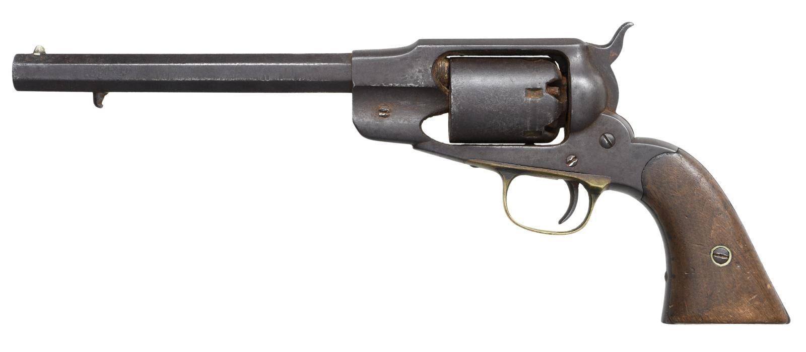 Cal. .36. S# 19103. Bbl 7 3/8". Dark gray patina w/ brass trigger guard and 2 piece smooth wood grips. Homemade front sight w/ frame notched rear sight. Loading lever is not present. CONDITION: Metal components exhibit a heavy dark gray patina w/ areas of pitting and surface oxidation overall. Dark bore. Grips show scattered marks from handling and storage w/ some minor losses at the corners. (01-23511/MLW). ANTIQUE. $100-200.
