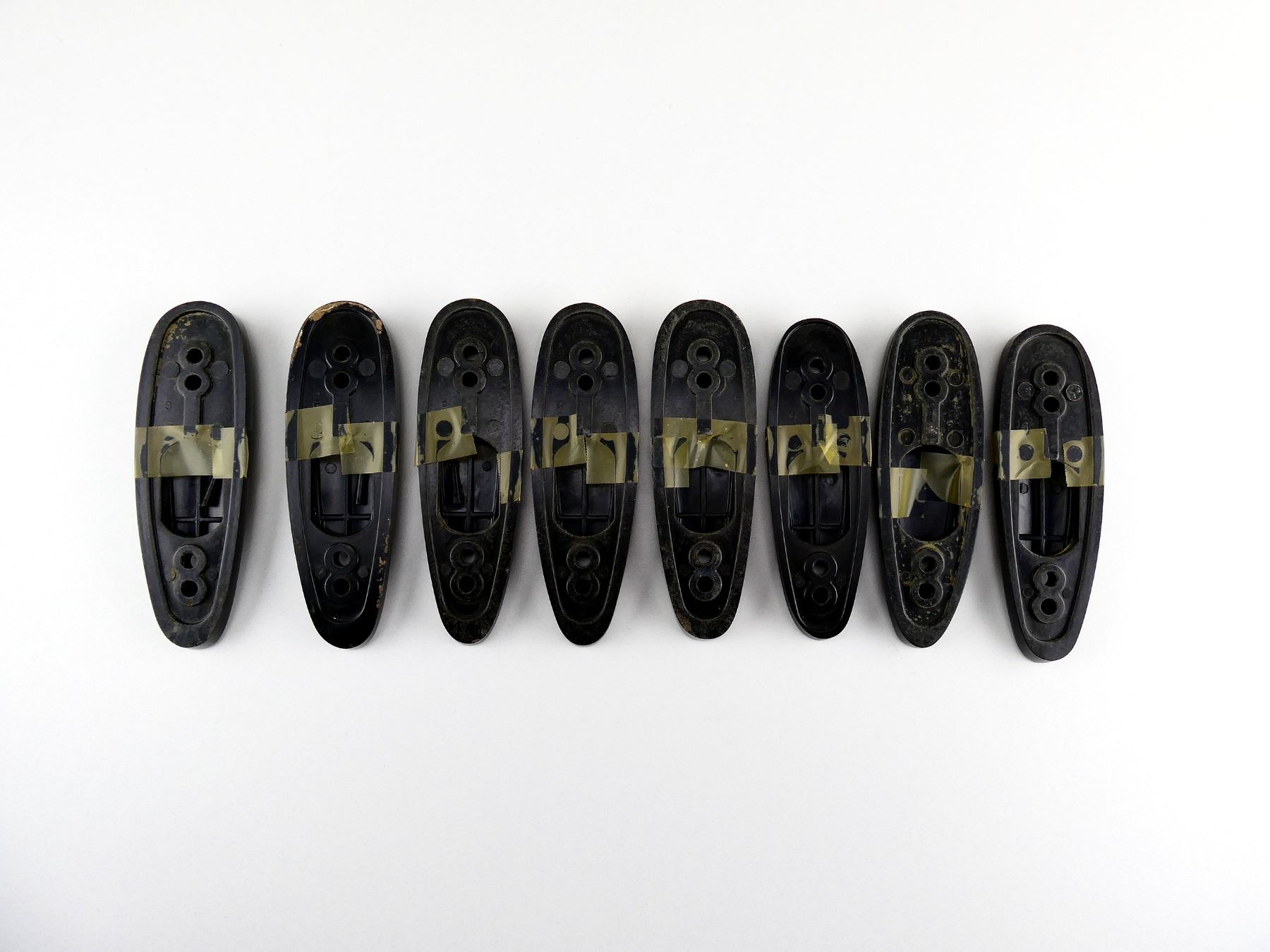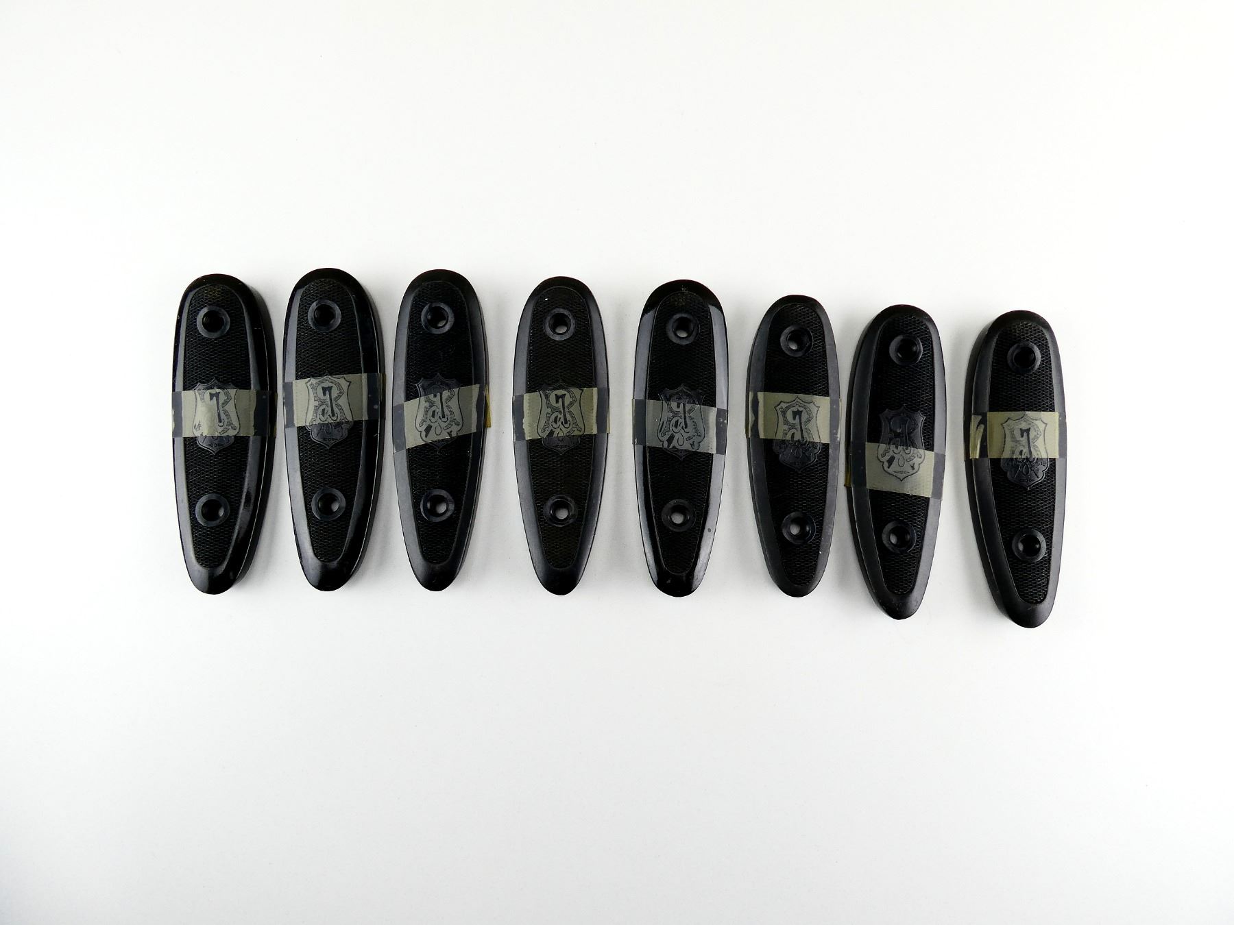 LOT INCLUDES; (8) NEWER STYLE 2-PIECE BLACK POLYMER BUTT PLATES. MAY REQUIRE FITTING. SEE PHOTOS.