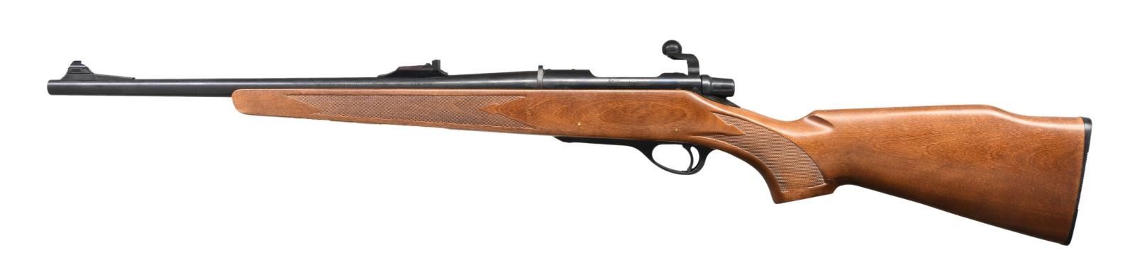 Cal. 243 Win. S# A6340509. Bbl. 18 1/2". Ramp-mounted bead front sight with U-notch adj. rear sight. Action features a dogleg bolt handle, side safety, & nylon trigger guard / floorplate. Monte Carlo pistol grip hardwood stock with pressed checkering and original buttplate. Promotional model rifle, 94,920 mfg. 1971–79. UNATTACHED ACCESSORIES: original box serial numbered to the rifle. Box contains an instruction folder & hunter's pocket guide. CONDITION: near new, appears unfired. Bright, near-excellent bore. (23-6797/DS). CURIO. $600-1,000.
