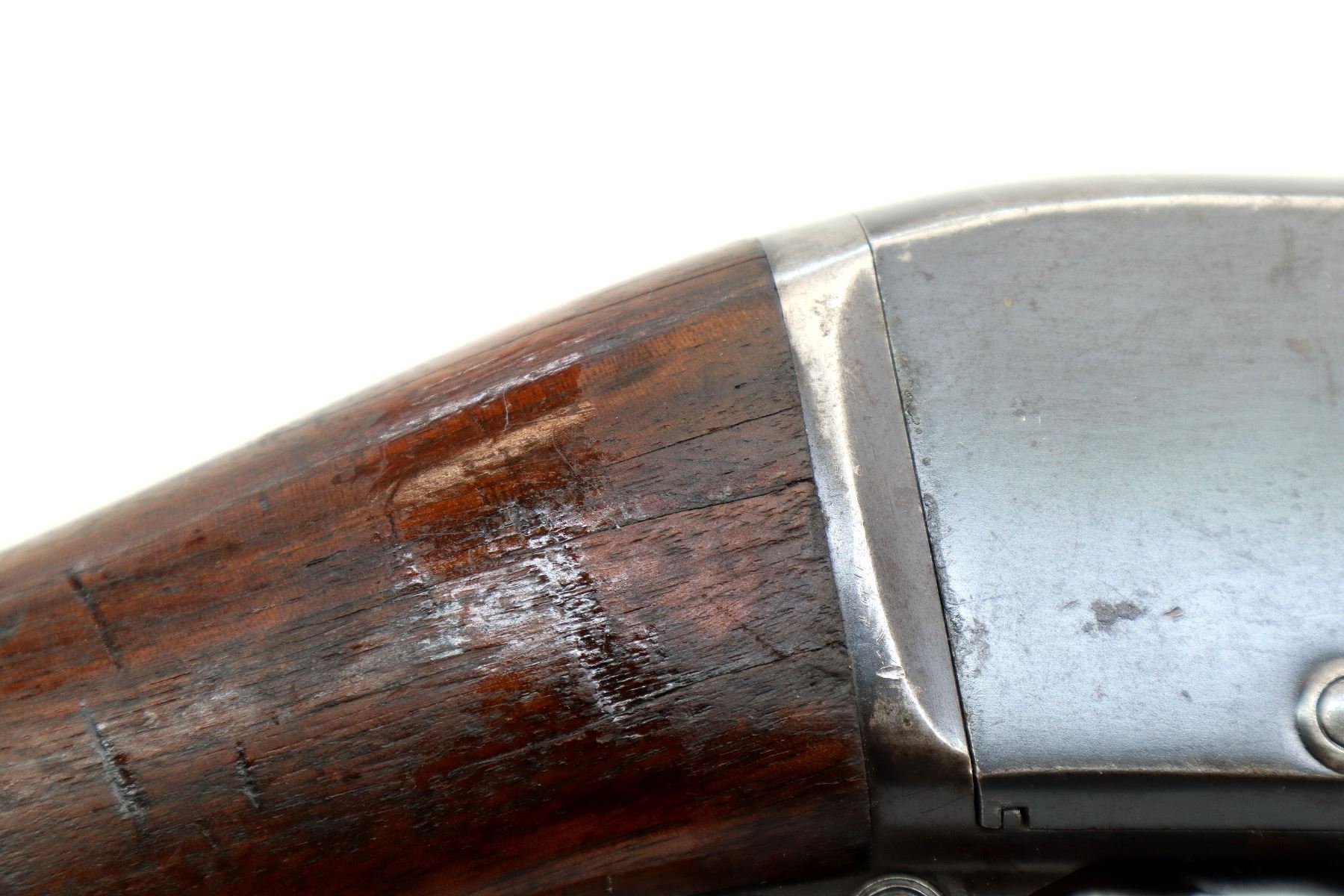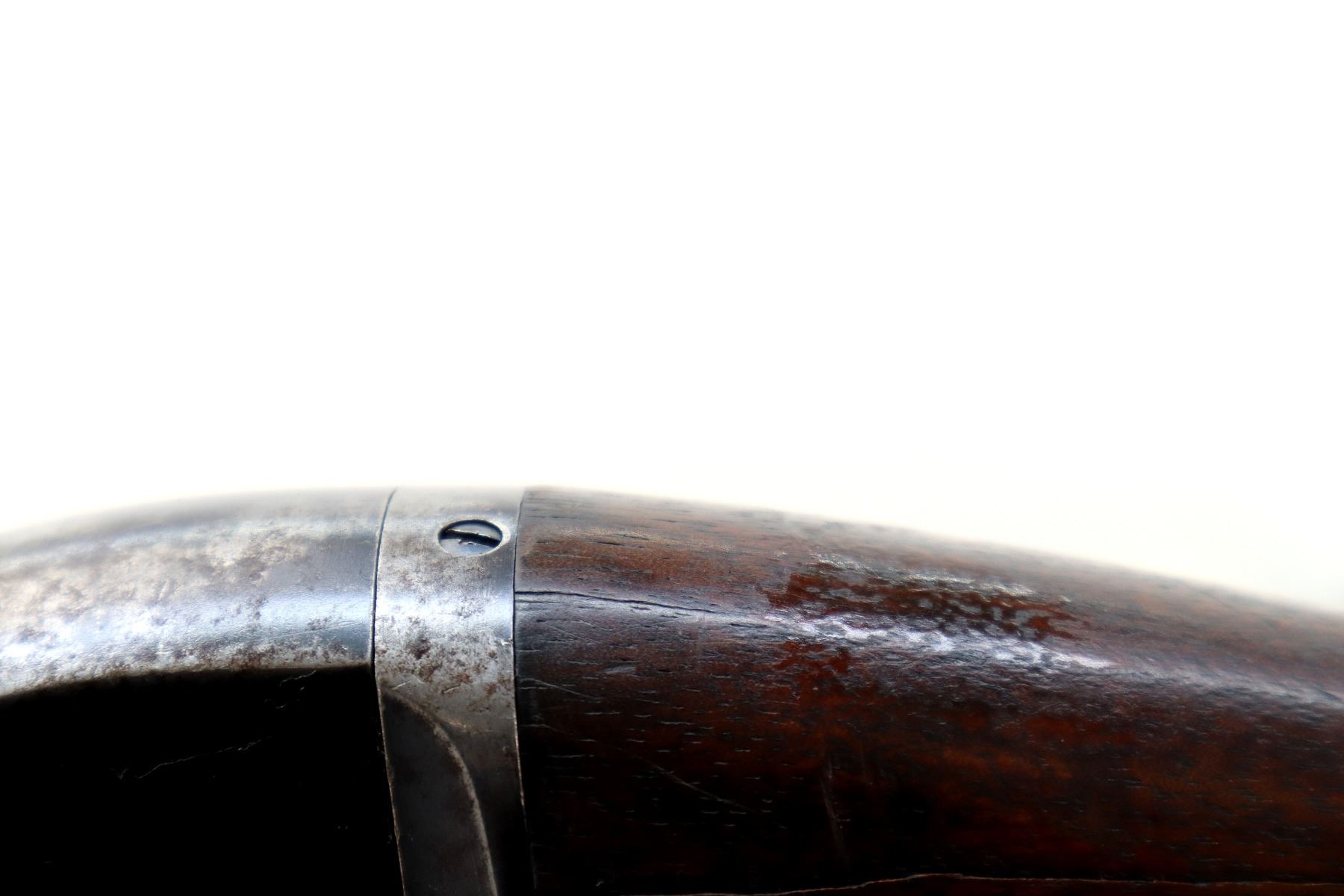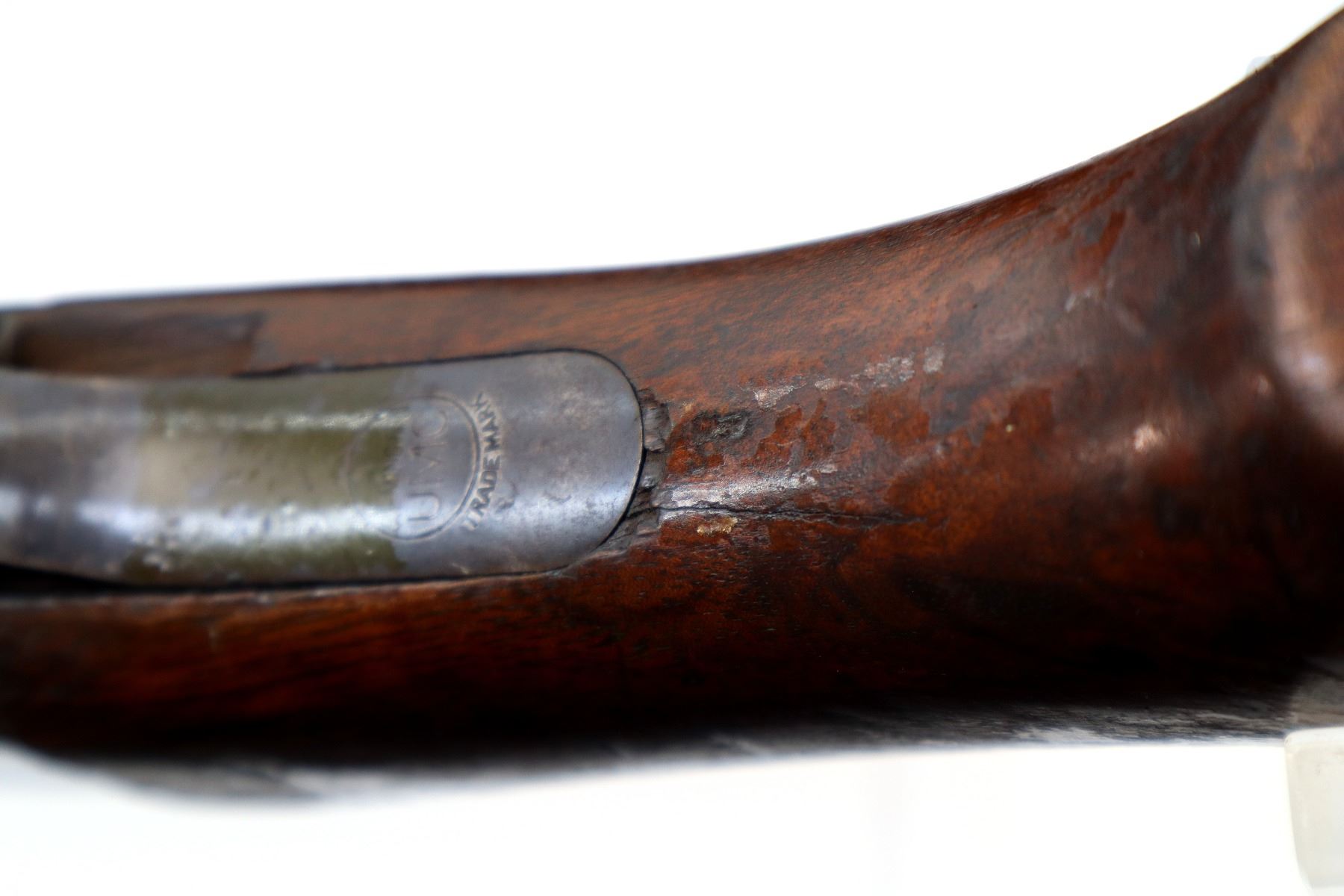 Main Description: This rifle has Crossed Flags with DCP on the barrel indicating Dominion of Canada Possibly used for Prison of War Guards. Missing front and rear sights dovetail present, blued finish. Two piece wood stocks, grooved forearm missing one screw, has pistol grip chipped and cracked behind receiver, missing butt plate and screws.
