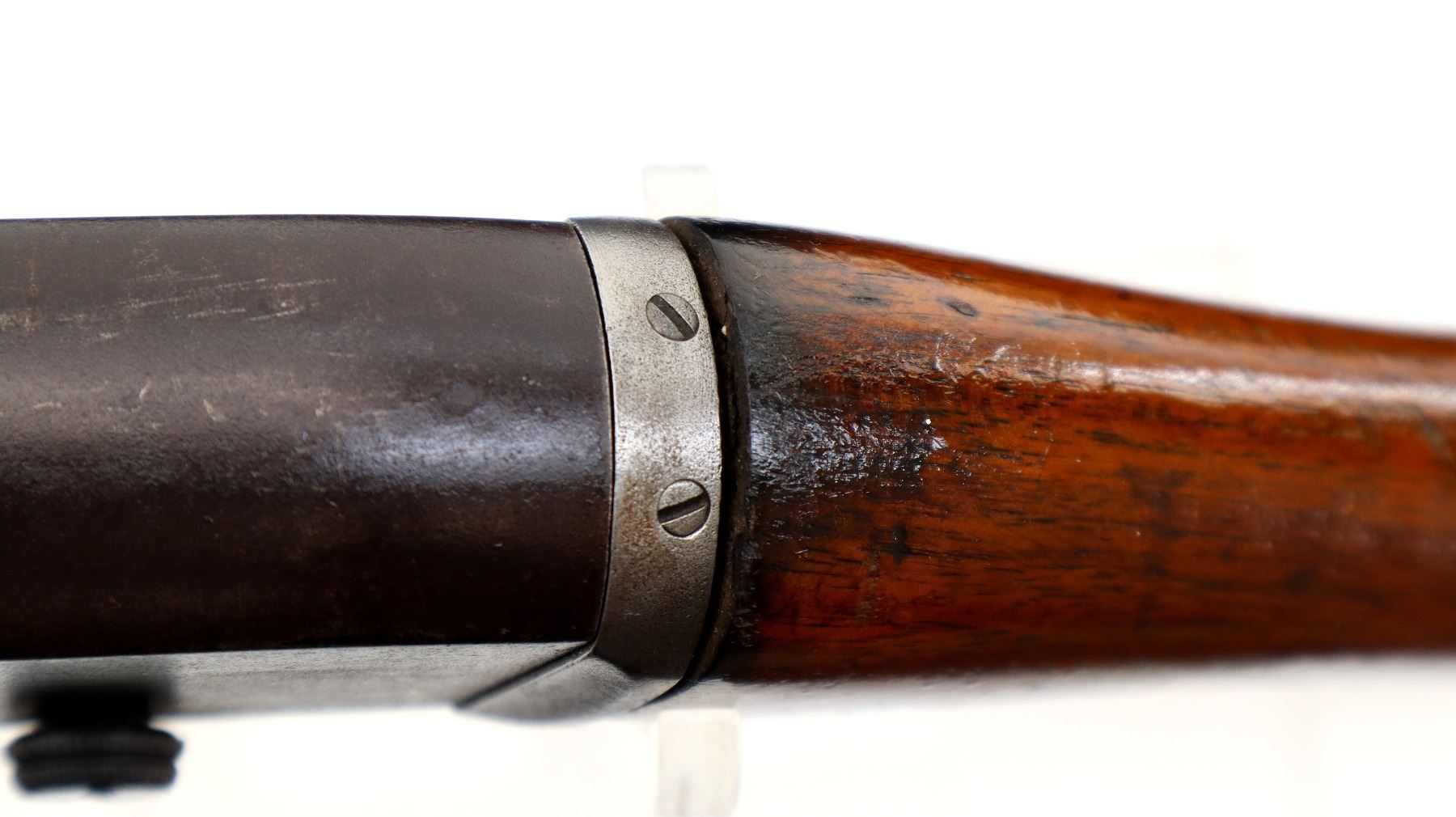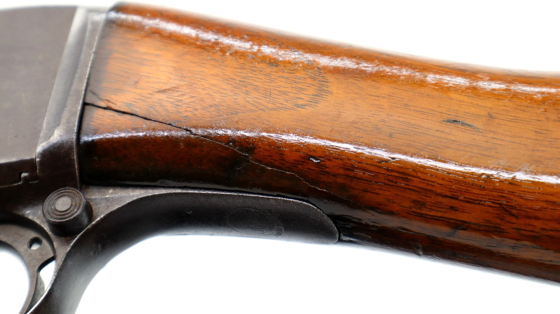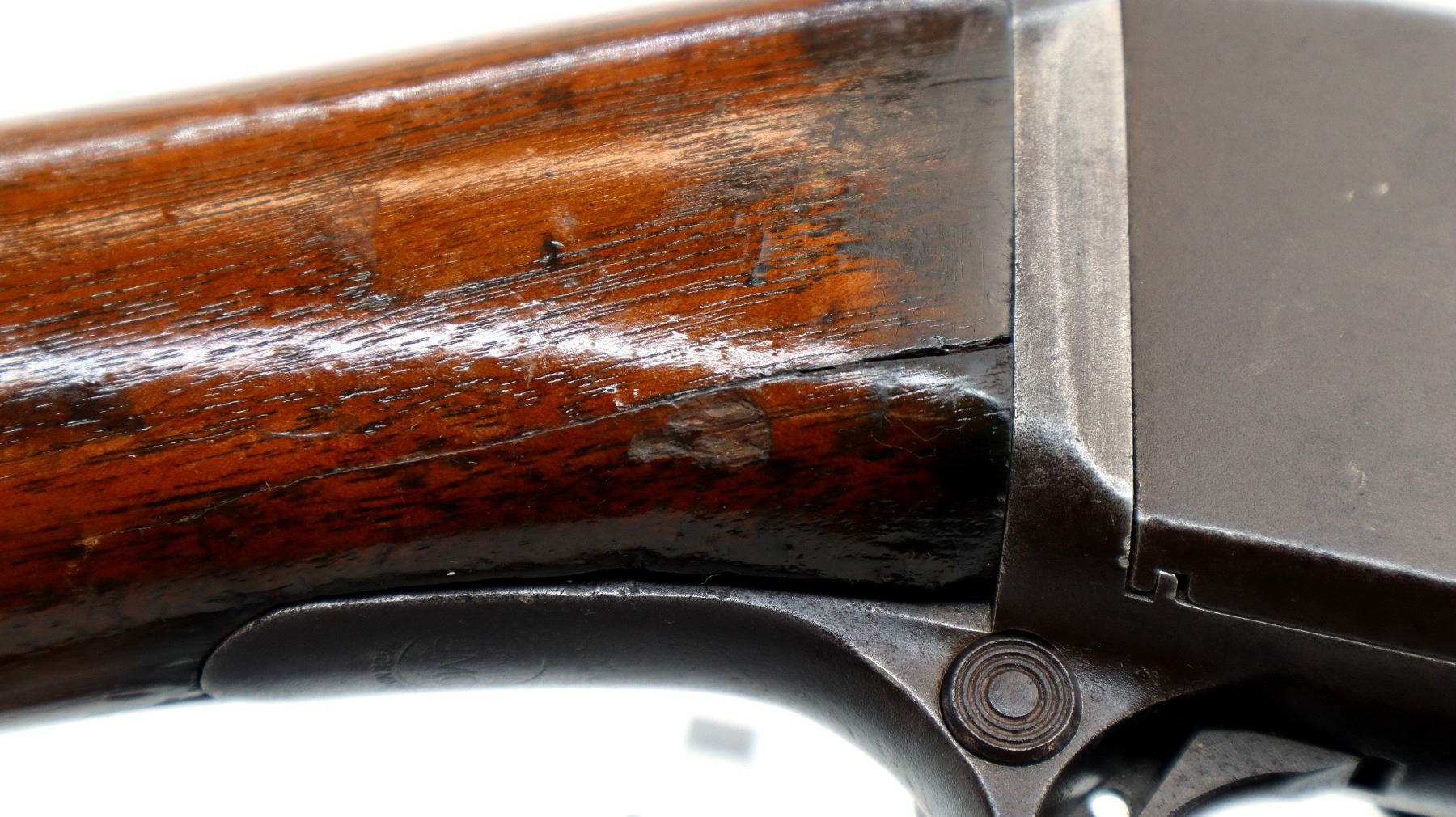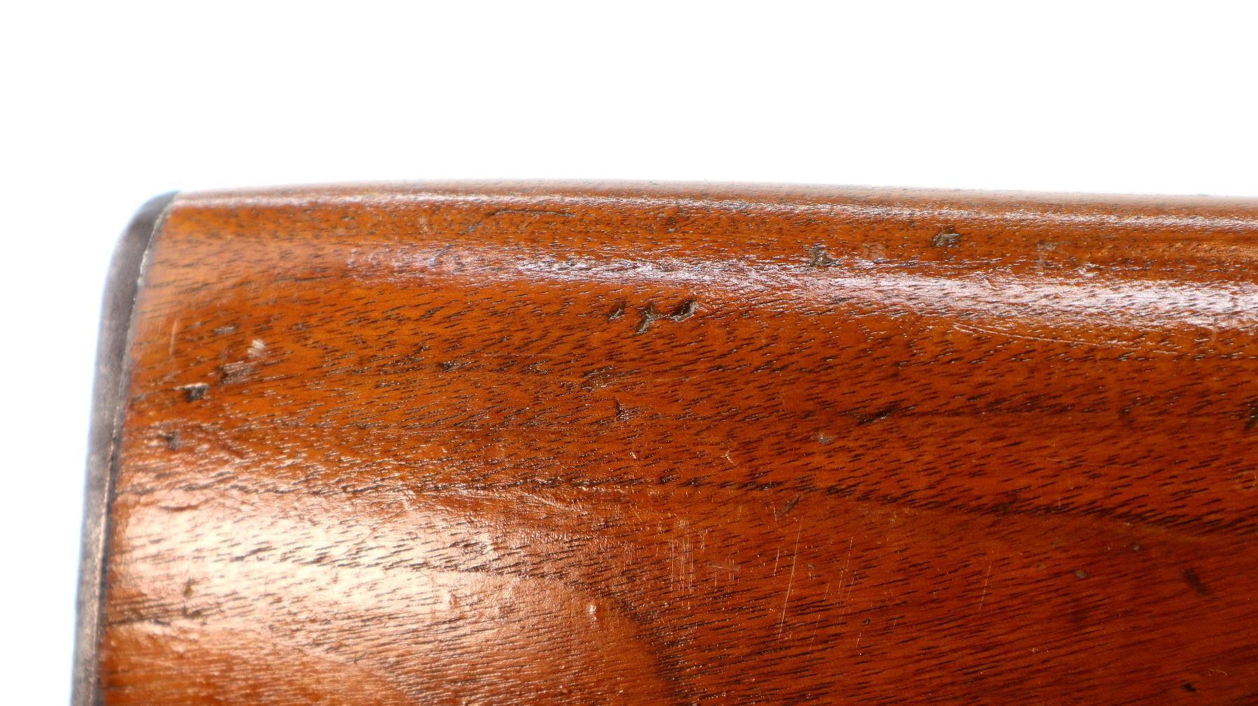 Main Description: Blade front sight, original adjustable u notched rear sight. Two piece wood stocks, grooved forearm, straight grip which is chipped, cracked and loose behind receiver, checkered steel butt plate.