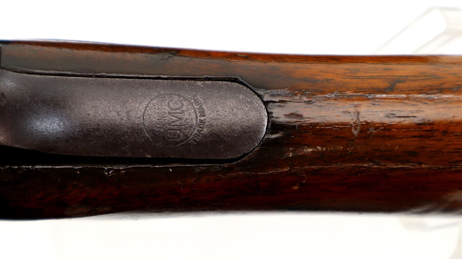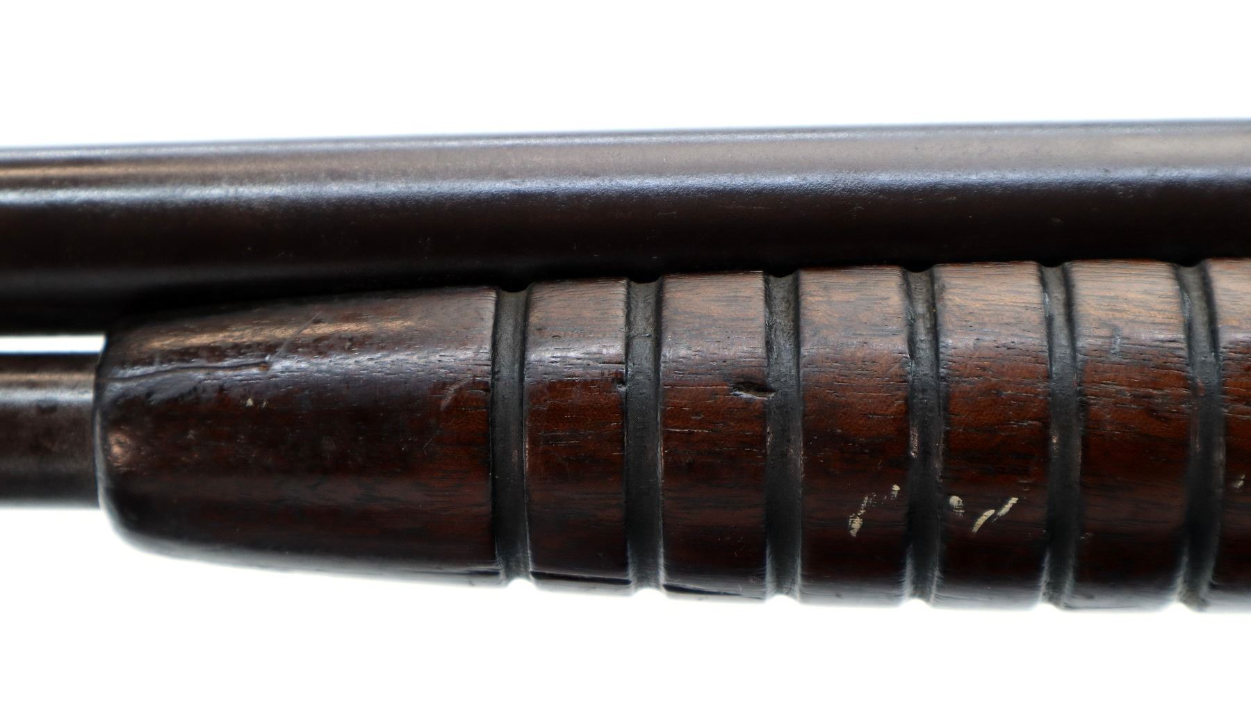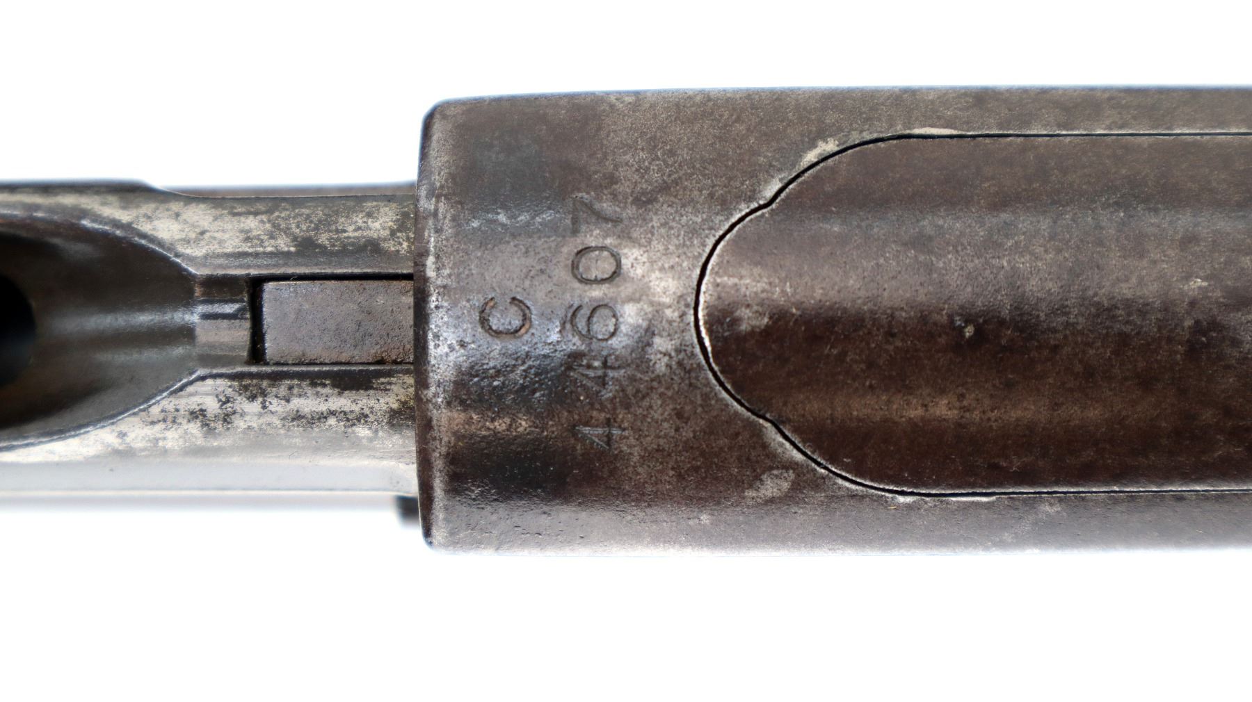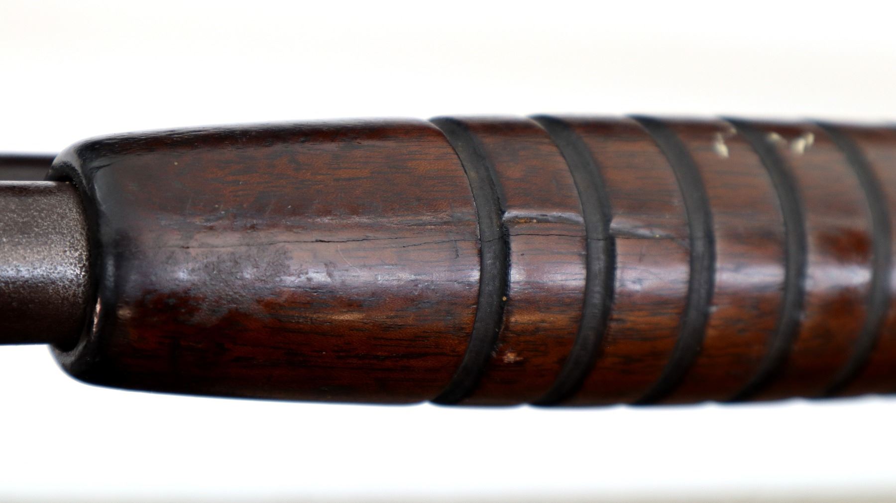 Main Description: Blade front sight, original adjustable u notched rear sight. Two piece wood stocks, grooved forearm, straight grip which is chipped, cracked and loose behind receiver, checkered steel butt plate.