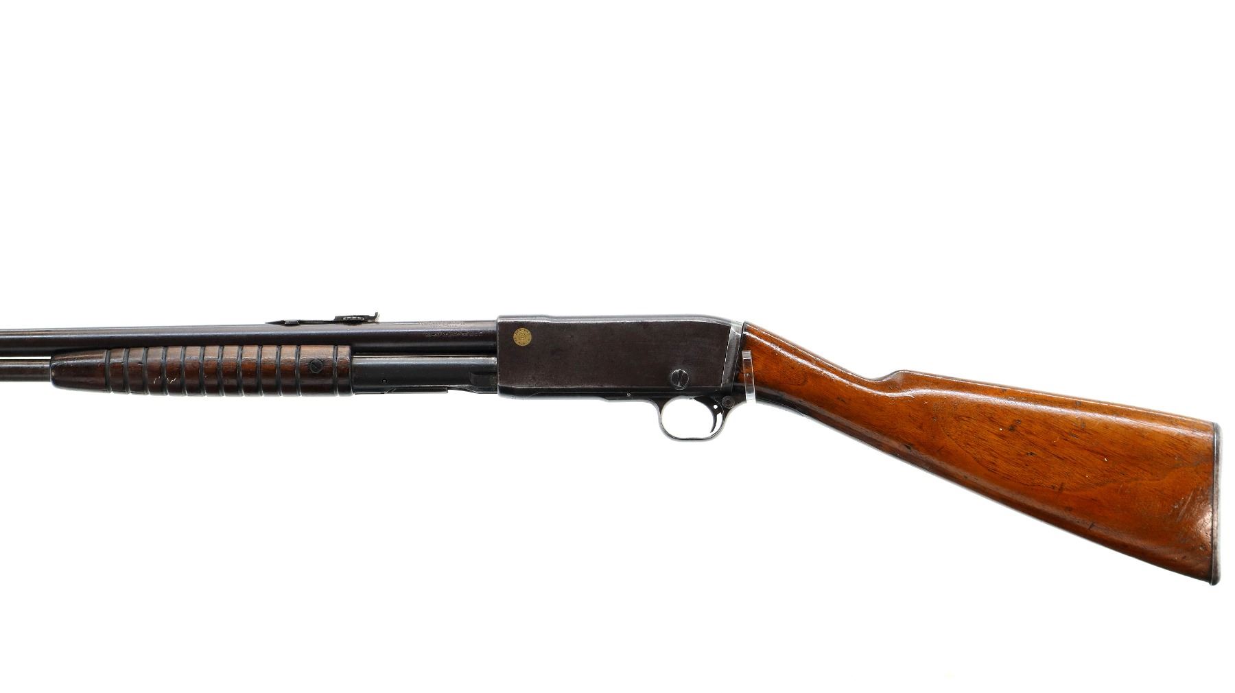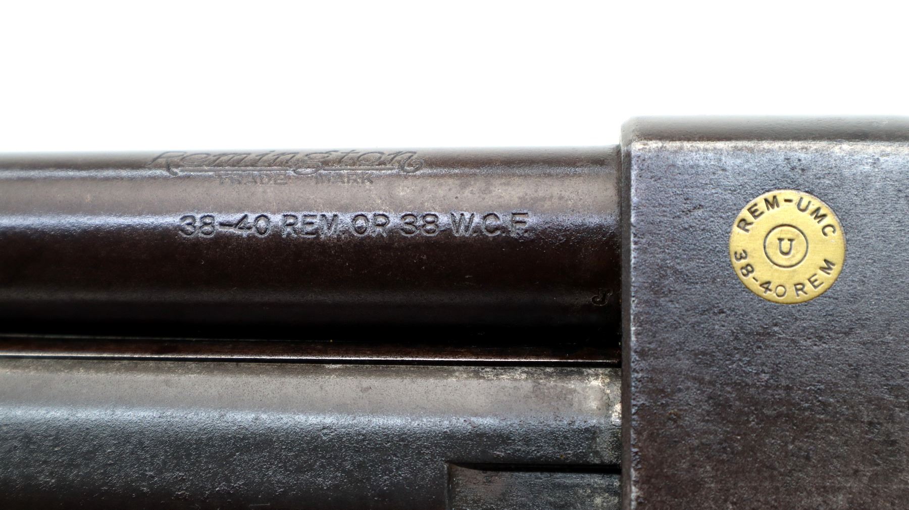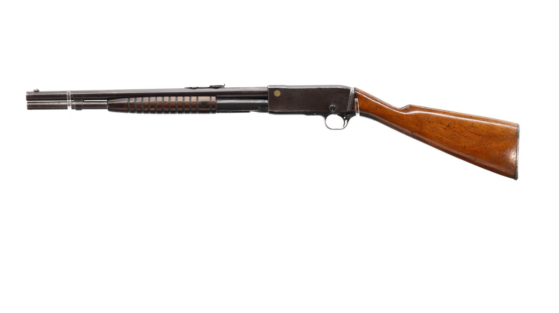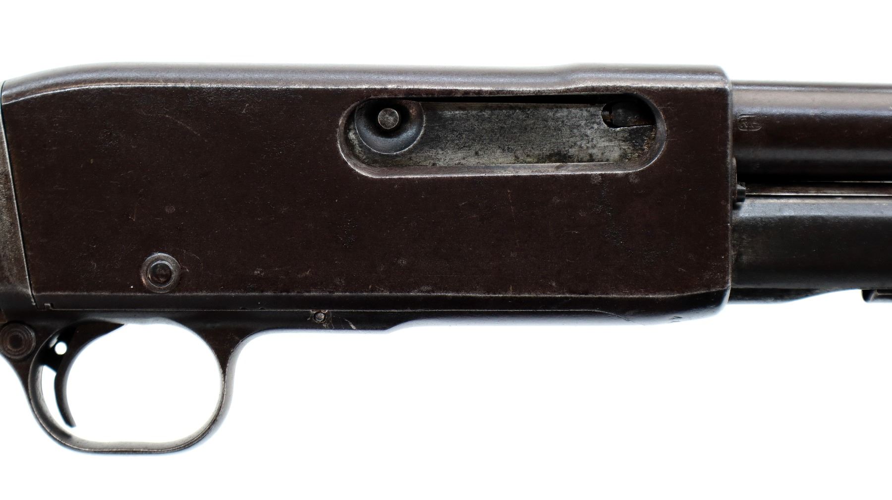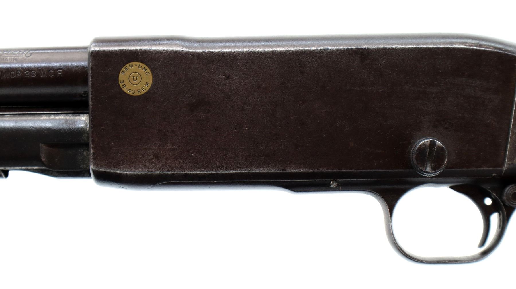 Main Description: Blade front sight, original adjustable u notched rear sight. Two piece wood stocks, grooved forearm, straight grip which is chipped, cracked and loose behind receiver, checkered steel butt plate.