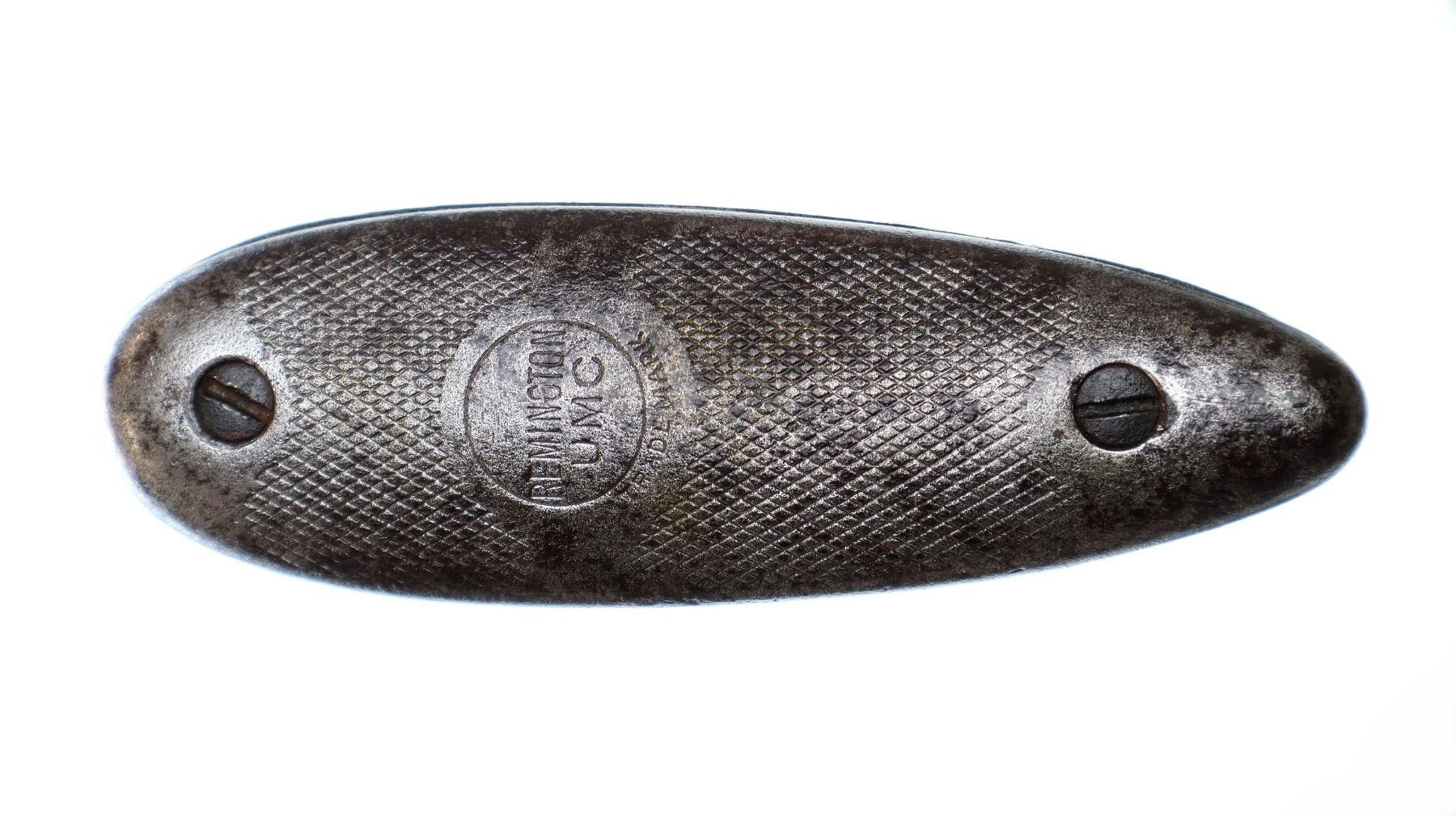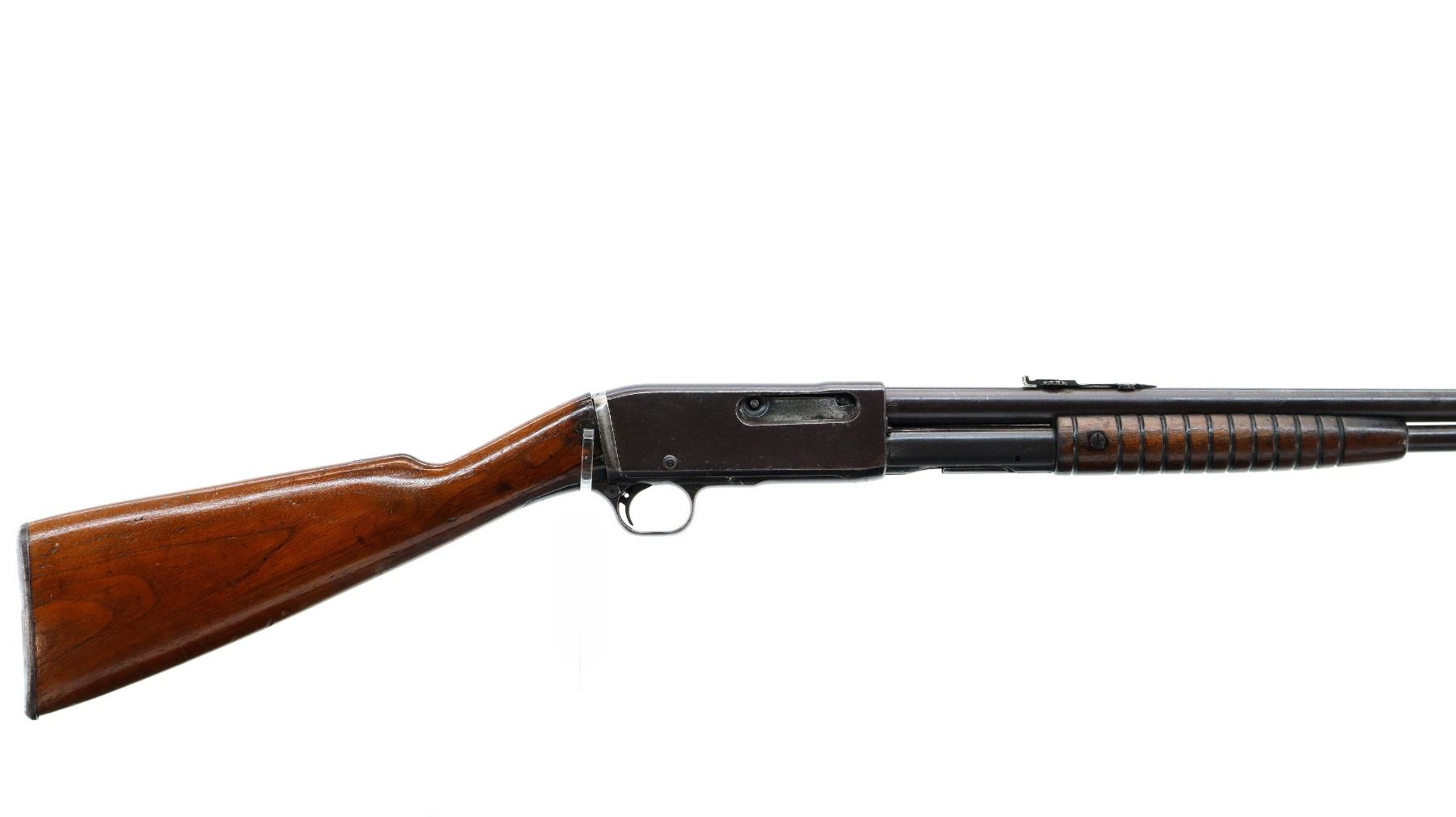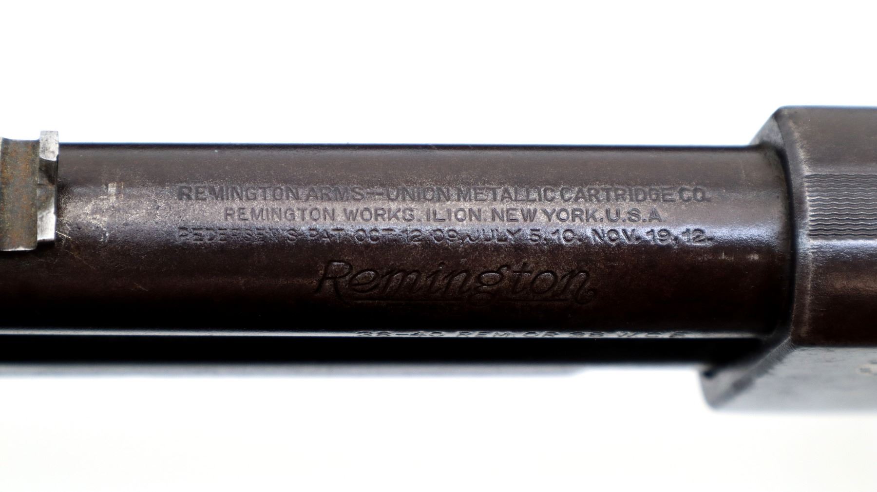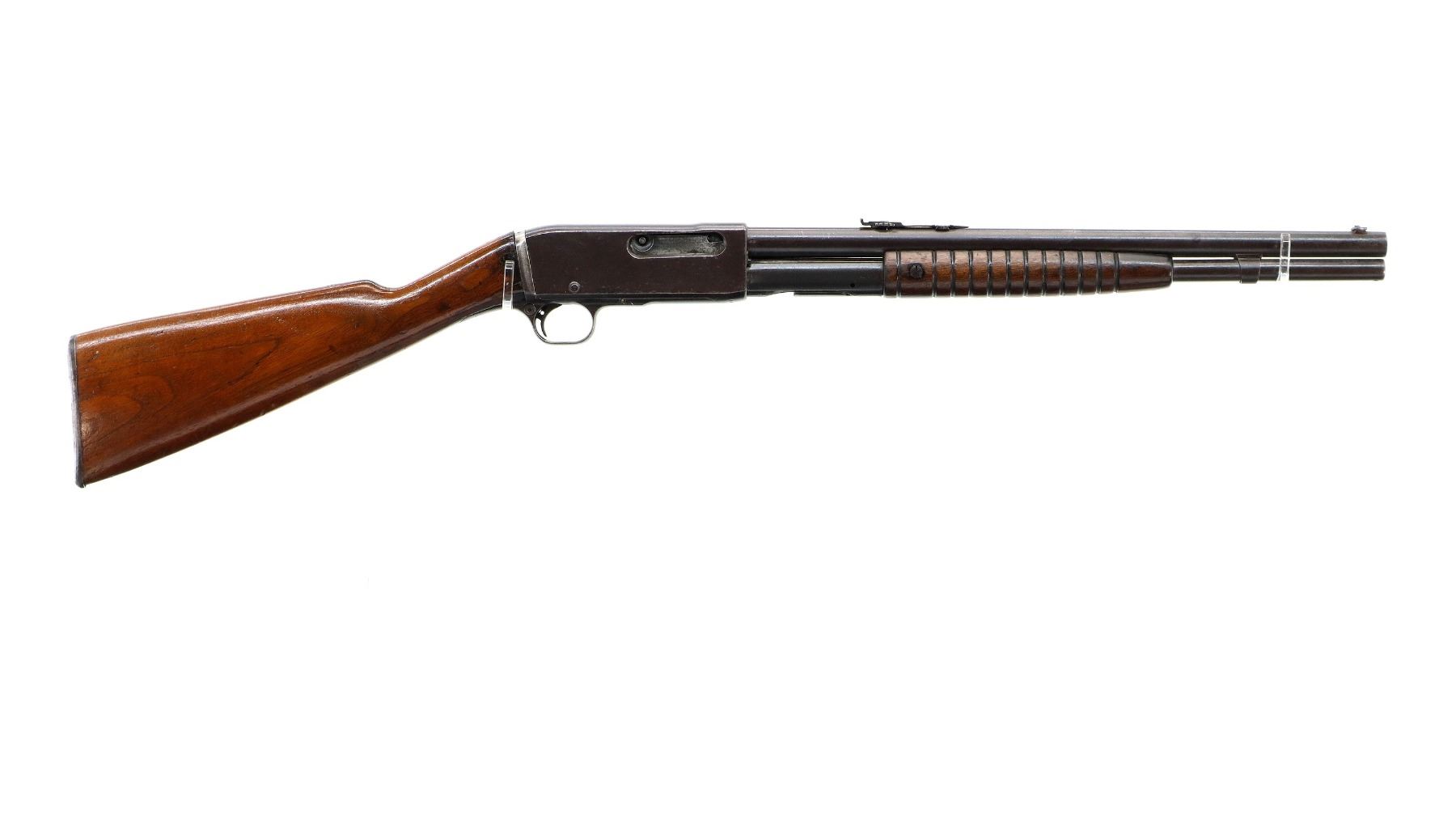 Main Description: Blade front sight, original adjustable u notched rear sight. Two piece wood stocks, grooved forearm, straight grip which is chipped, cracked and loose behind receiver, checkered steel butt plate.