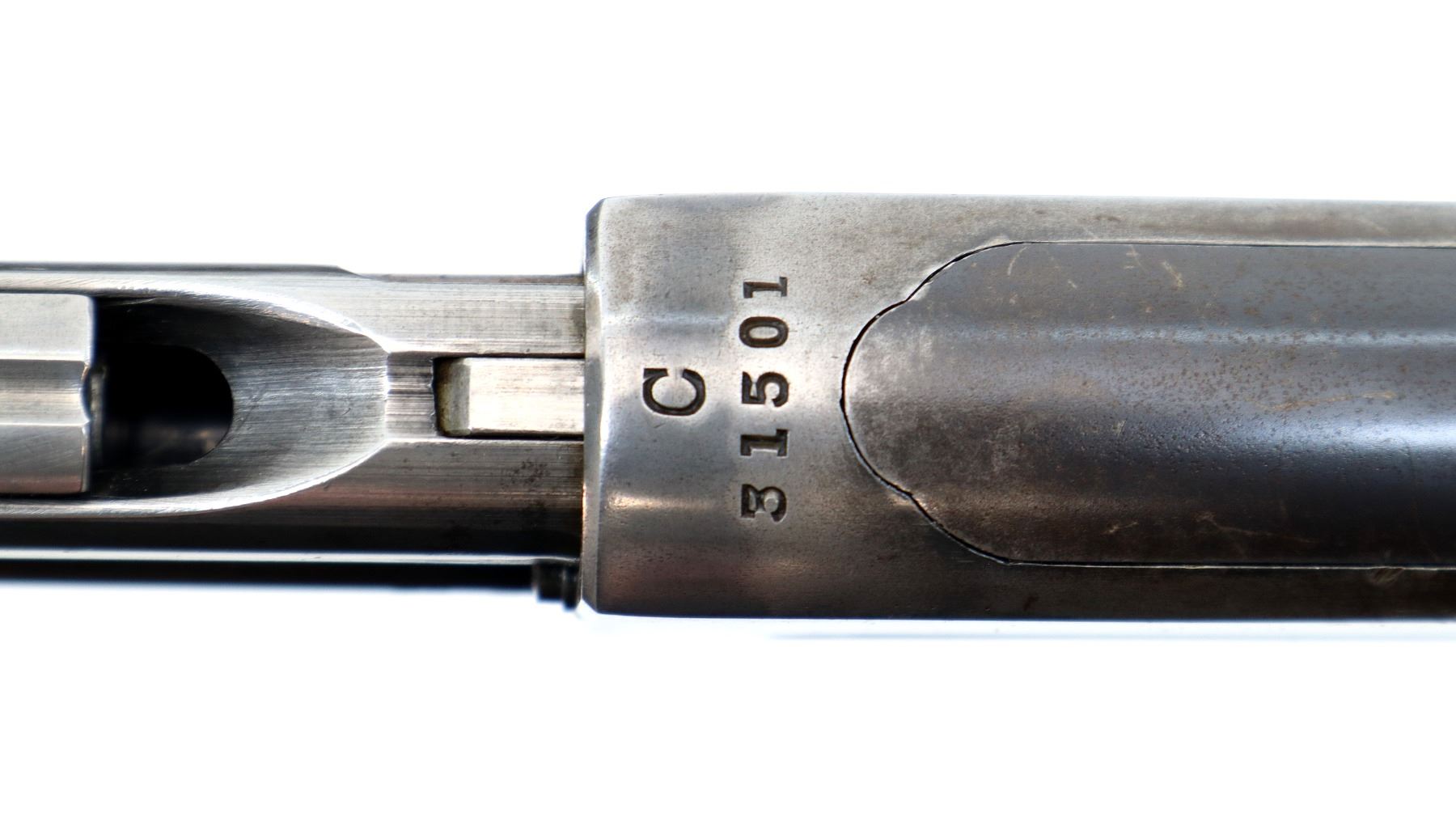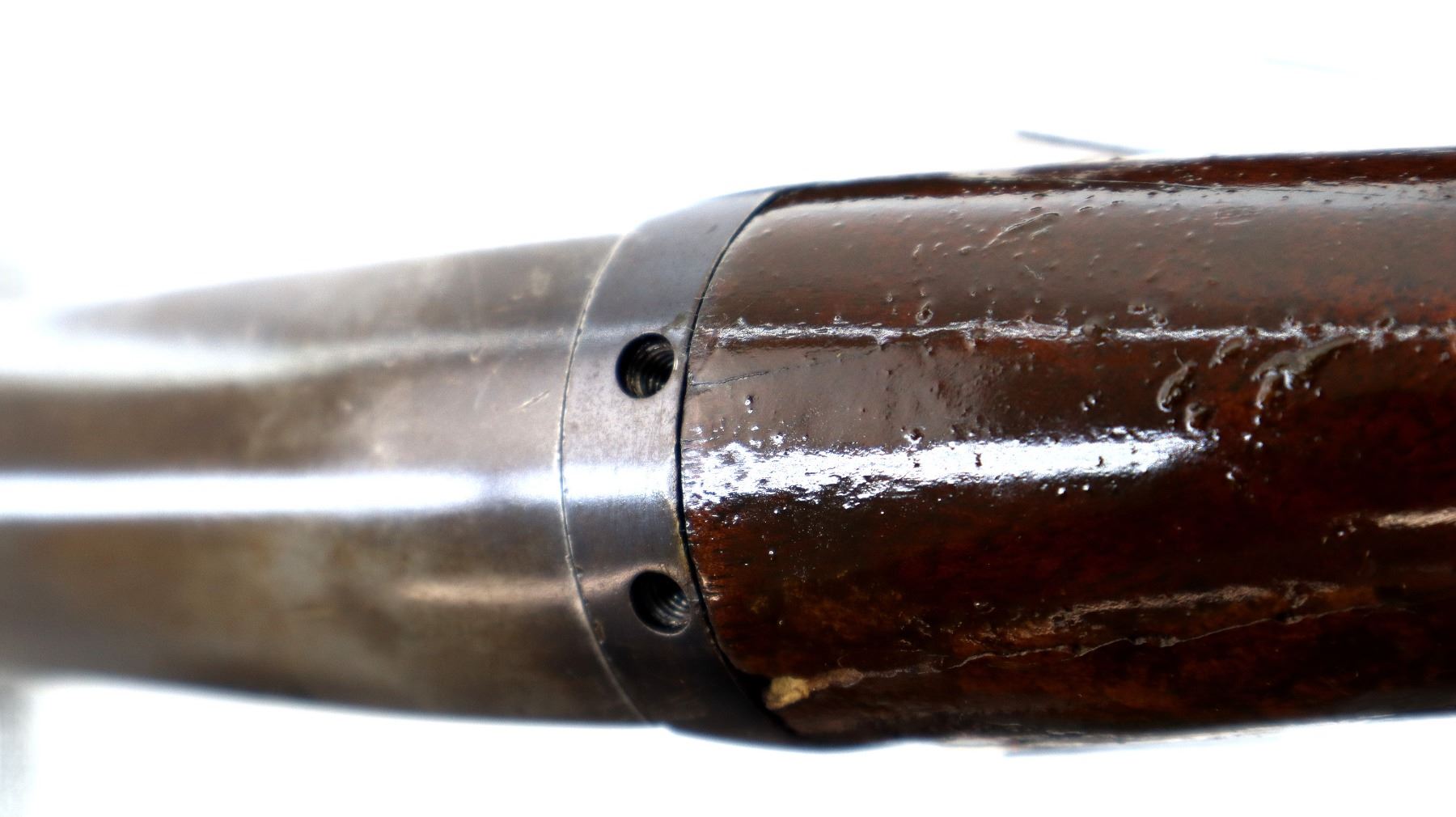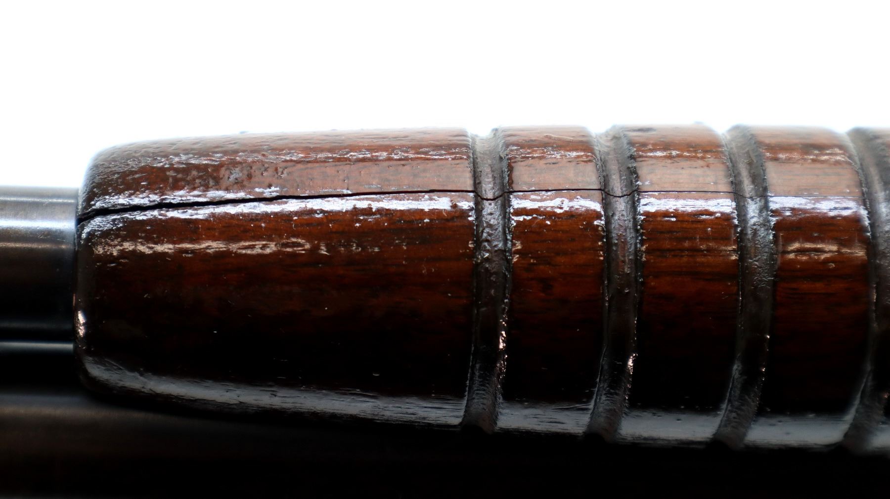 Main Description: This rifle has Crossed Flags with DCP on the barrel indicating Dominion of Canada Possibly used for Prison of War Guards. Blade front sight, missing rear sight dovetails present, blued finish, receiver missing plug screws. Two piece wood stocks, grooved forearm, pistol grip, chipped and cracked behind receiver, checkered silver alloy butt plate, full length magtube.