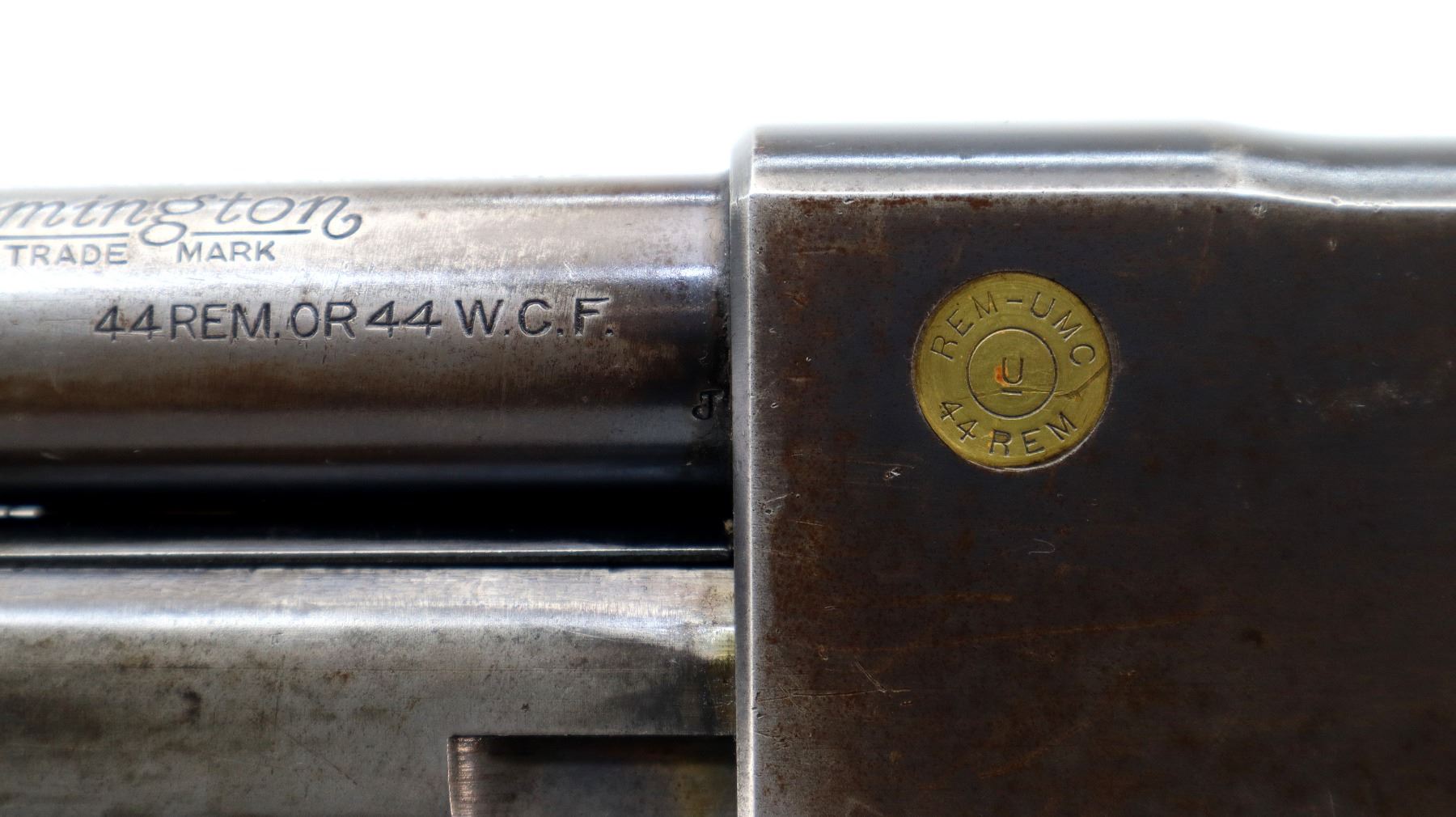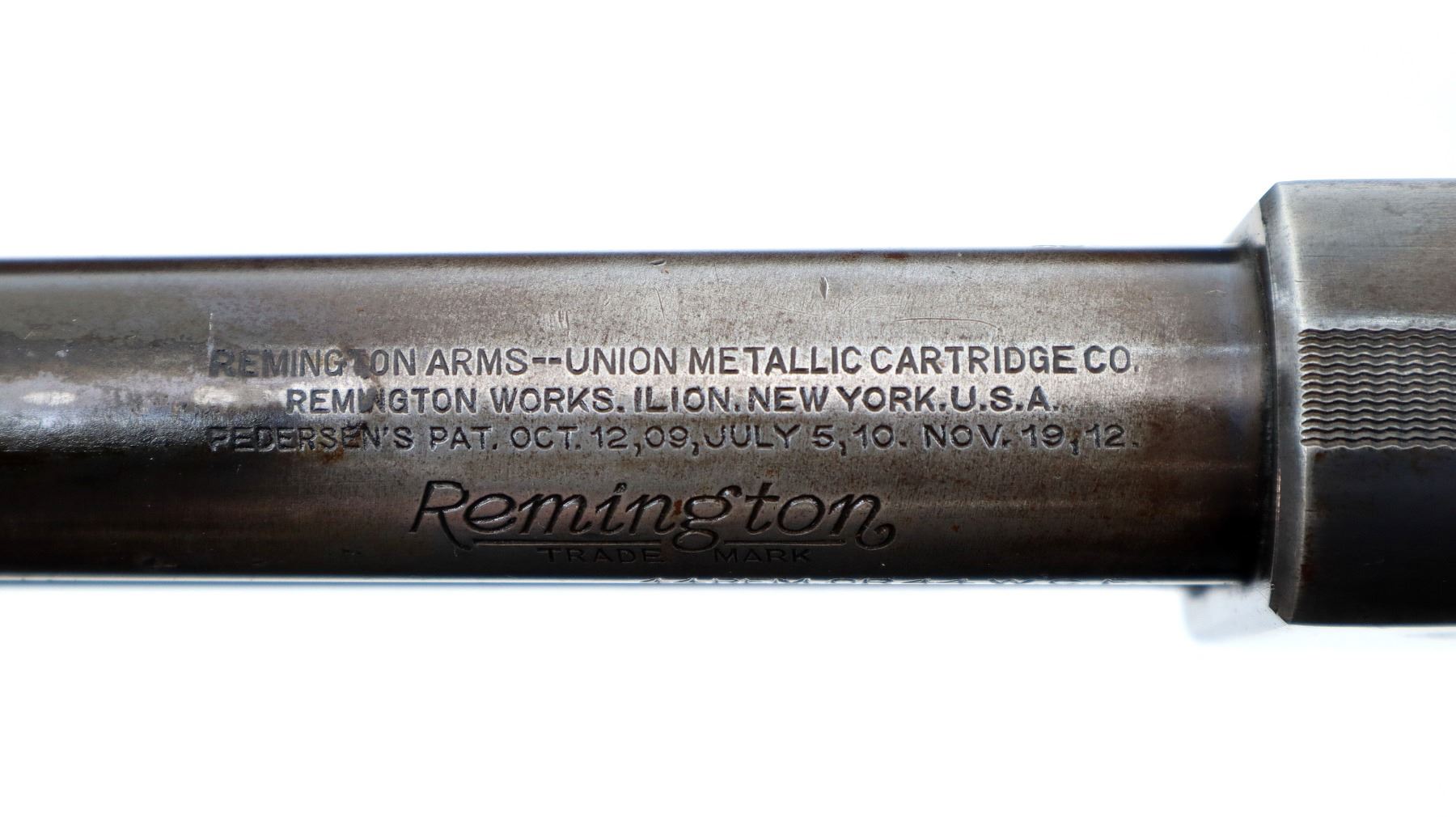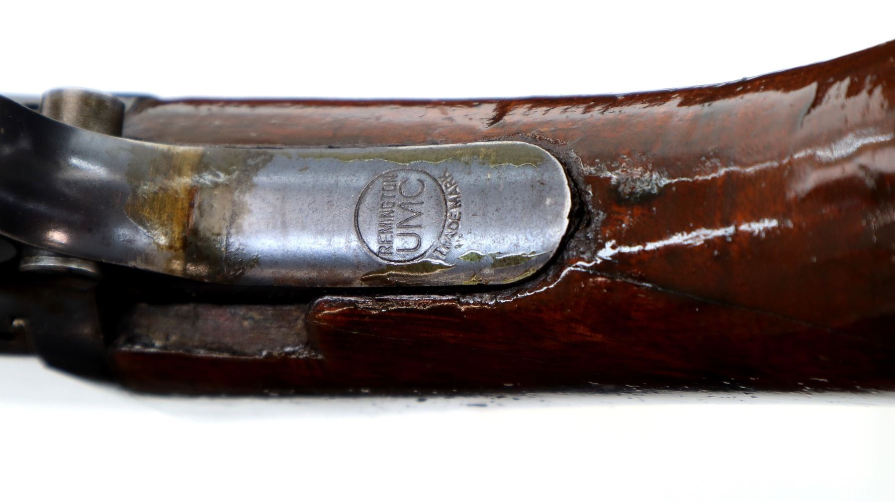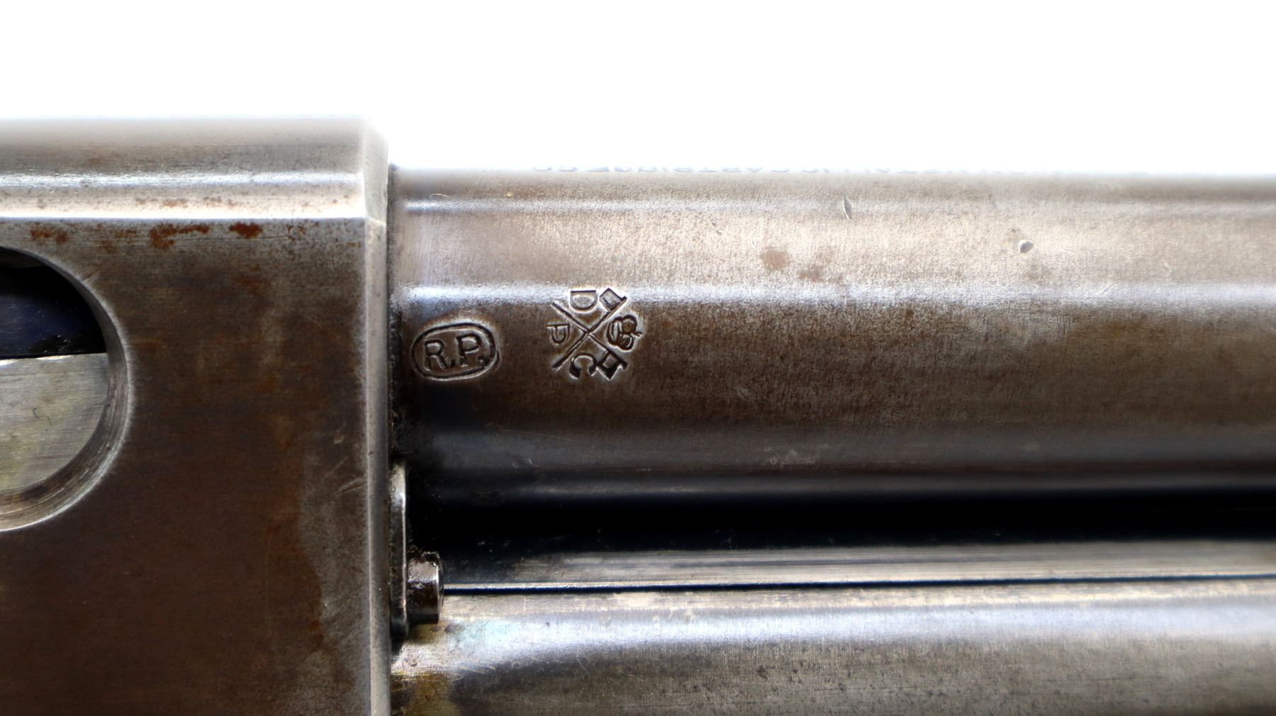 Main Description: This rifle has Crossed Flags with DCP on the barrel indicating Dominion of Canada Possibly used for Prison of War Guards. Blade front sight, missing rear sight dovetails present, blued finish, receiver missing plug screws. Two piece wood stocks, grooved forearm, pistol grip, chipped and cracked behind receiver, checkered silver alloy butt plate, full length magtube.