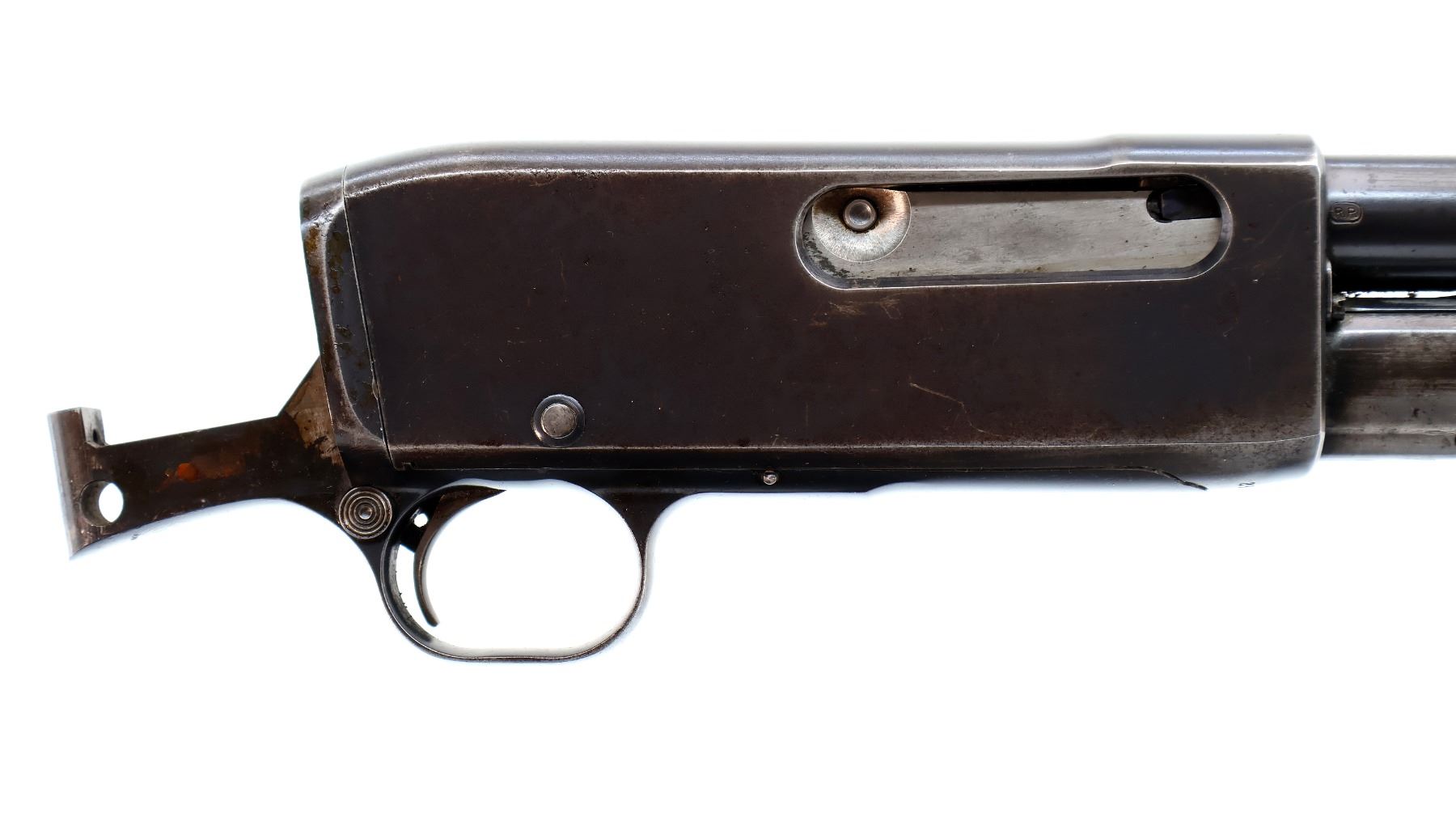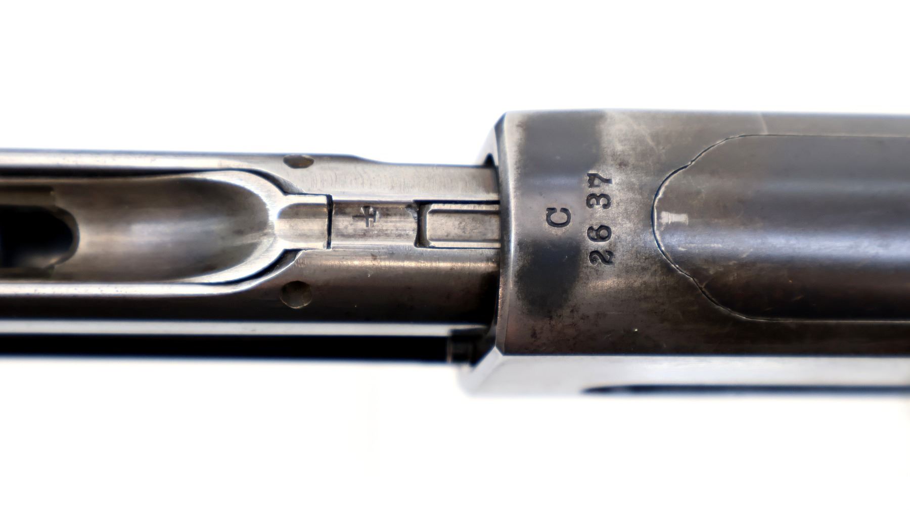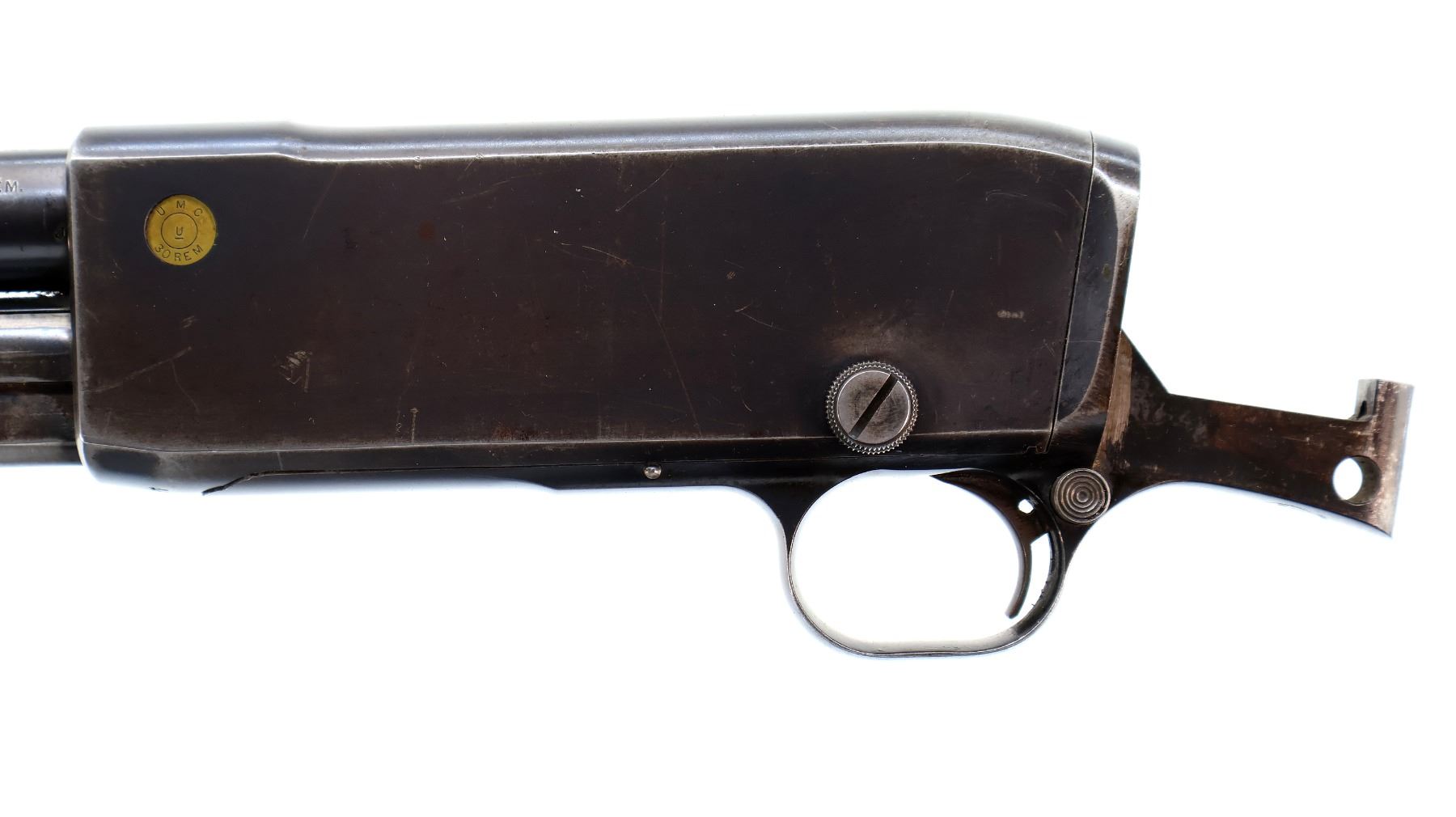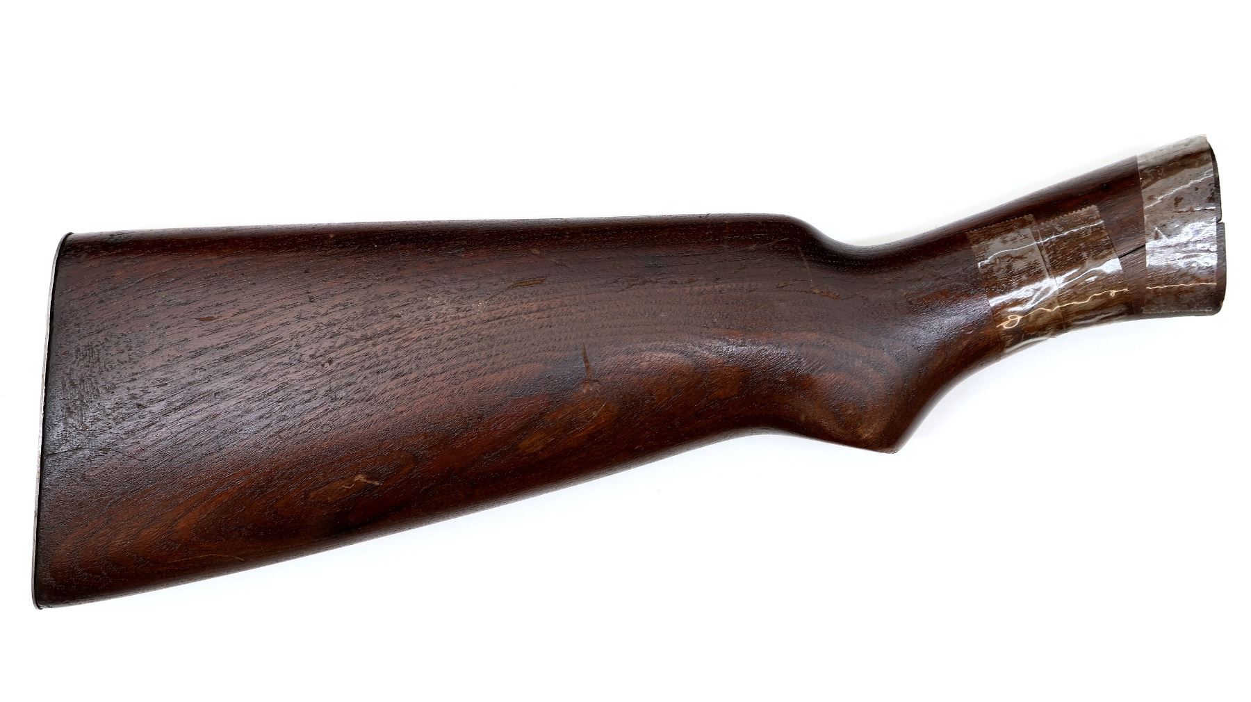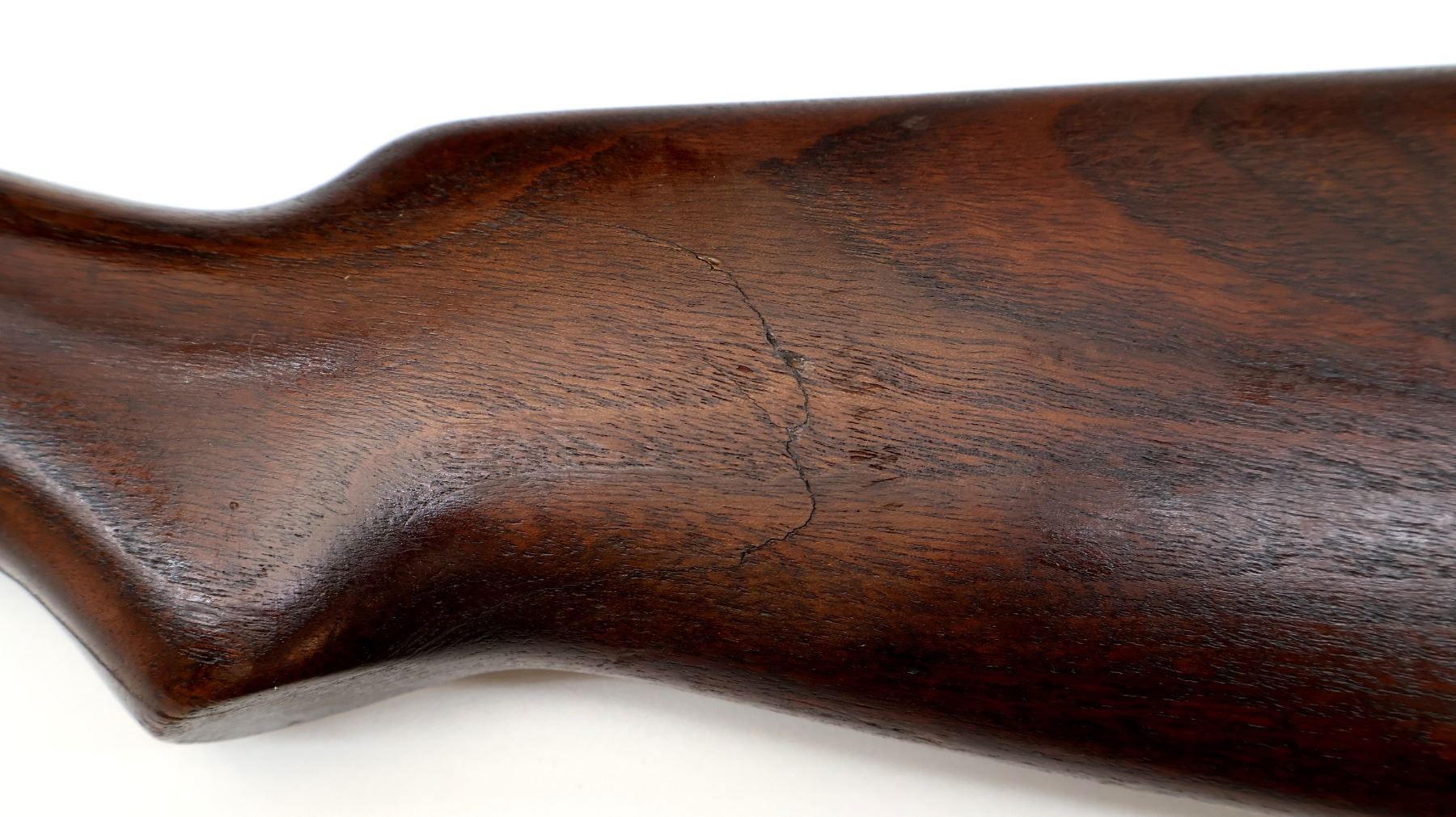 Main Description: Blade front sight with ramp, original adjustable u notched rear sight, blued finish. Two piece wood stocks, grooved forearm, pistol grip butt stock which is chipped and cracked not attached to the receiver, smooth steel butt plate, has the stock bolt, 3/4 length magtube.
