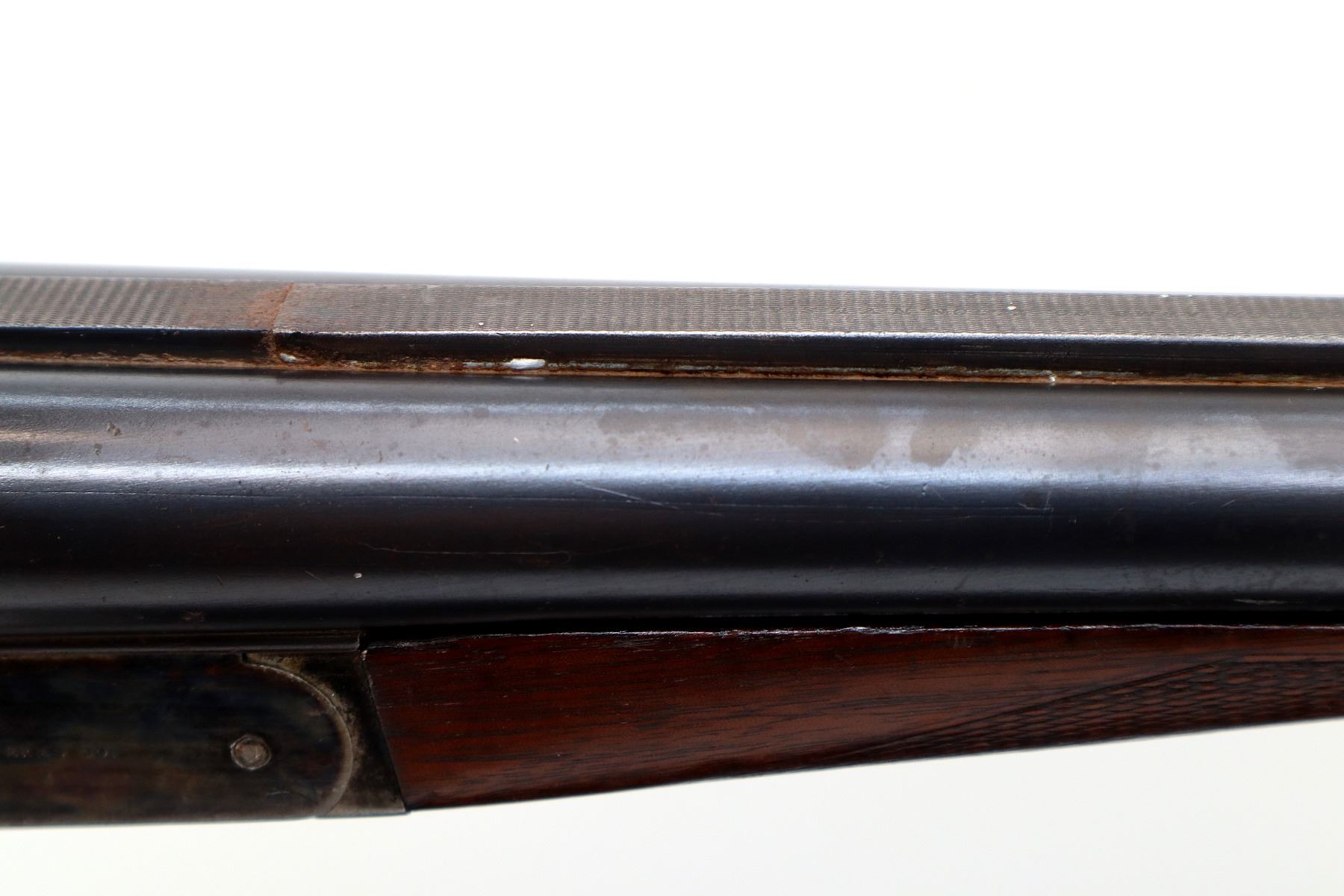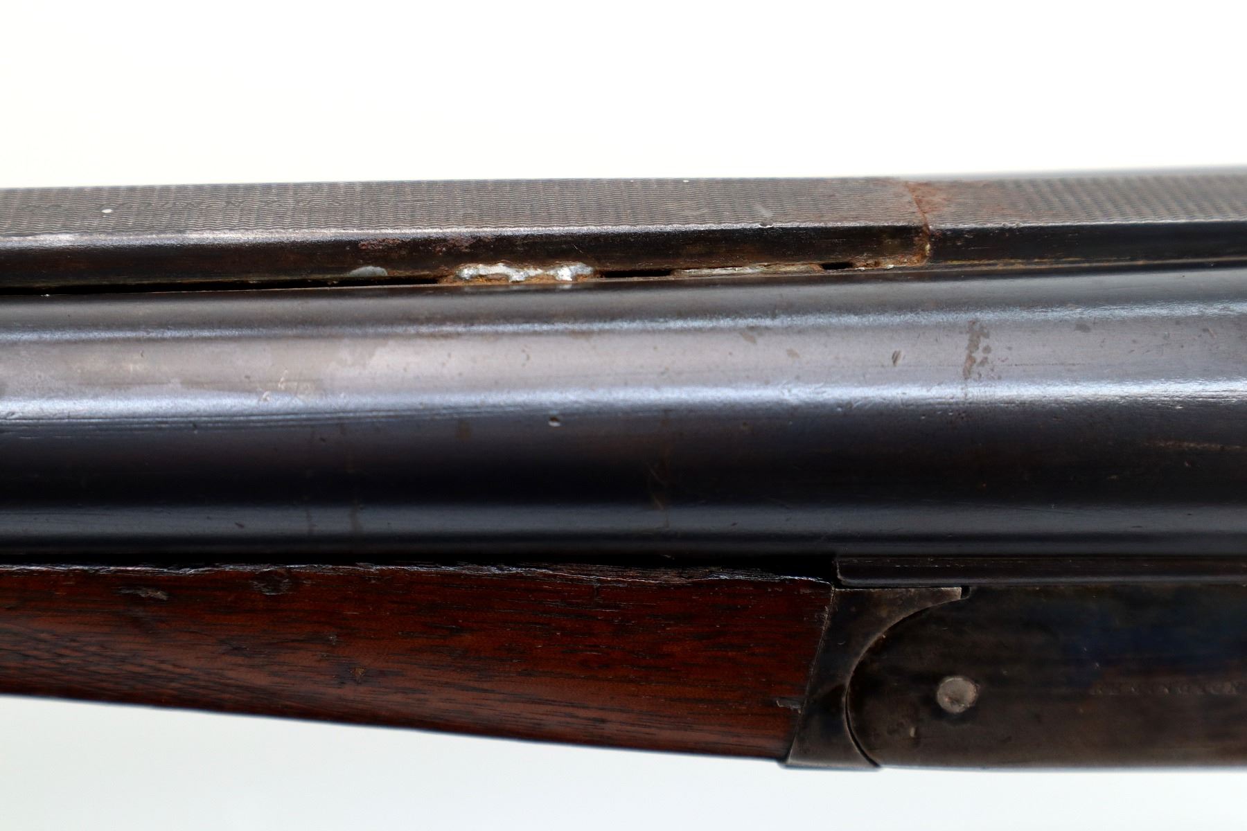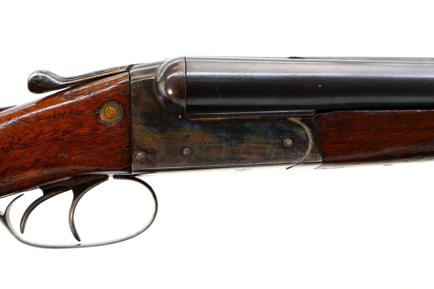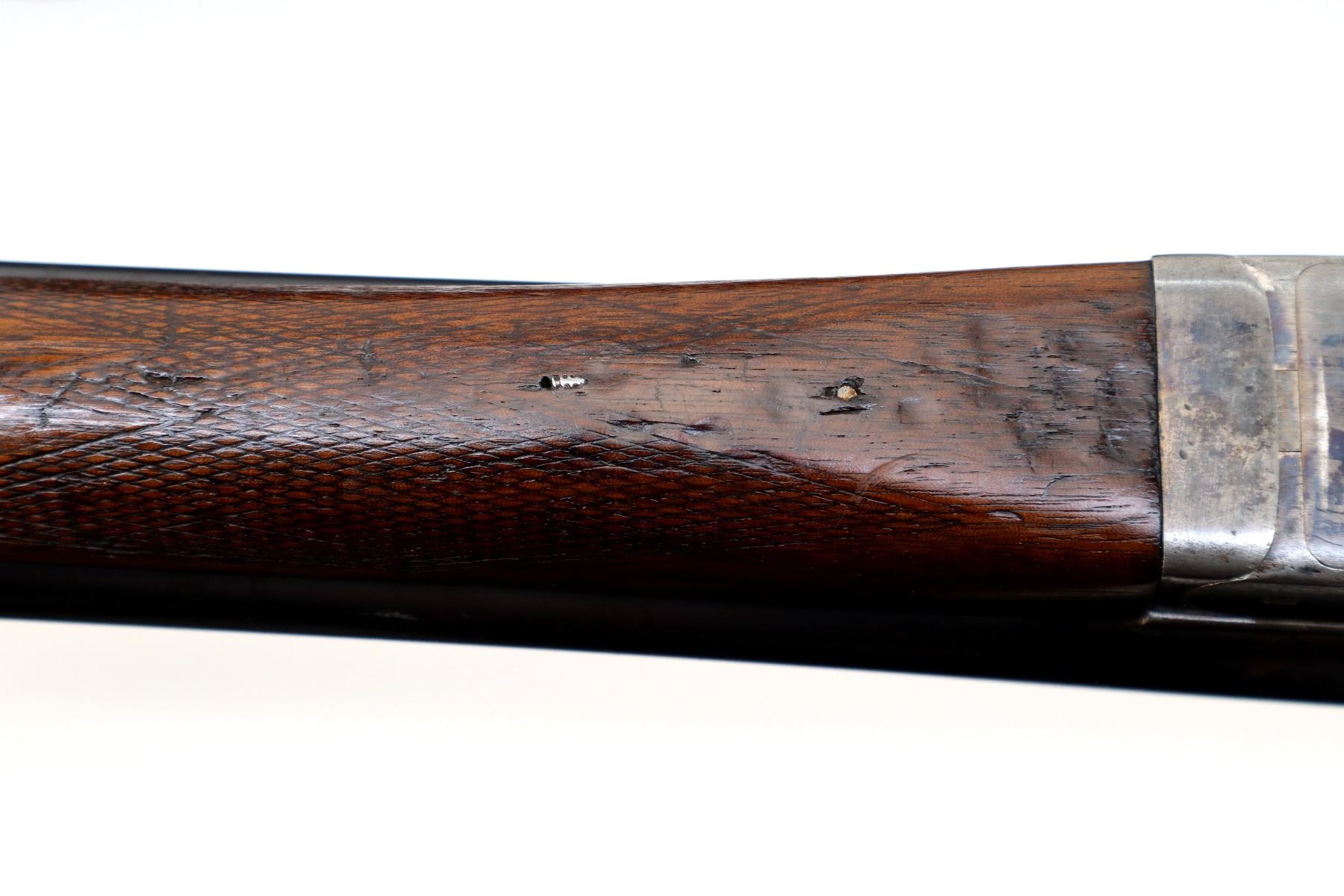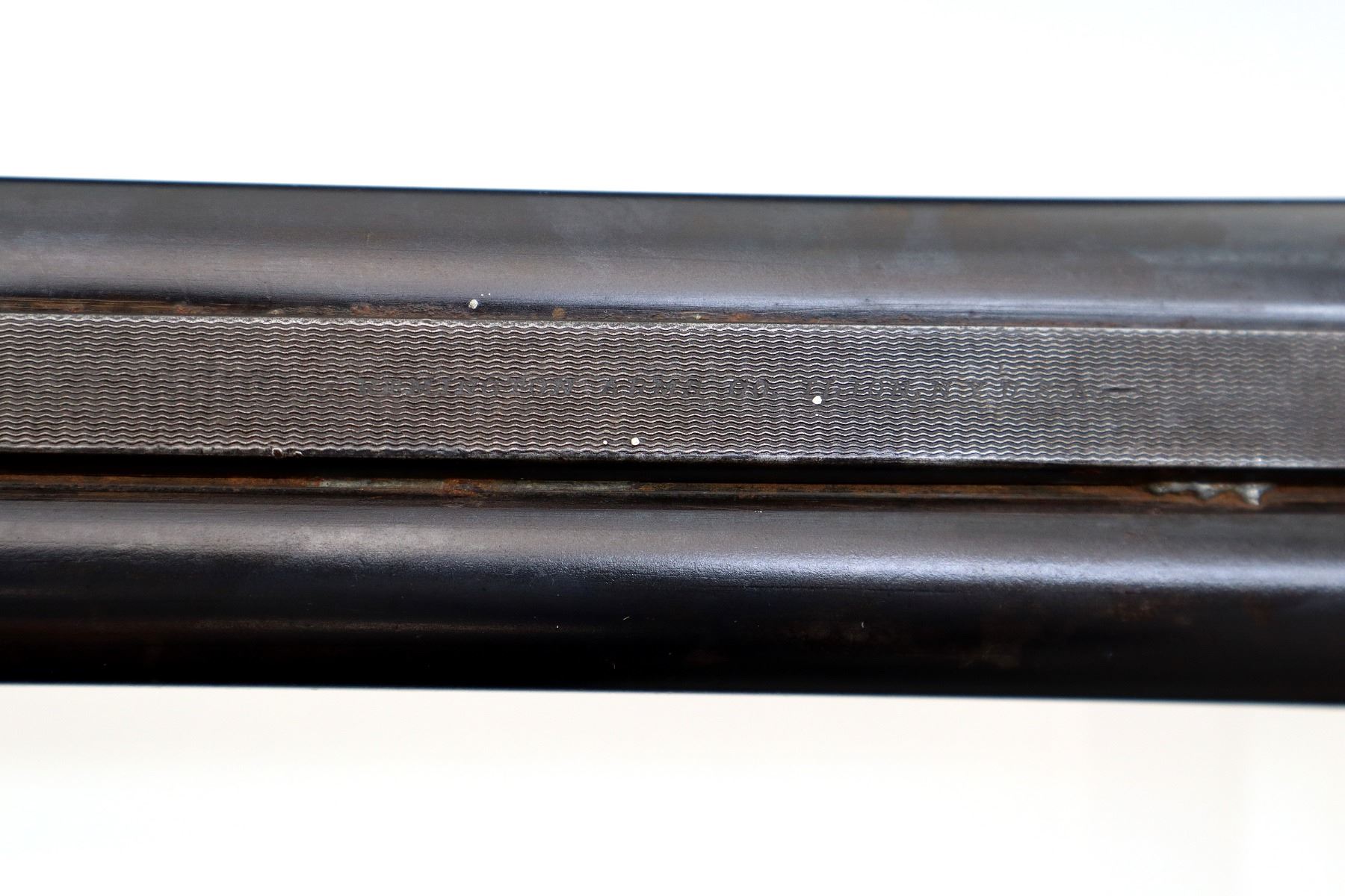 Main Description: silver bead, blued barrels with raised rib that is coming loose and shows a gap, automatic safety, extractor, double triggers. Two piece wood stocks, checkered forearm which is cracked, checkered pistol grip and black polymer butt plate, stock chipped cracked and repaired behind receiver, plate and stock chipped at toe, sling swivels.